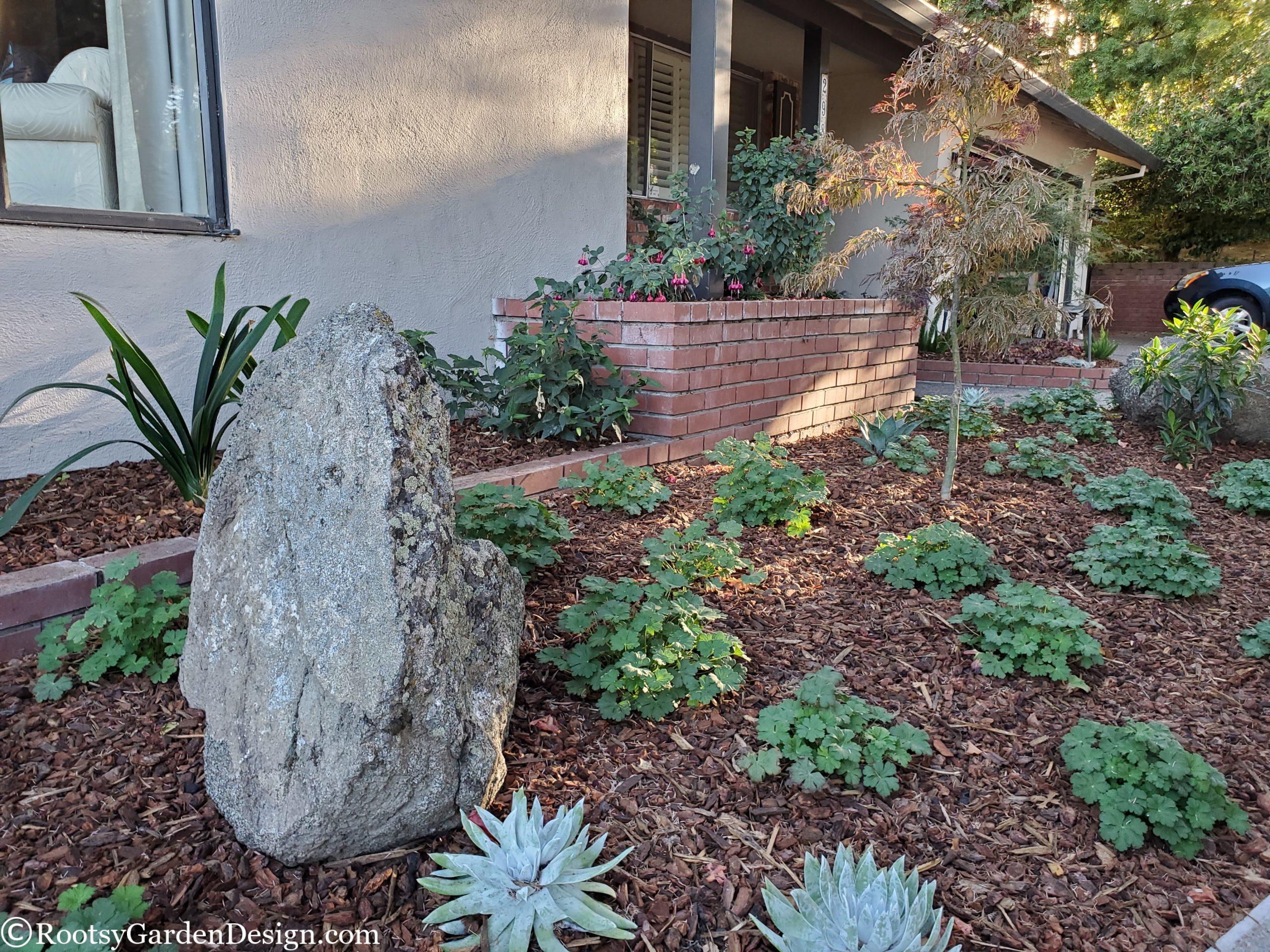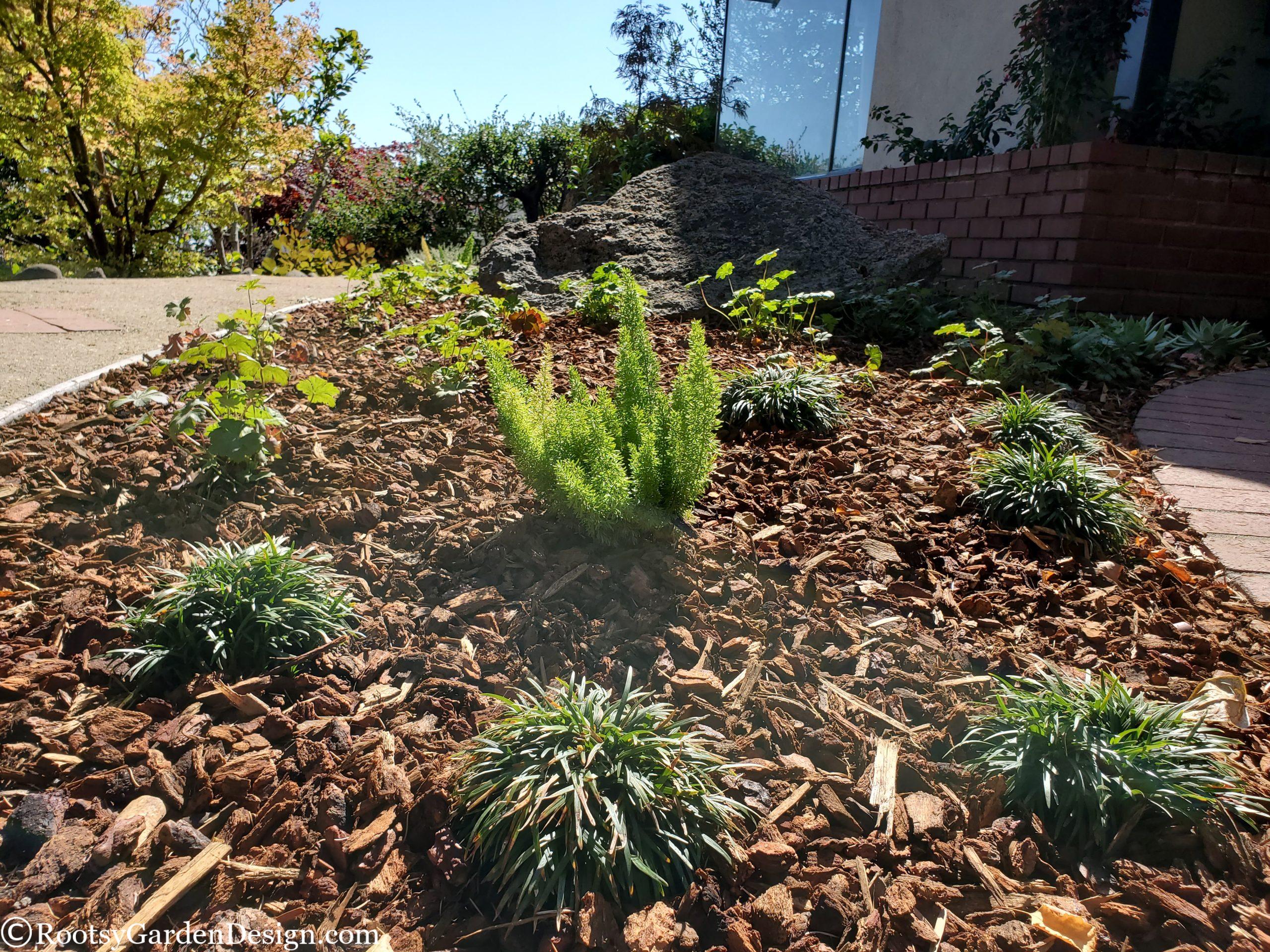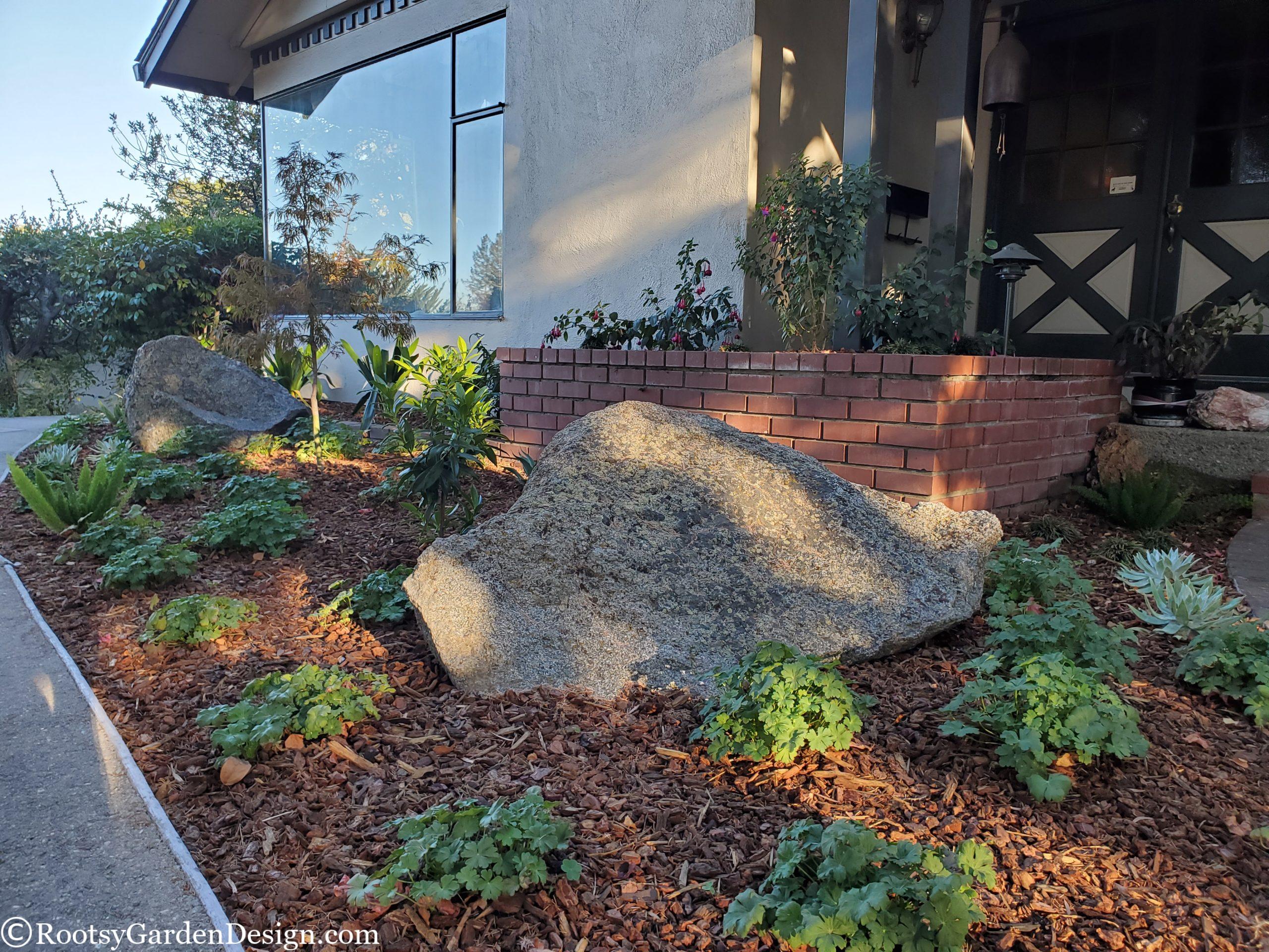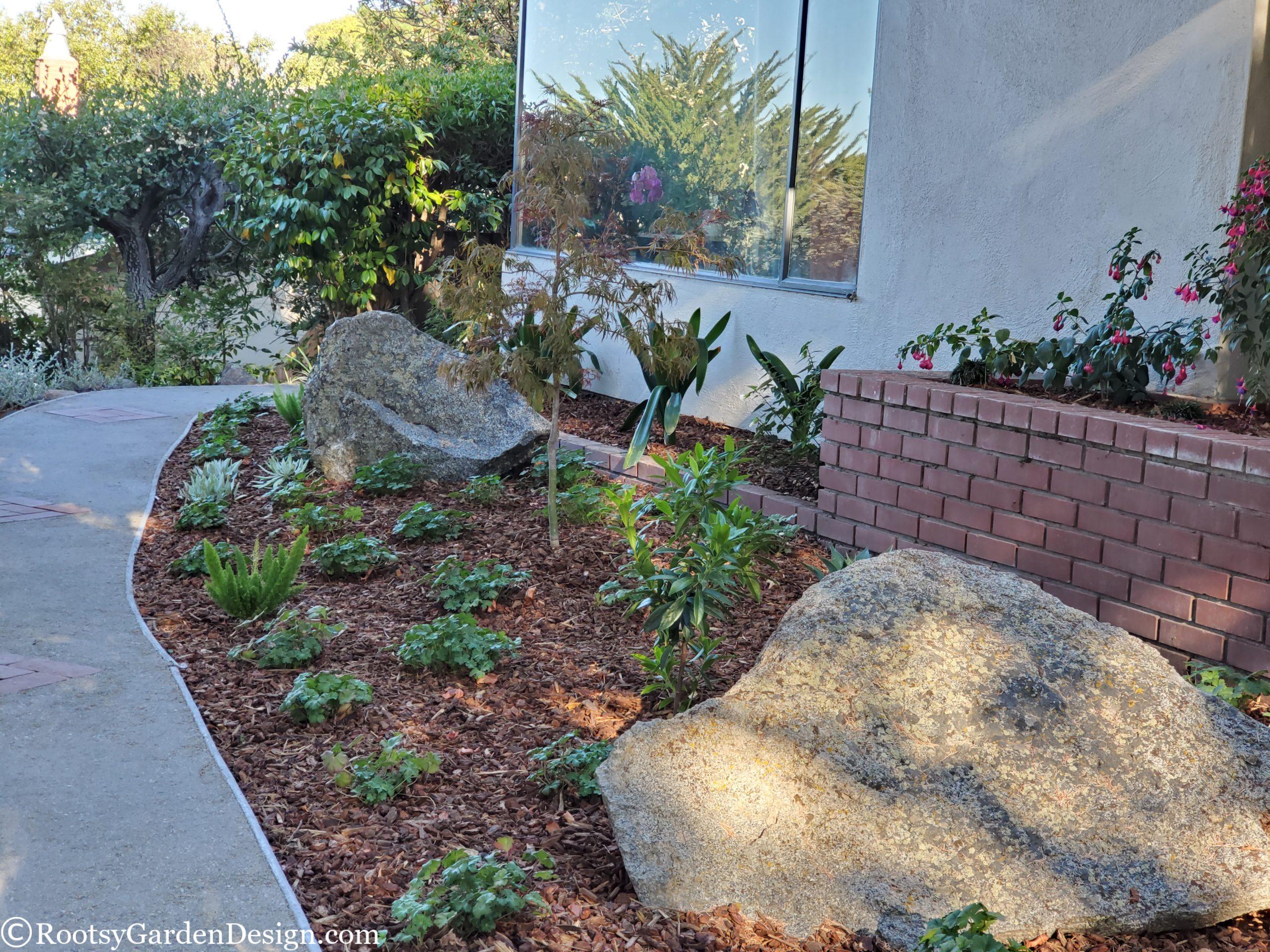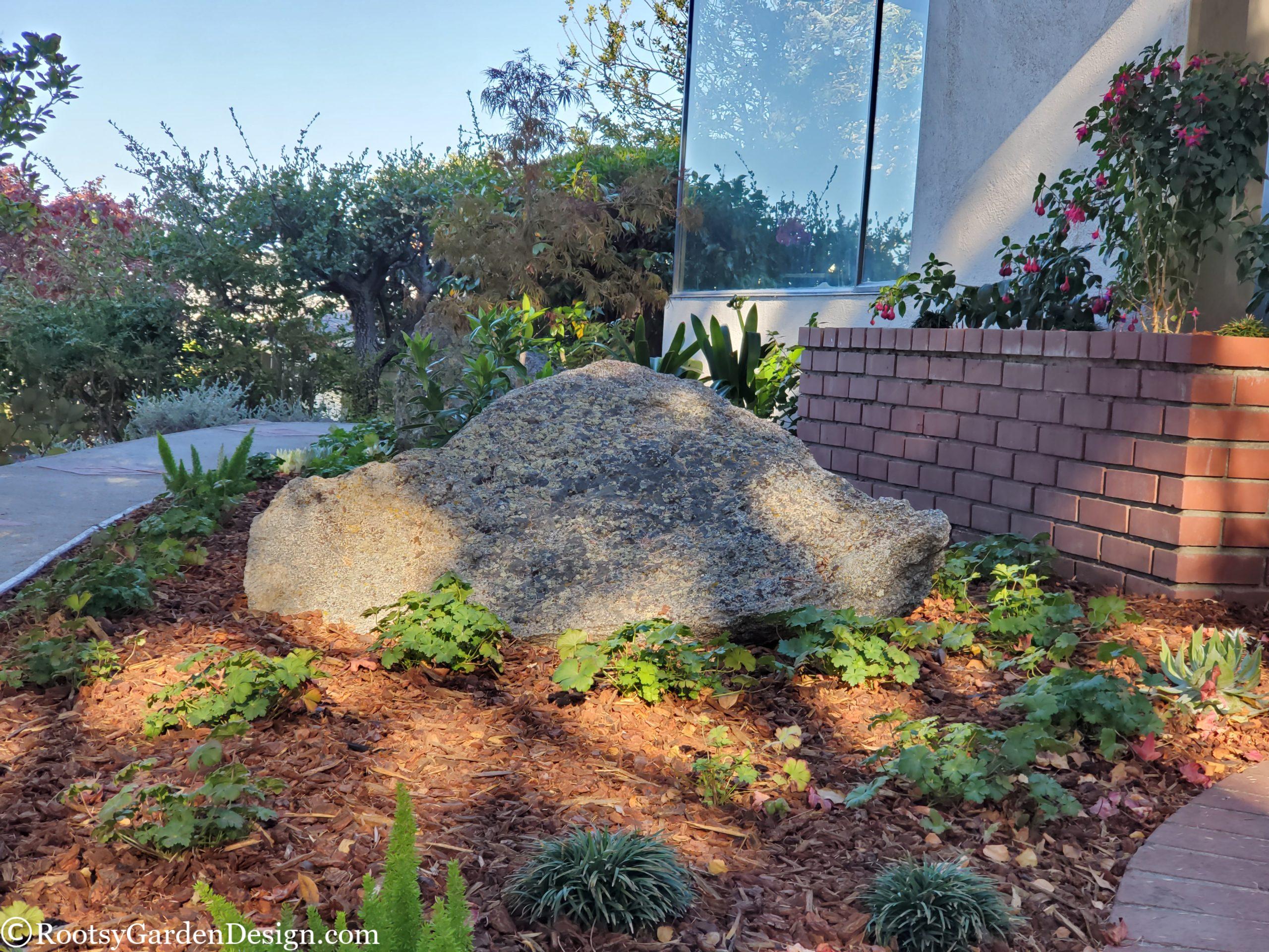 In preparation for her 95th birthday party, our client requested a plant refresh in her front yard garden. This very shady space was lacking color and was suffering from hydrophobic soil covered in plastic weed barrier. We amended the soil, installed more efficient irrigation, and replaced the plastic with a healthy layer of wood mulch to naturally minimize weeds, help retain moisture, and condition the soil. We didn’t modify any of the existing hardscape, but did bring in some beautiful boulders to enhance year-round interest. We selected shade loving plants with interesting foliage and varied bloom times to ensure our client will find color and interest every time she looks out the window.