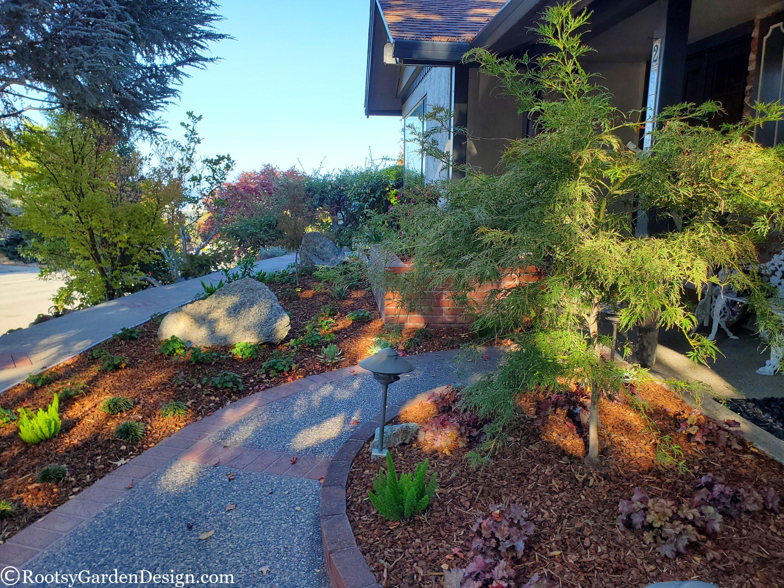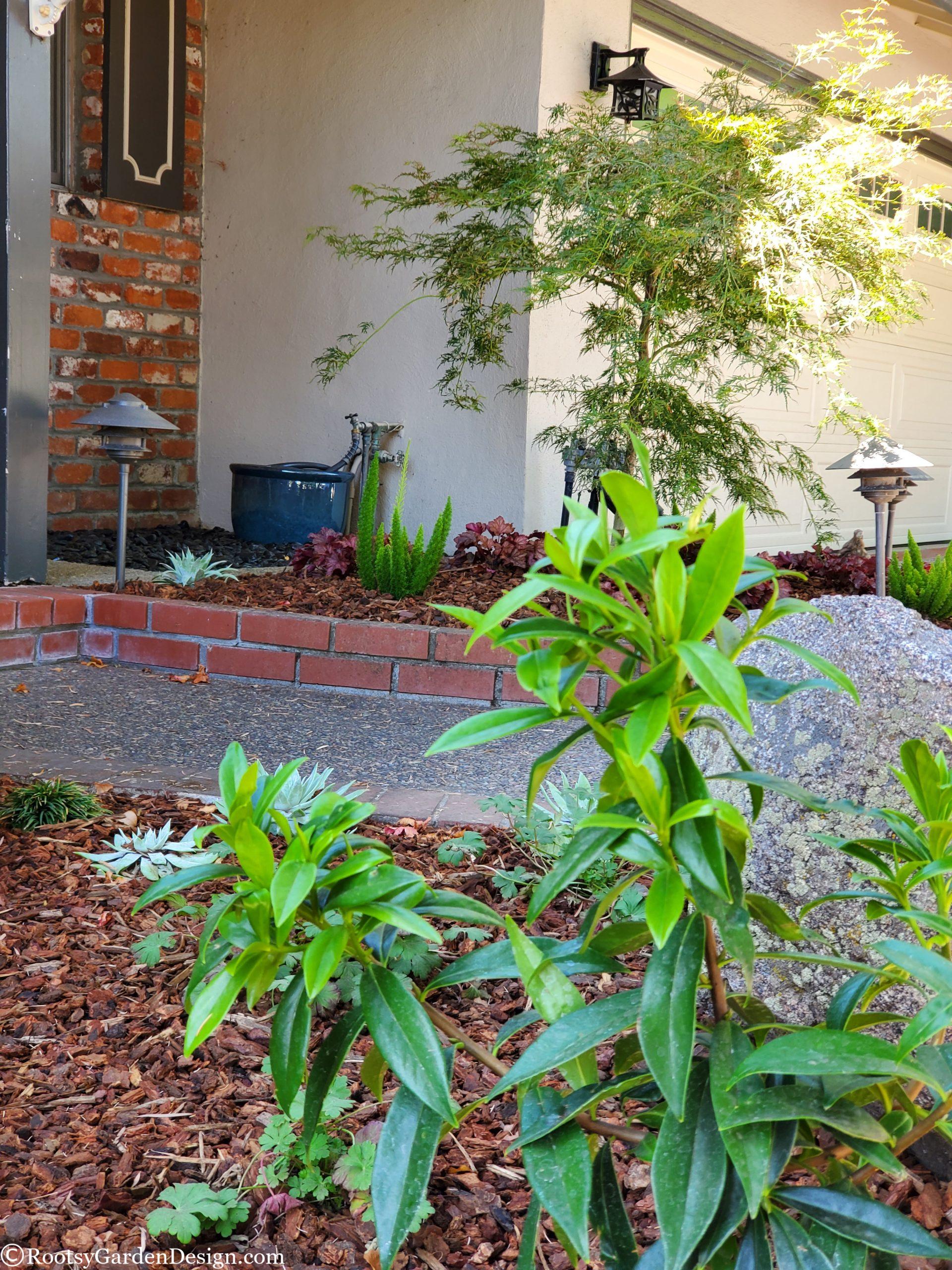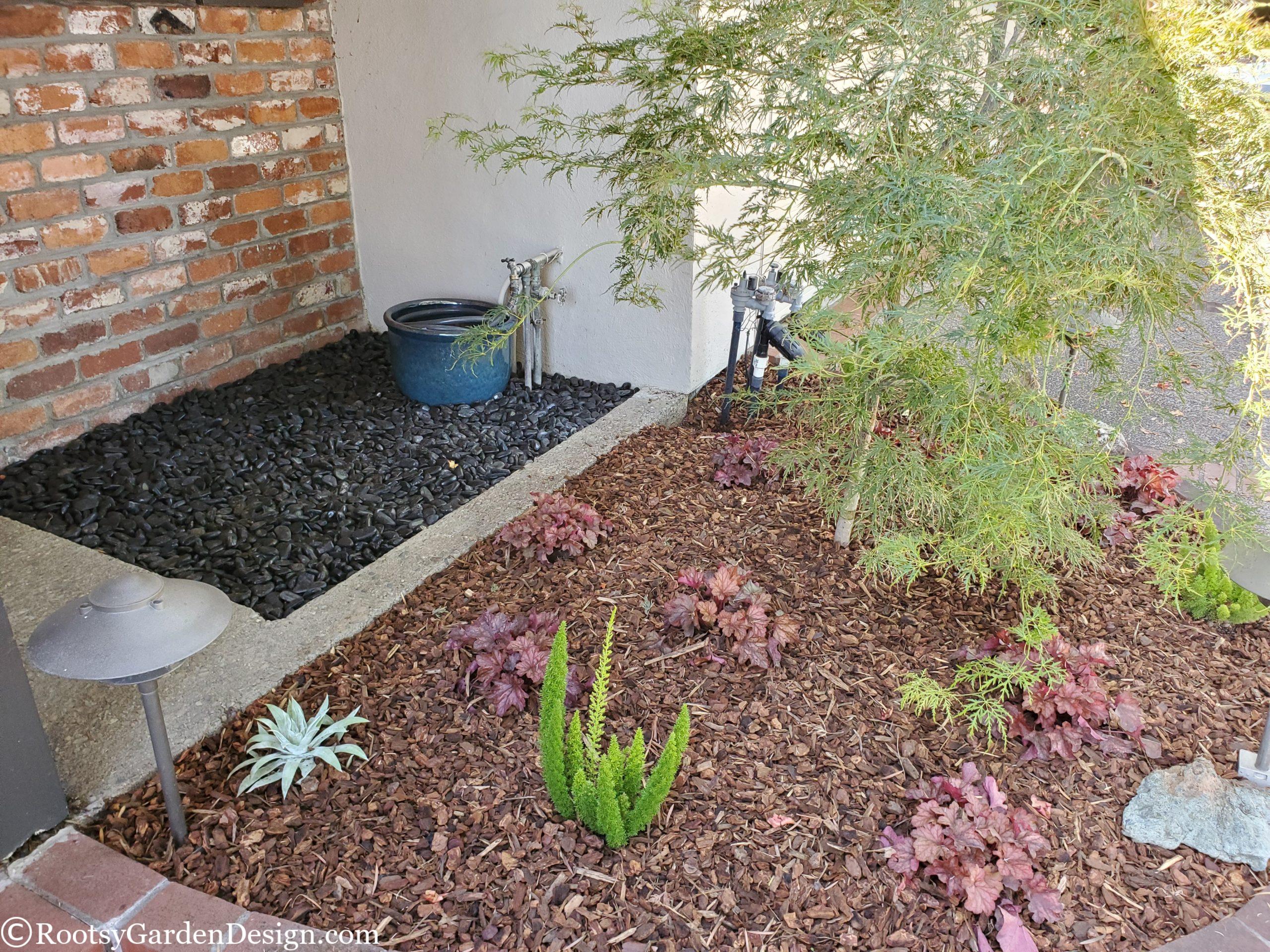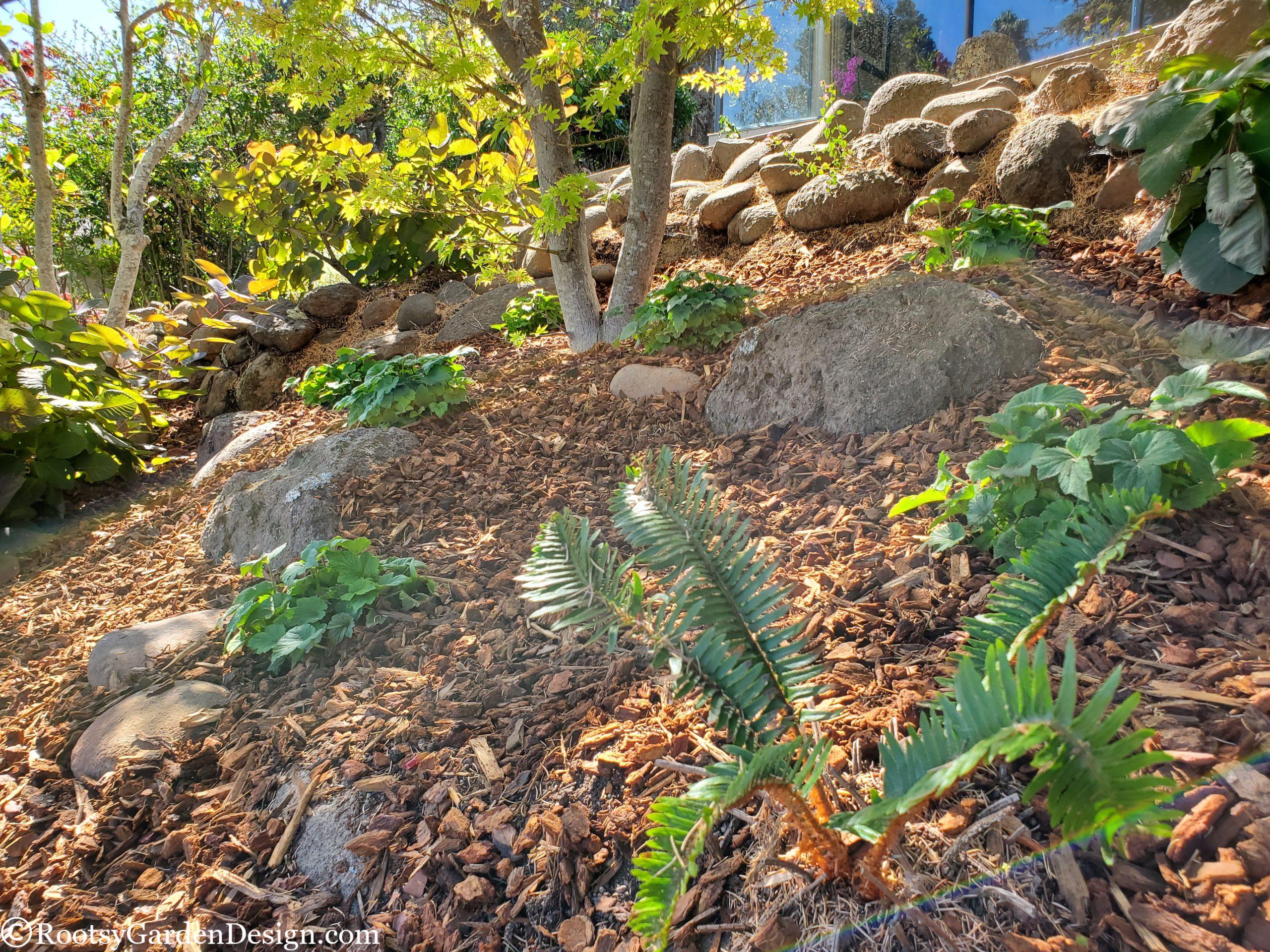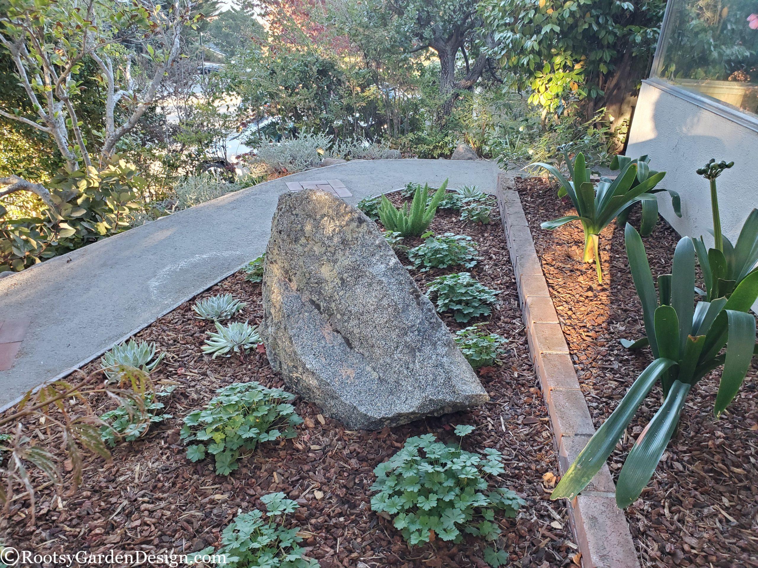 In preparation for her 95th birthday party, our client requested a plant refresh in her front yard garden. This very shady space was lacking color and was suffering from hydrophobic soil covered in plastic weed barrier. We amended the soil, installed more efficient irrigation, and replaced the plastic with a healthy layer of wood mulch to naturally minimize weeds, help retain moisture, and condition the soil. We didn’t modify any of the existing hardscape, but did bring in some beautiful boulders to enhance year-round interest. We selected shade loving plants with interesting foliage and varied bloom times to ensure our client will find color and interest every time she looks out the window.