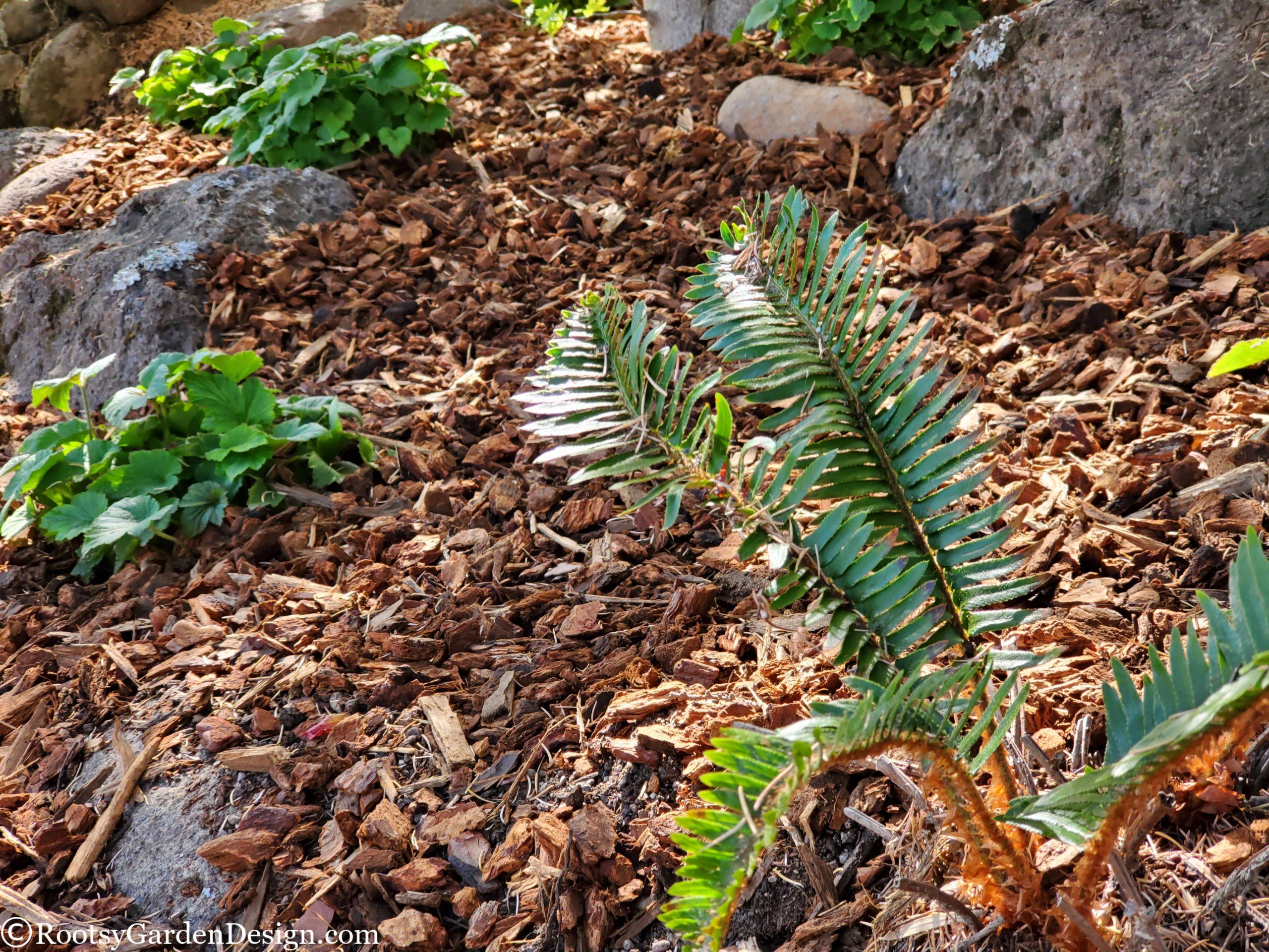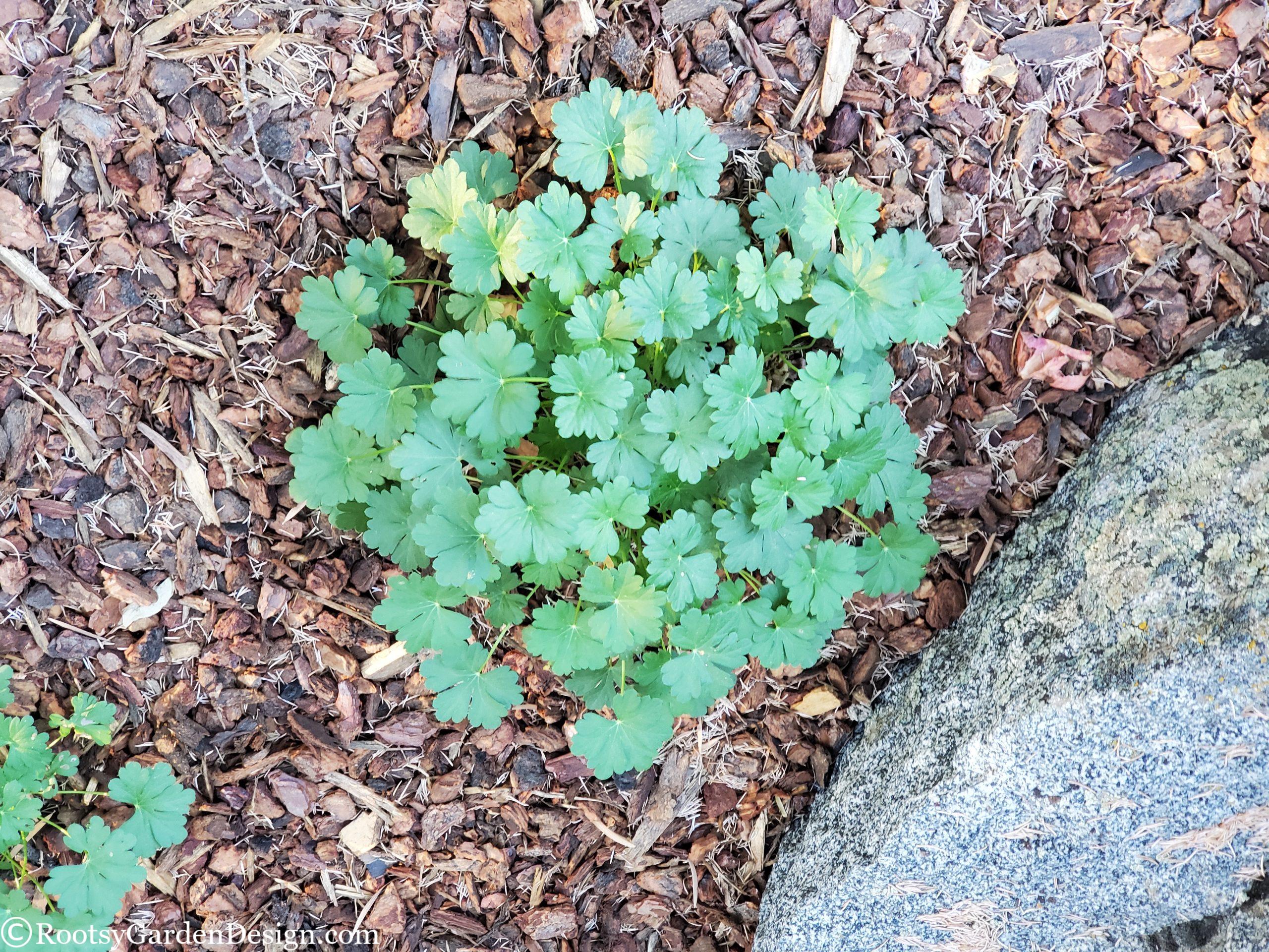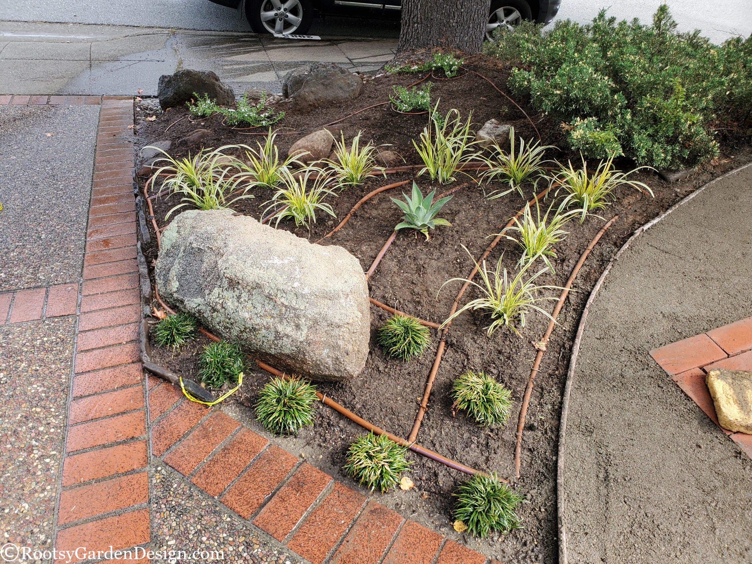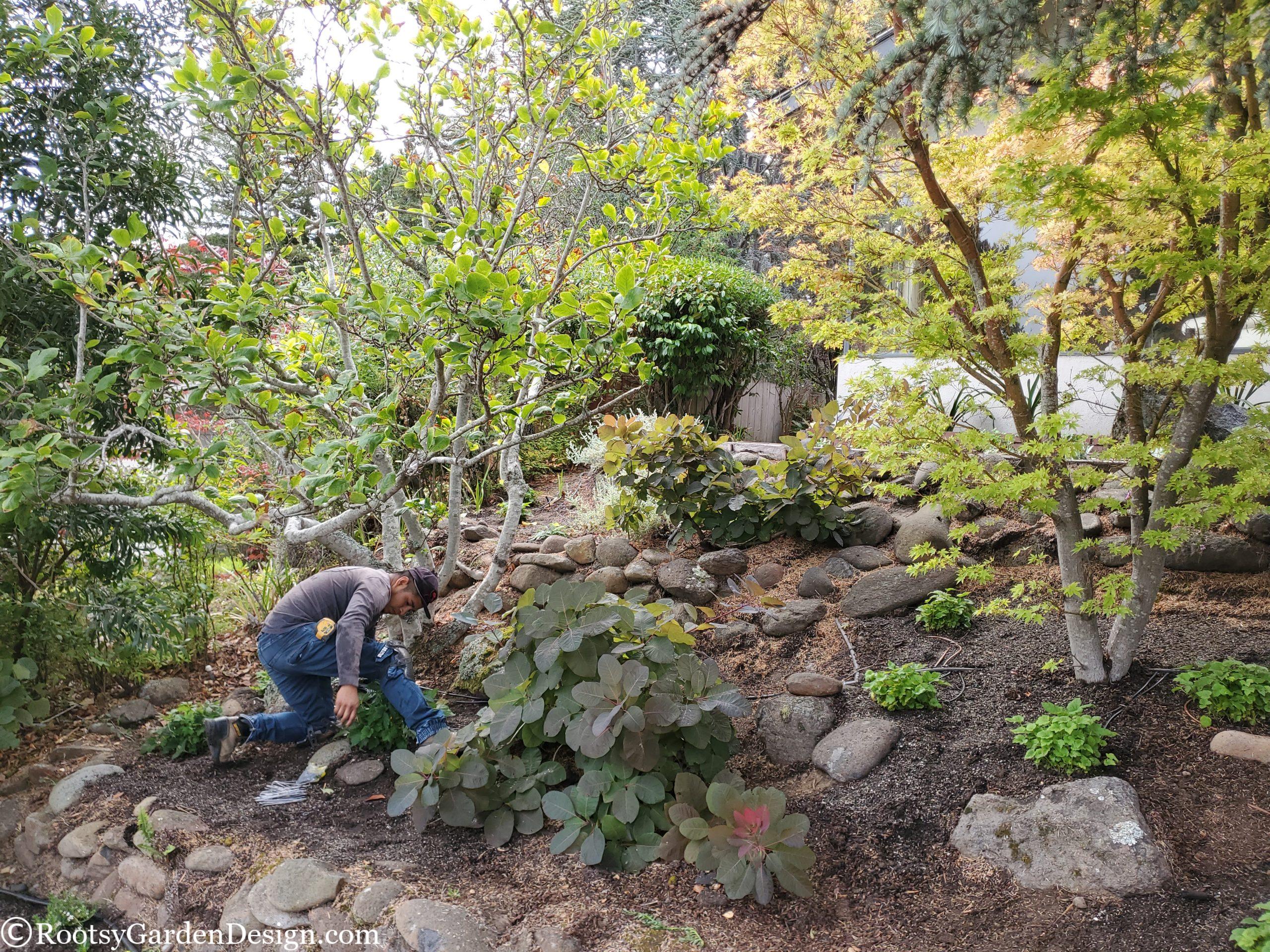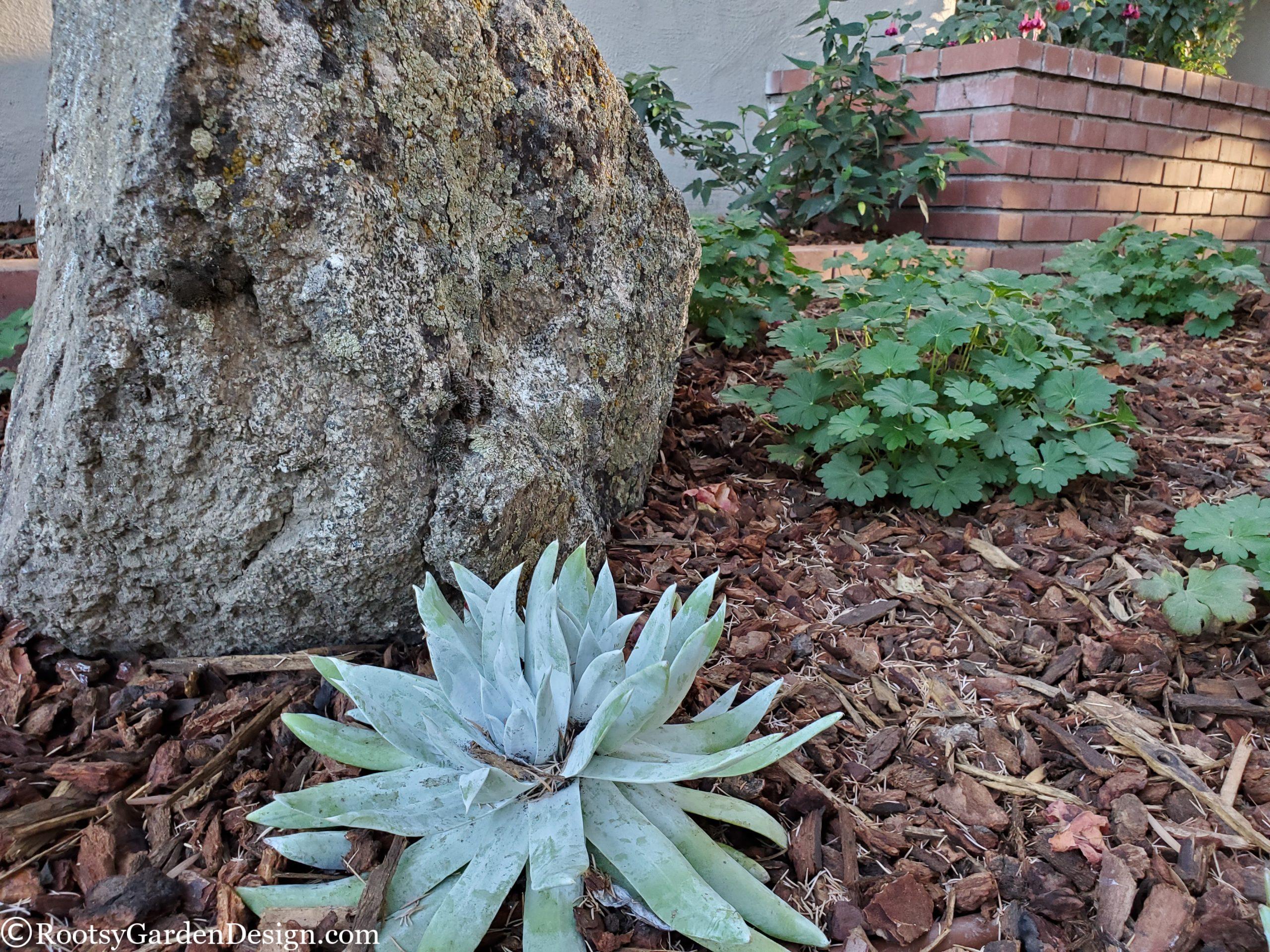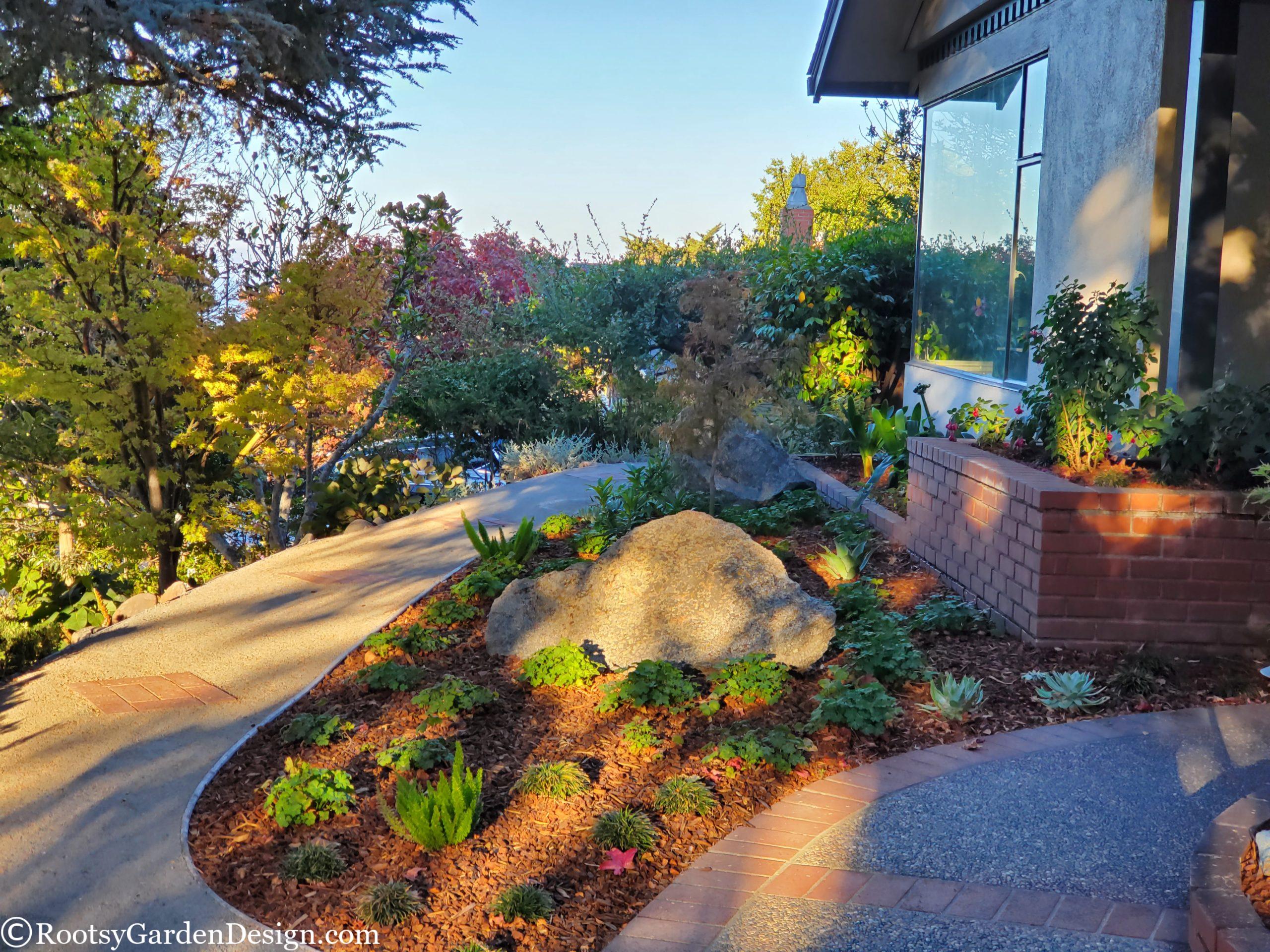 In preparation for her 95th birthday party, our client requested a plant refresh in her front yard garden. This very shady space was lacking color and was suffering from hydrophobic soil covered in plastic weed barrier. We amended the soil, installed more efficient irrigation, and replaced the plastic with a healthy layer of wood mulch to naturally minimize weeds, help retain moisture, and condition the soil. We didn’t modify any of the existing hardscape, but did bring in some beautiful boulders to enhance year-round interest. We selected shade loving plants with interesting foliage and varied bloom times to ensure our client will find color and interest every time she looks out the window.