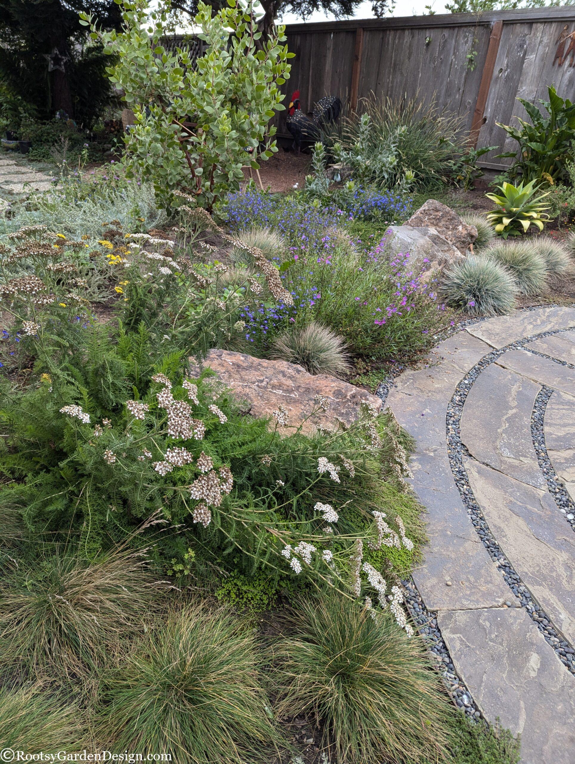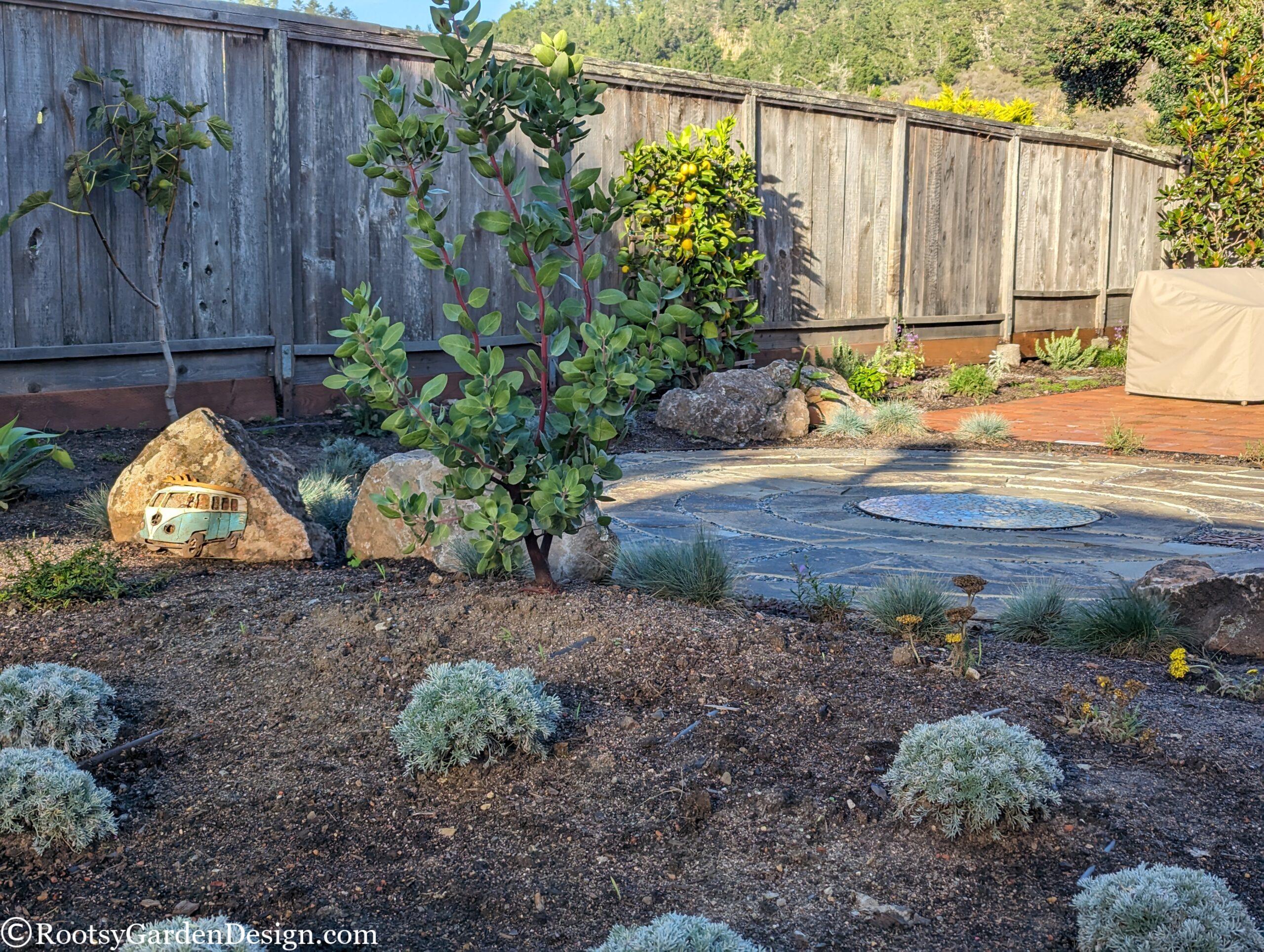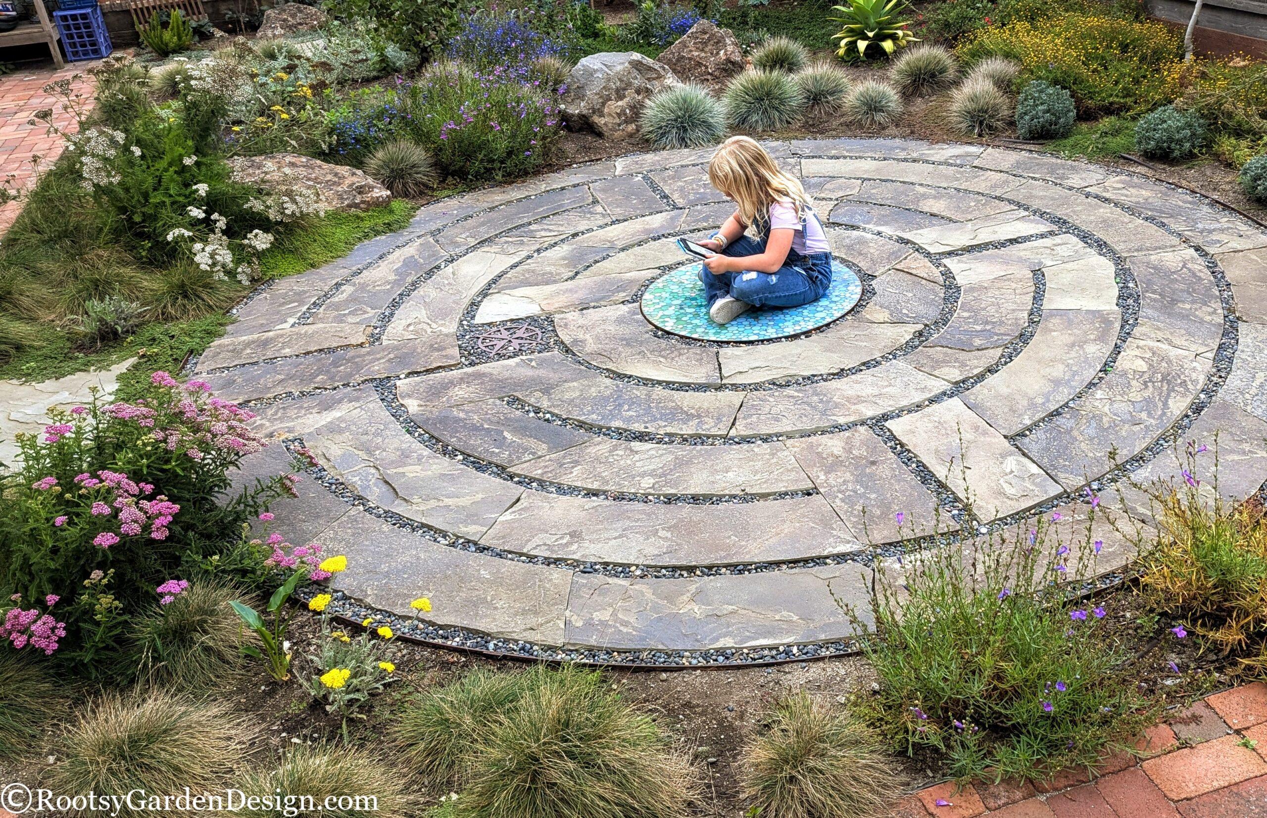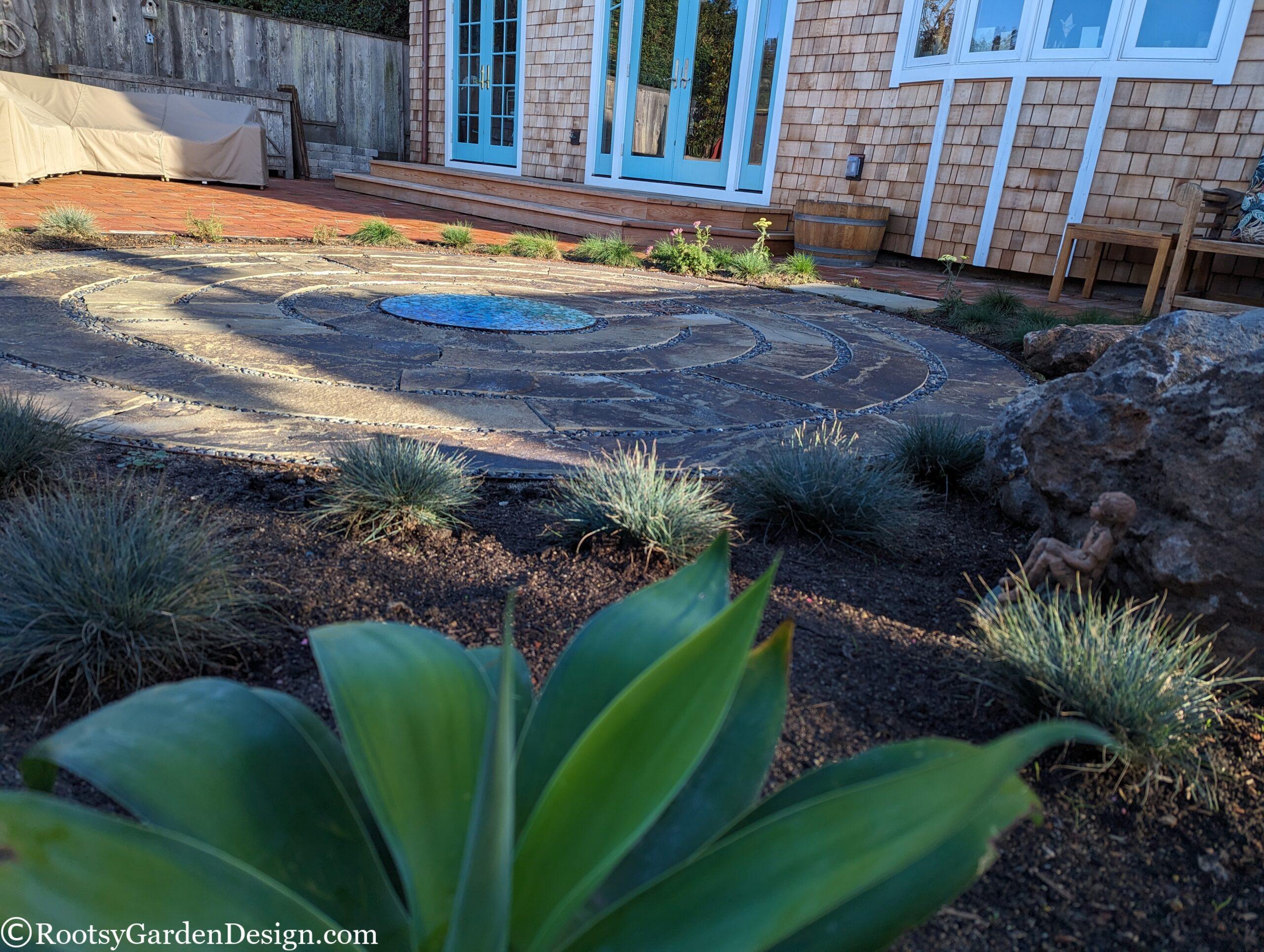 When we decided to relandscape our overgrown backyard, we reached out to Rootsy Garden Design. We never would have achieved what we have without them. The process was a journey of change and discovery, that Laura the owner helped guide and inspire us. We started with a long wish list: things we wanted to retain, multiple seating areas, generous space for entertaining to make the most of a sunny corner of a relatively shady North-facing yard, emphasize California Natives. We also wanted low maintenance which included a Labyrinth. What a challenge! We worked on some of the project ourselves, Laura’s guidance there was indispensable for choosing between those tasks that we could accomplish and those better left to professionals. Laura has an unfailing eye for design, that we really have only fully appreciated now that the project is complete. Our space is peaceful, spiritual and yet functional but also full of thoughtful elements with unexpected vistas.