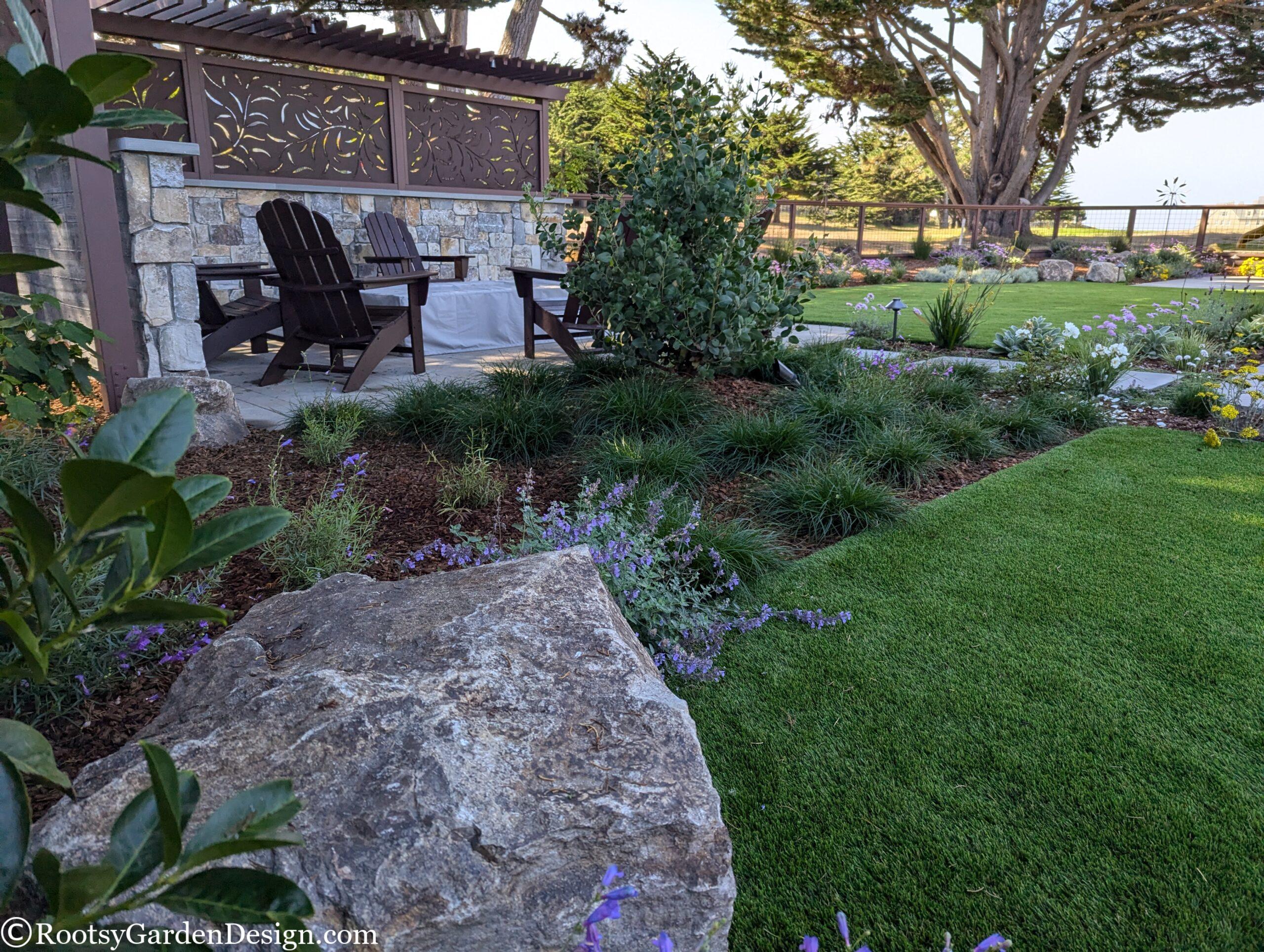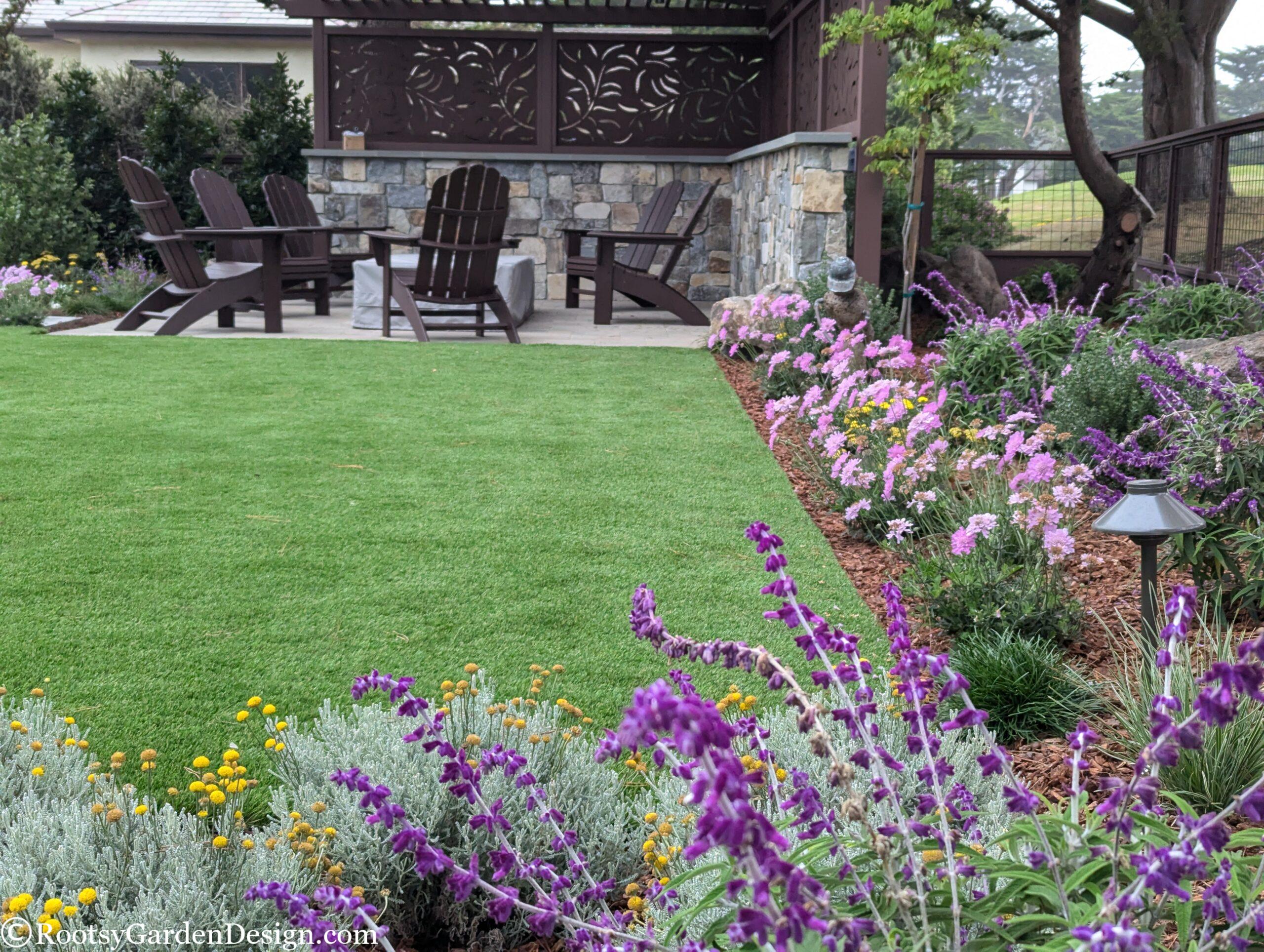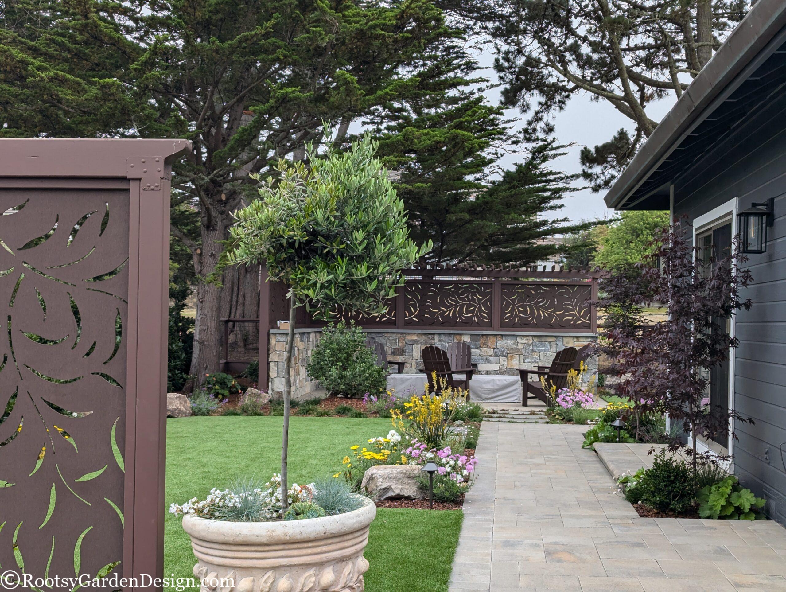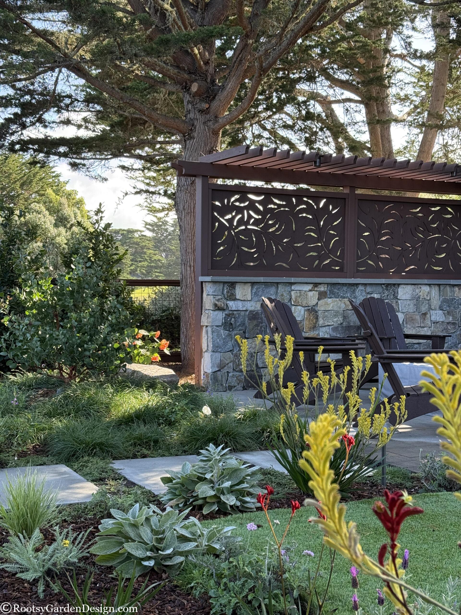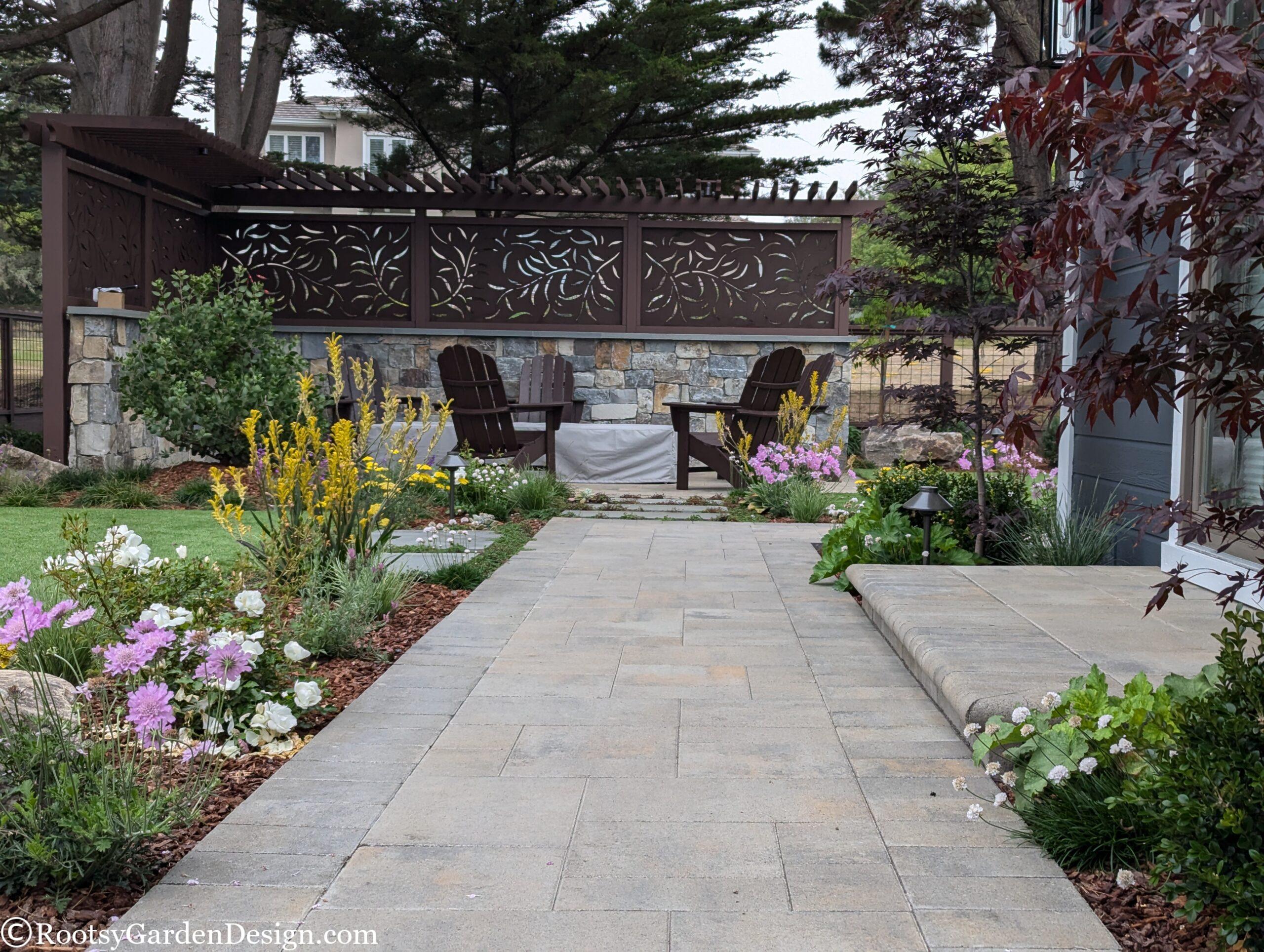 Out of chaos often surfaces beauty – and in this case it resulted in a magazine worthy landscape for our incredible clients. We were hired very late in the process. The backyard had been demolished and the contractor’s team was onsite ready to build something, but there was no plan! We quickly went to work and the late nights designing were worth it because we now have dear friends in the clients and a beautiful garden space to nurture. Their backyard is adjacent a golf course tee box so protection from rogue golf balls was a must. We designed a screening arbor anchored by a beautiful stone wall around a new fire pit patio. Now our clients can totally relax and relish in the beautiful views. Turf areas where the grandkids like to play are surrounded by colorful planting beds. Paver pathways and thyme lined bluestone steppers seamlessly connect the garden areas and lead to a new paver dining patio. Bougainvillea and jasmine vines adorn custom trellises against the house. A retaining wall and guest entrance stairs frame the new hot tub and seating area, which was made to feel more intimate with a decorative privacy screen, flowering vines and young trees.