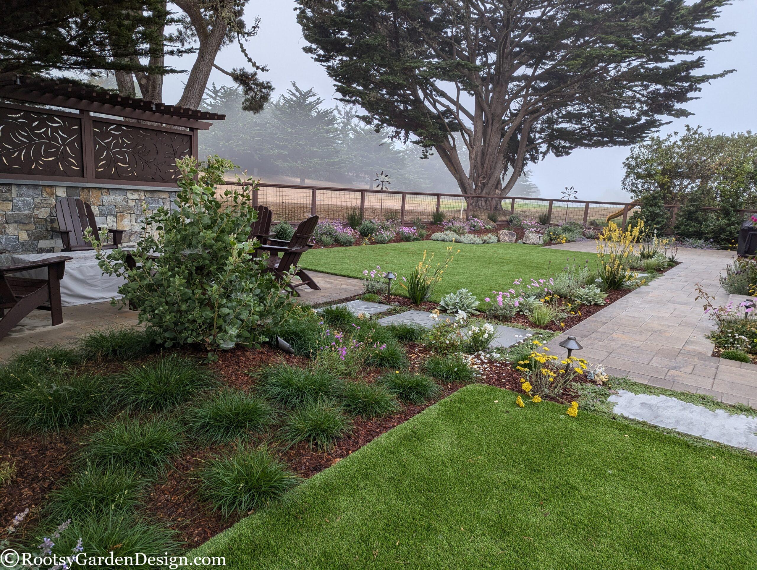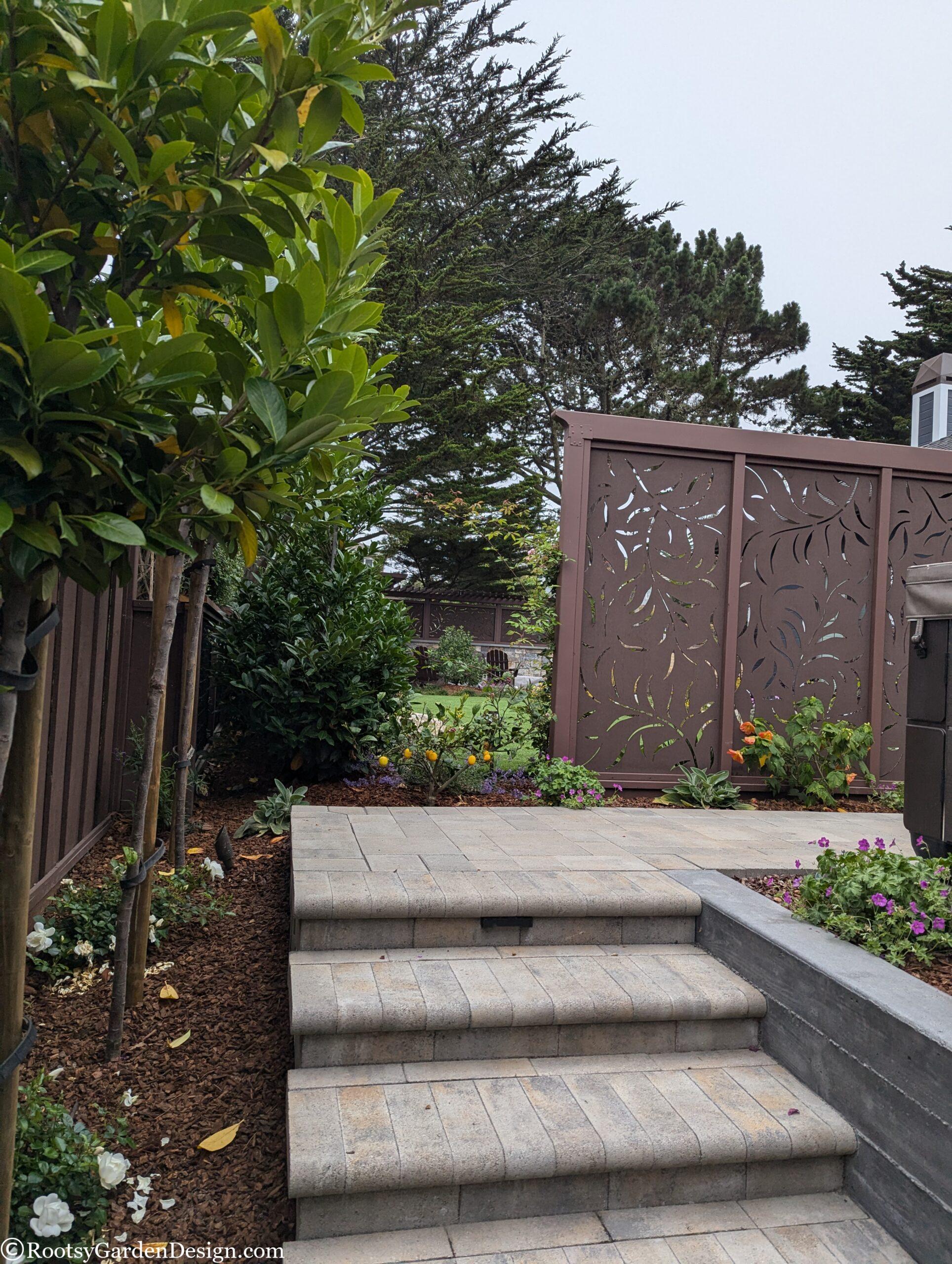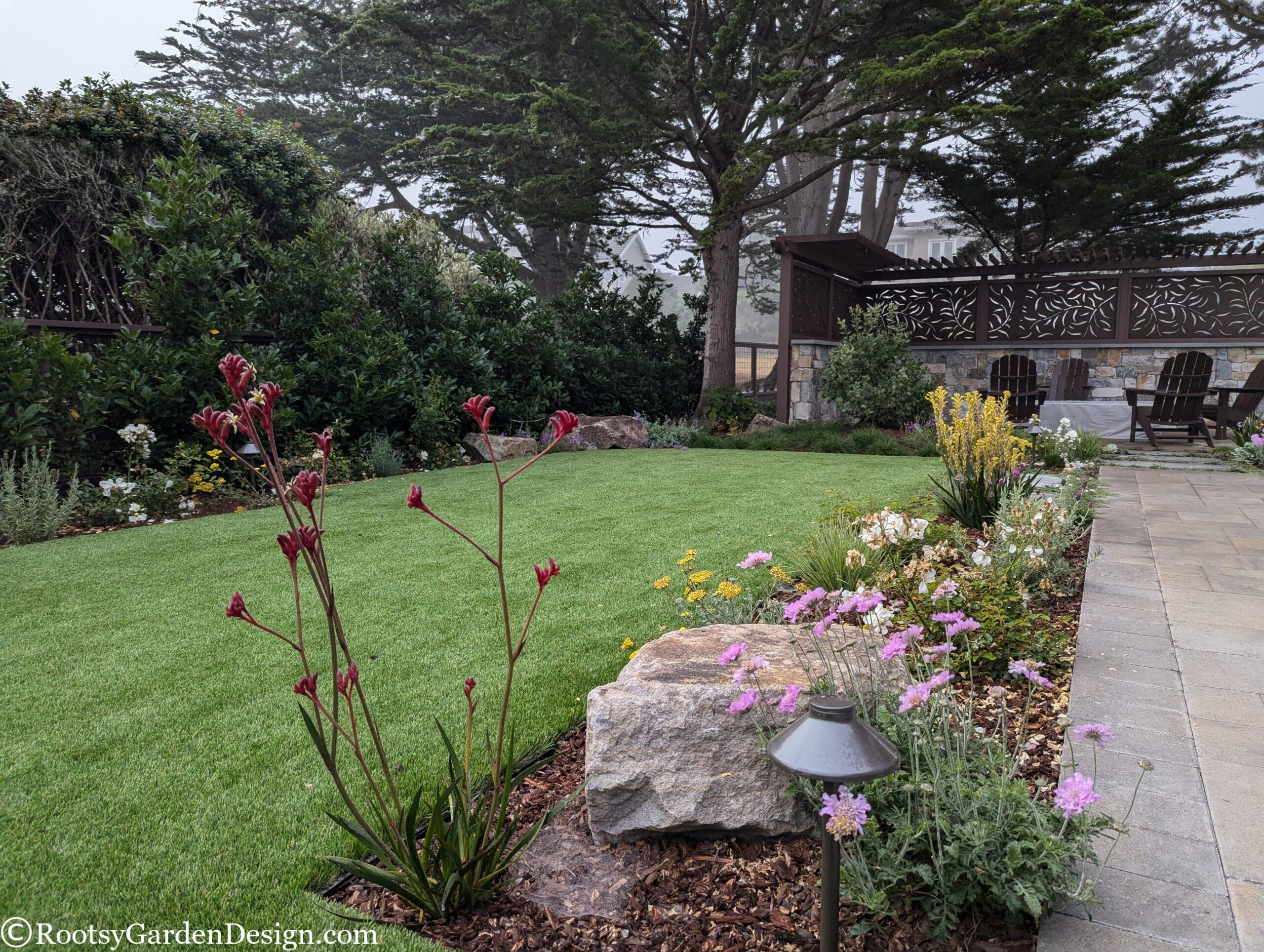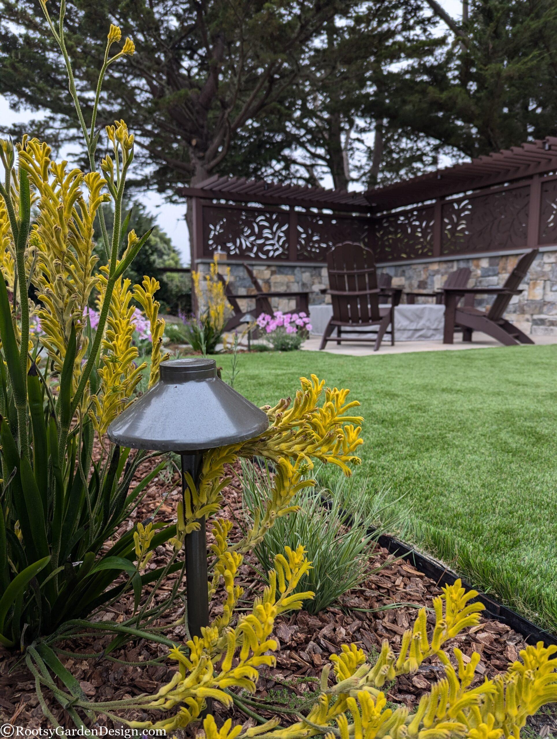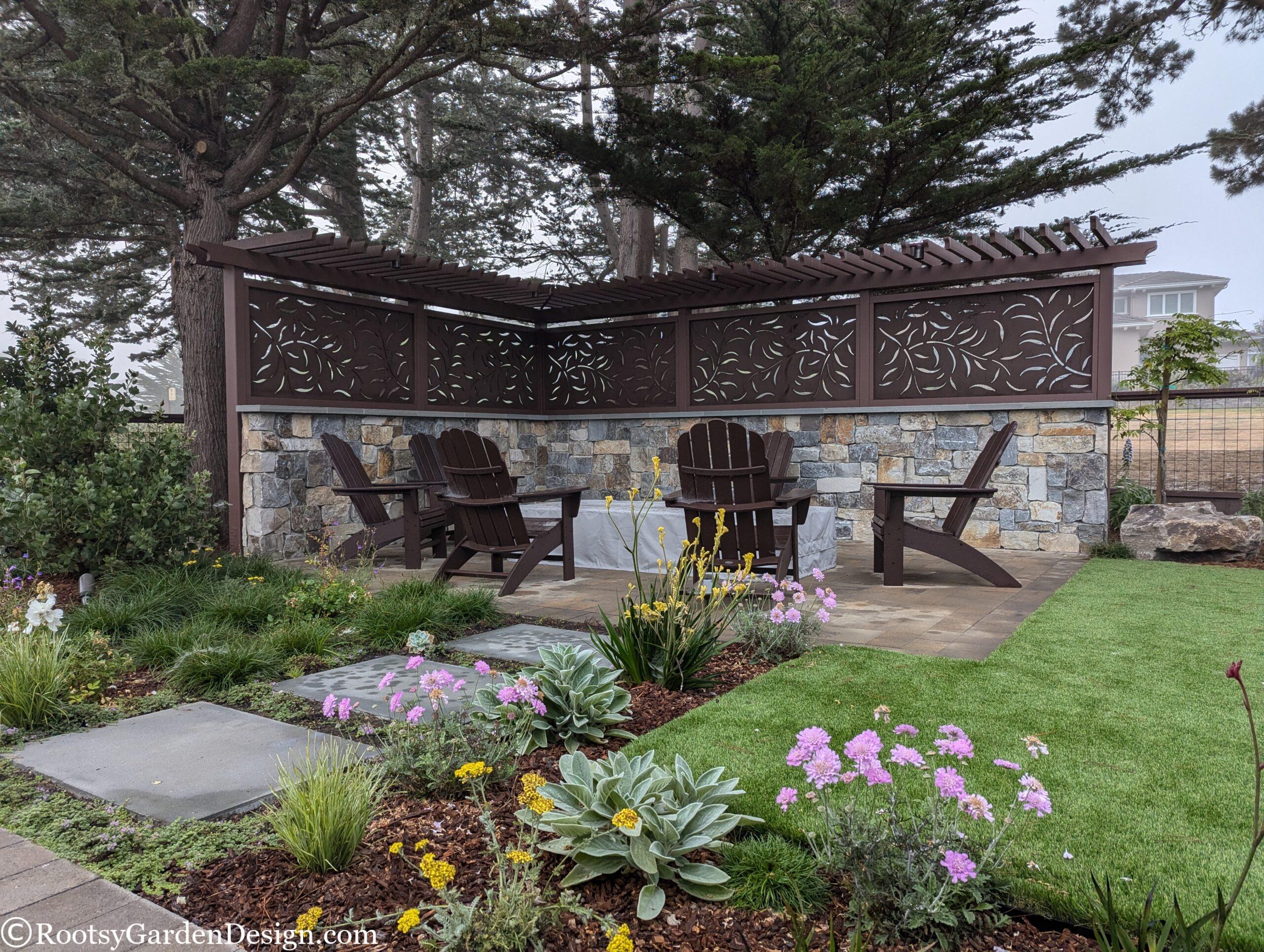 Out of chaos often surfaces beauty – and in this case it resulted in a magazine worthy landscape for our incredible clients. We were hired very late in the process. The backyard had been demolished and the contractor’s team was onsite ready to build something, but there was no plan! We quickly went to work and the late nights designing were worth it because we now have dear friends in the clients and a beautiful garden space to nurture. Their backyard is adjacent a golf course tee box so protection from rogue golf balls was a must. We designed a screening arbor anchored by a beautiful stone wall around a new fire pit patio. Now our clients can totally relax and relish in the beautiful views. Turf areas where the grandkids like to play are surrounded by colorful planting beds. Paver pathways and thyme lined bluestone steppers seamlessly connect the garden areas and lead to a new paver dining patio. Bougainvillea and jasmine vines adorn custom trellises against the house. A retaining wall and guest entrance stairs frame the new hot tub and seating area, which was made to feel more intimate with a decorative privacy screen, flowering vines and young trees.