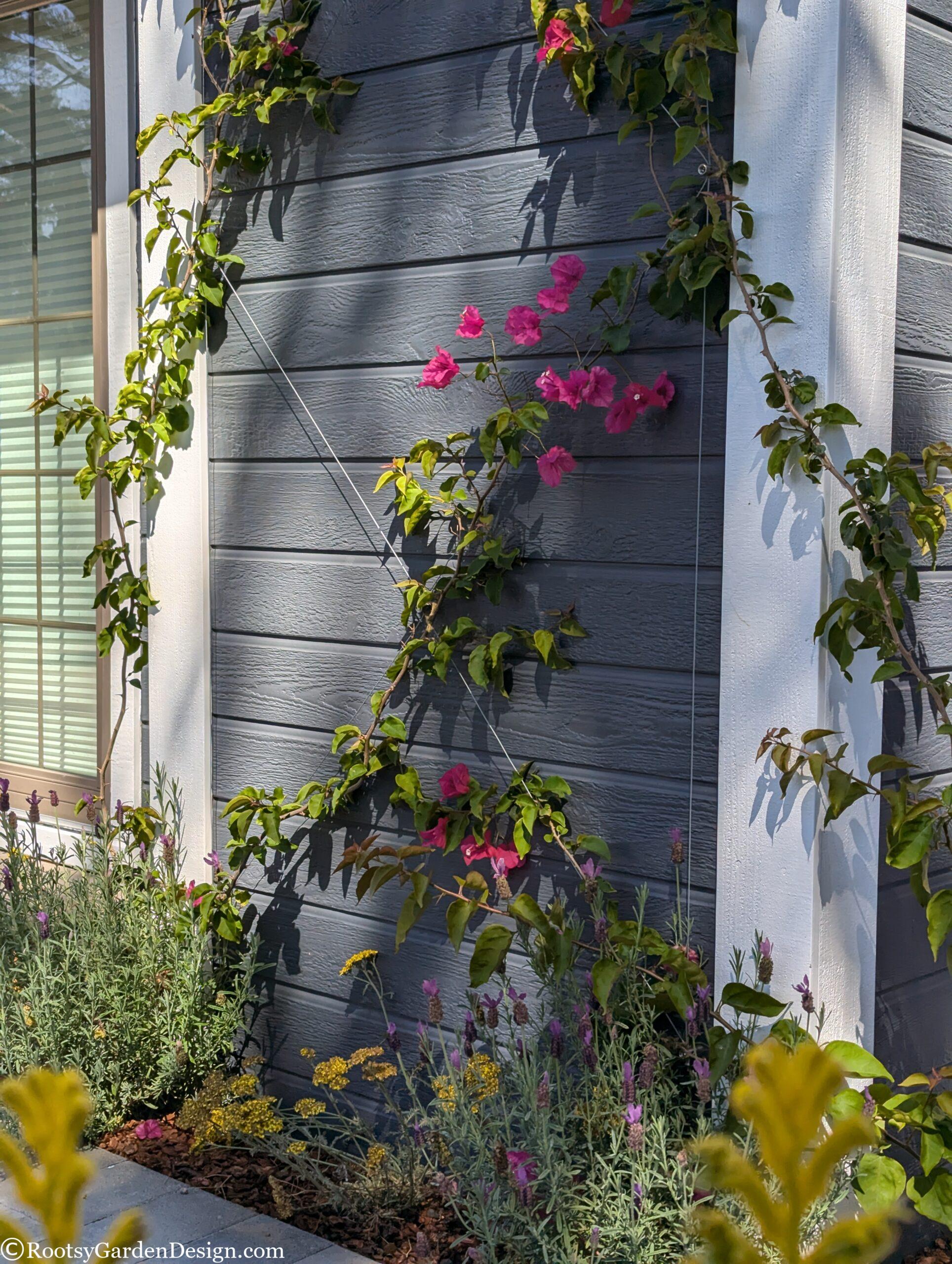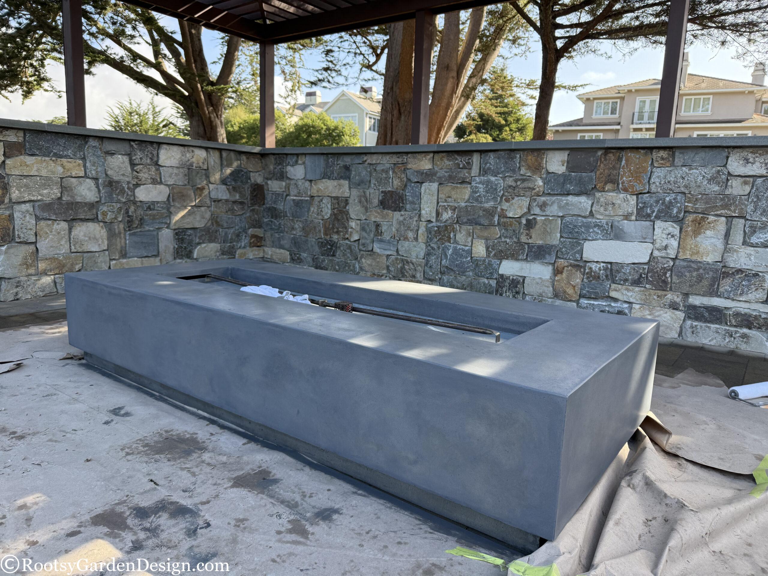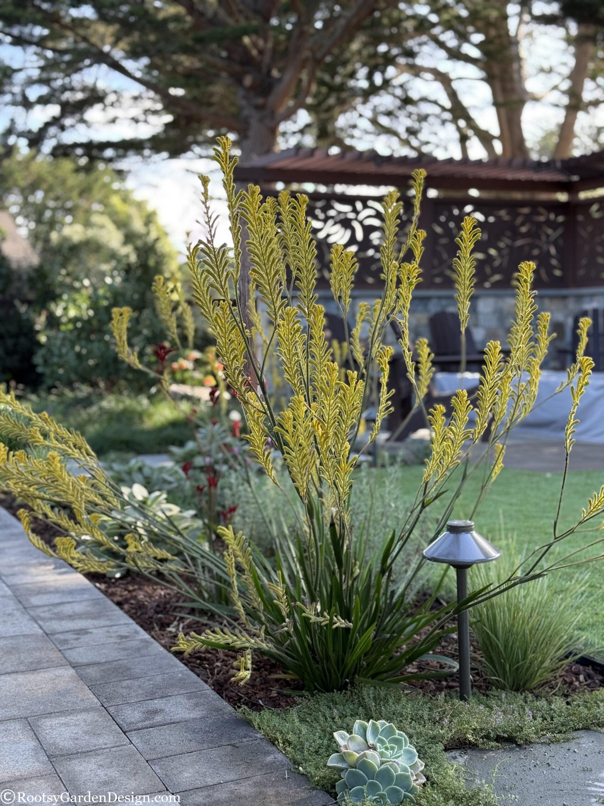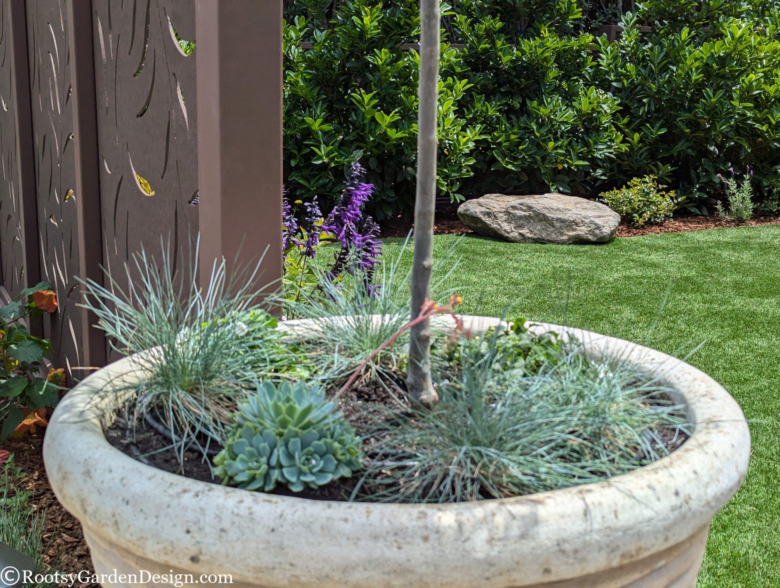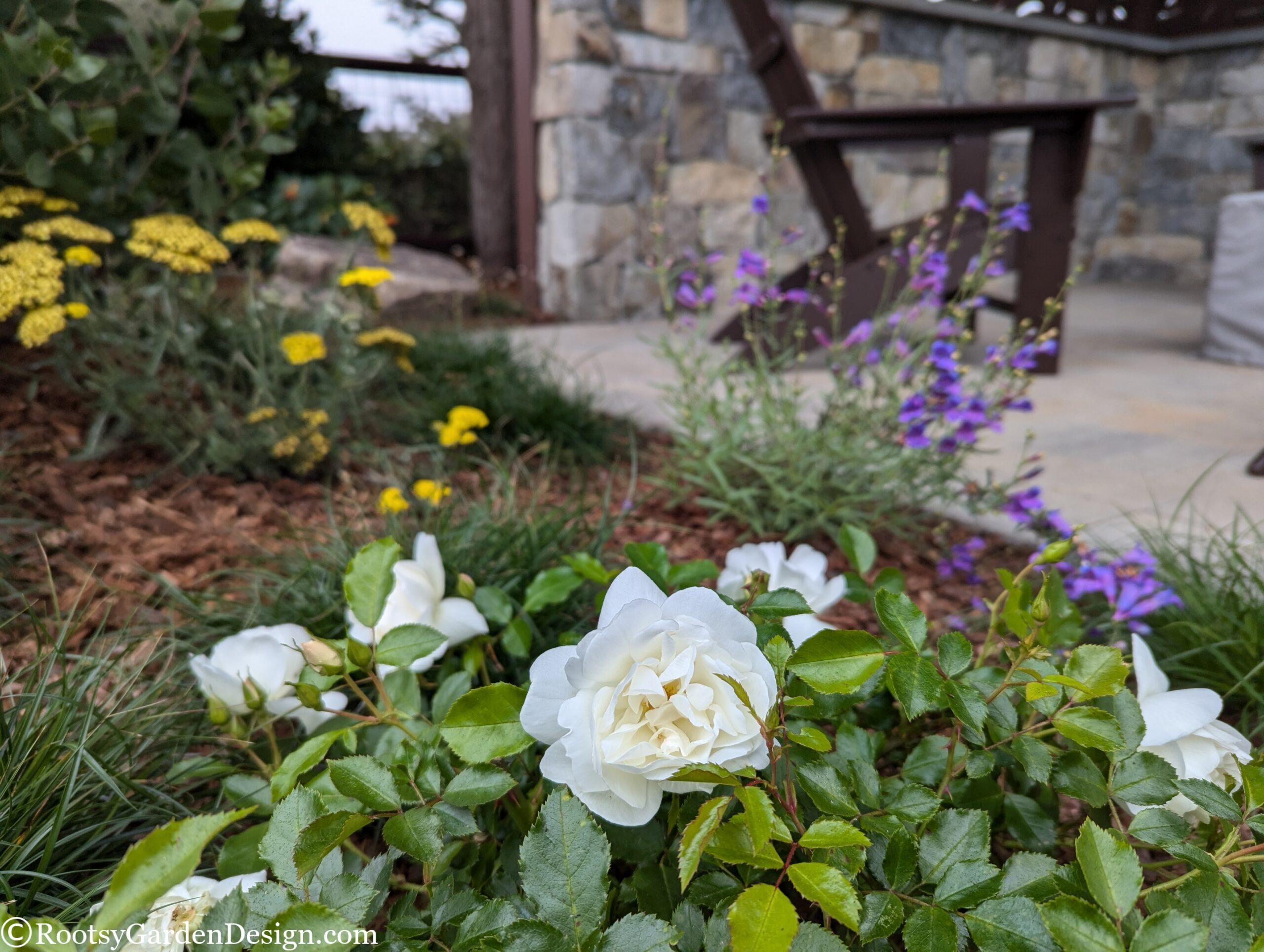 Out of chaos often surfaces beauty – and in this case it resulted in a magazine worthy landscape for our incredible clients. We were hired very late in the process. The backyard had been demolished and the contractor’s team was onsite ready to build something, but there was no plan! We quickly went to work and the late nights designing were worth it because we now have dear friends in the clients and a beautiful garden space to nurture. Their backyard is adjacent a golf course tee box so protection from rogue golf balls was a must. We designed a screening arbor anchored by a beautiful stone wall around a new fire pit patio. Now our clients can totally relax and relish in the beautiful views. Turf areas where the grandkids like to play are surrounded by colorful planting beds. Paver pathways and thyme lined bluestone steppers seamlessly connect the garden areas and lead to a new paver dining patio. Bougainvillea and jasmine vines adorn custom trellises against the house. A retaining wall and guest entrance stairs frame the new hot tub and seating area, which was made to feel more intimate with a decorative privacy screen, flowering vines and young trees.
