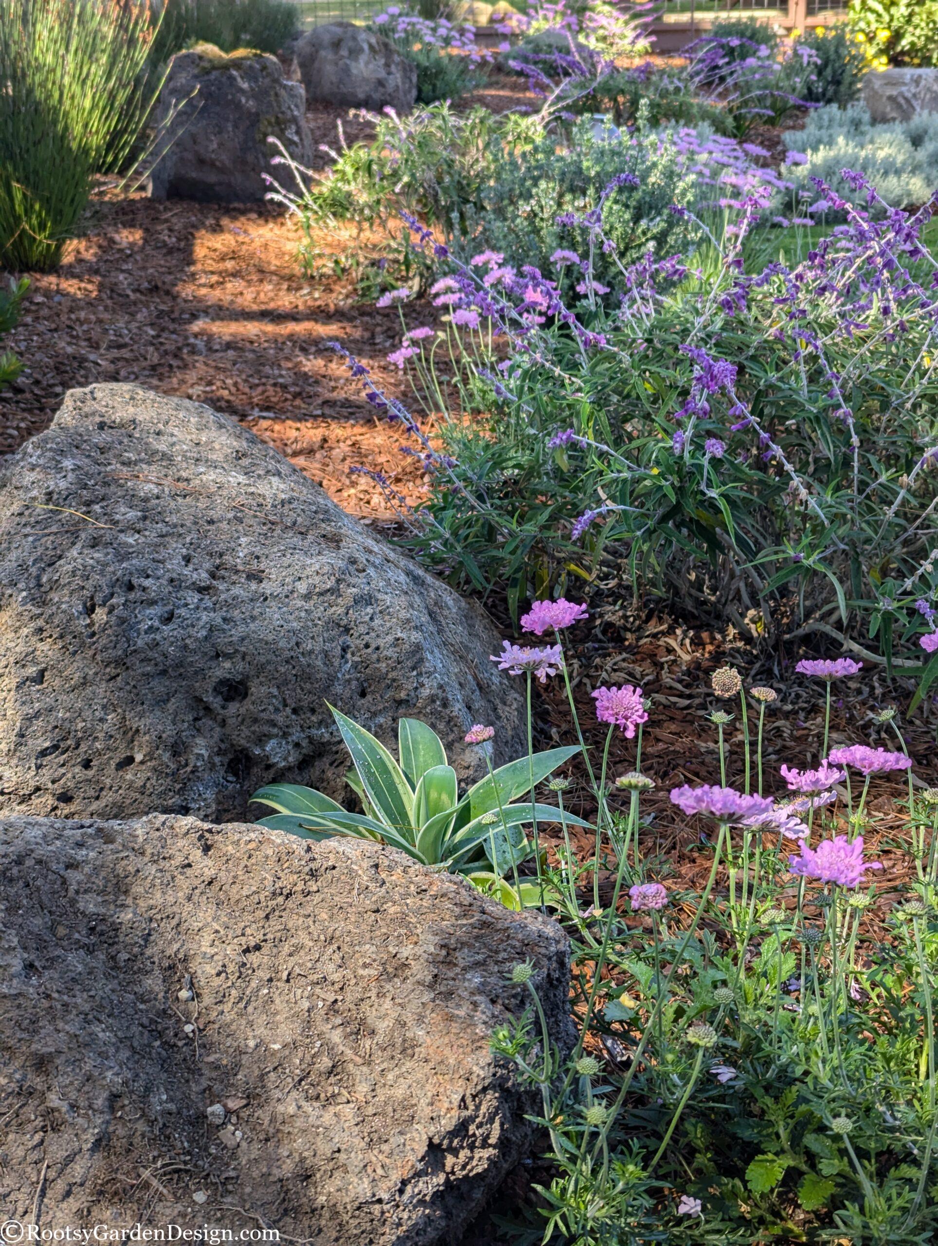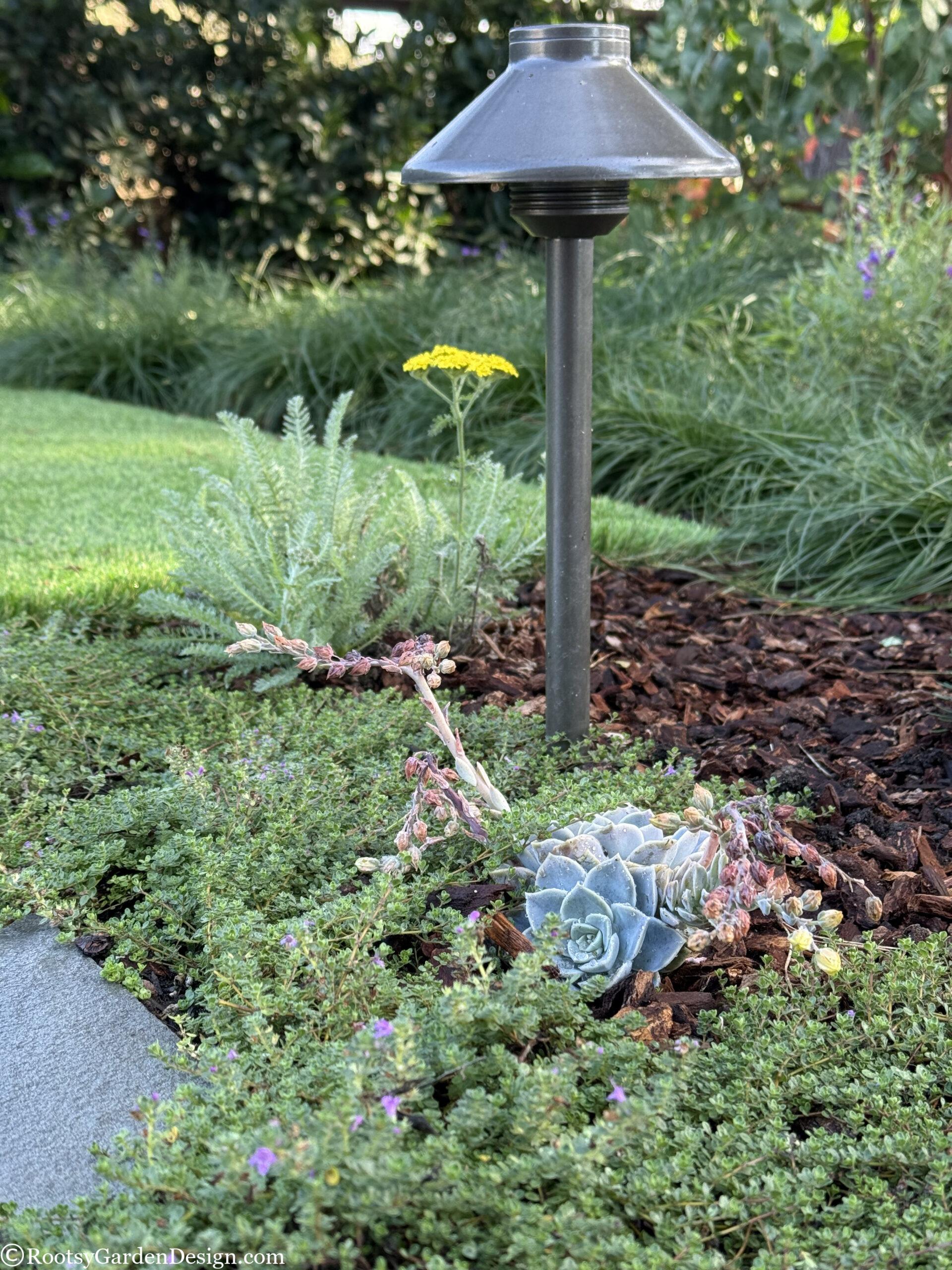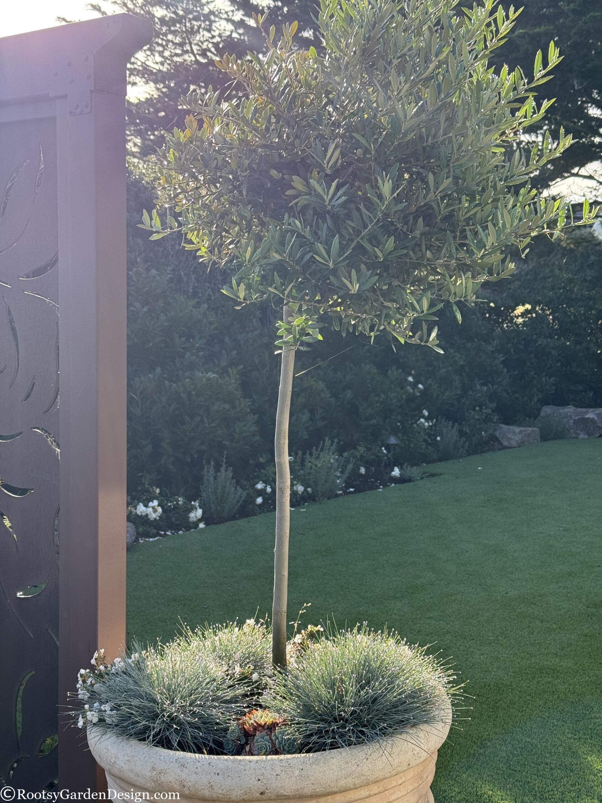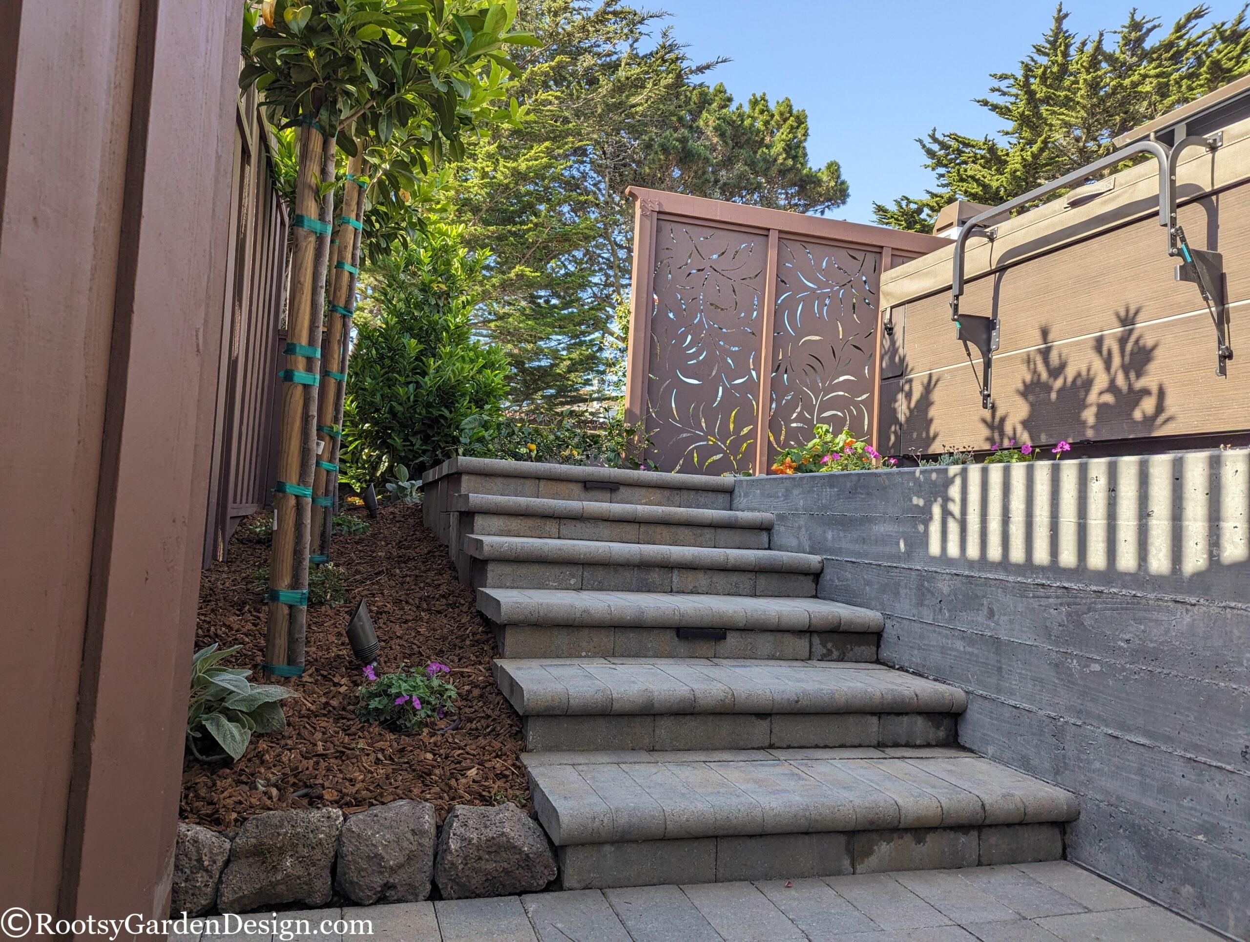 Out of chaos often surfaces beauty – and in this case it resulted in a magazine worthy landscape for our incredible clients. We were hired very late in the process. The backyard had been demolished and the contractor’s team was onsite ready to build something, but there was no plan! We quickly went to work and the late nights designing were worth it because we now have dear friends in the clients and a beautiful garden space to nurture. Their backyard is adjacent a golf course tee box so protection from rogue golf balls was a must. We designed a screening arbor anchored by a beautiful stone wall around a new fire pit patio. Now our clients can totally relax and relish in the beautiful views. Turf areas where the grandkids like to play are surrounded by colorful planting beds. Paver pathways and thyme lined bluestone steppers seamlessly connect the garden areas and lead to a new paver dining patio. Bougainvillea and jasmine vines adorn custom trellises against the house. A retaining wall and guest entrance stairs frame the new hot tub and seating area, which was made to feel more intimate with a decorative privacy screen, flowering vines and young trees.