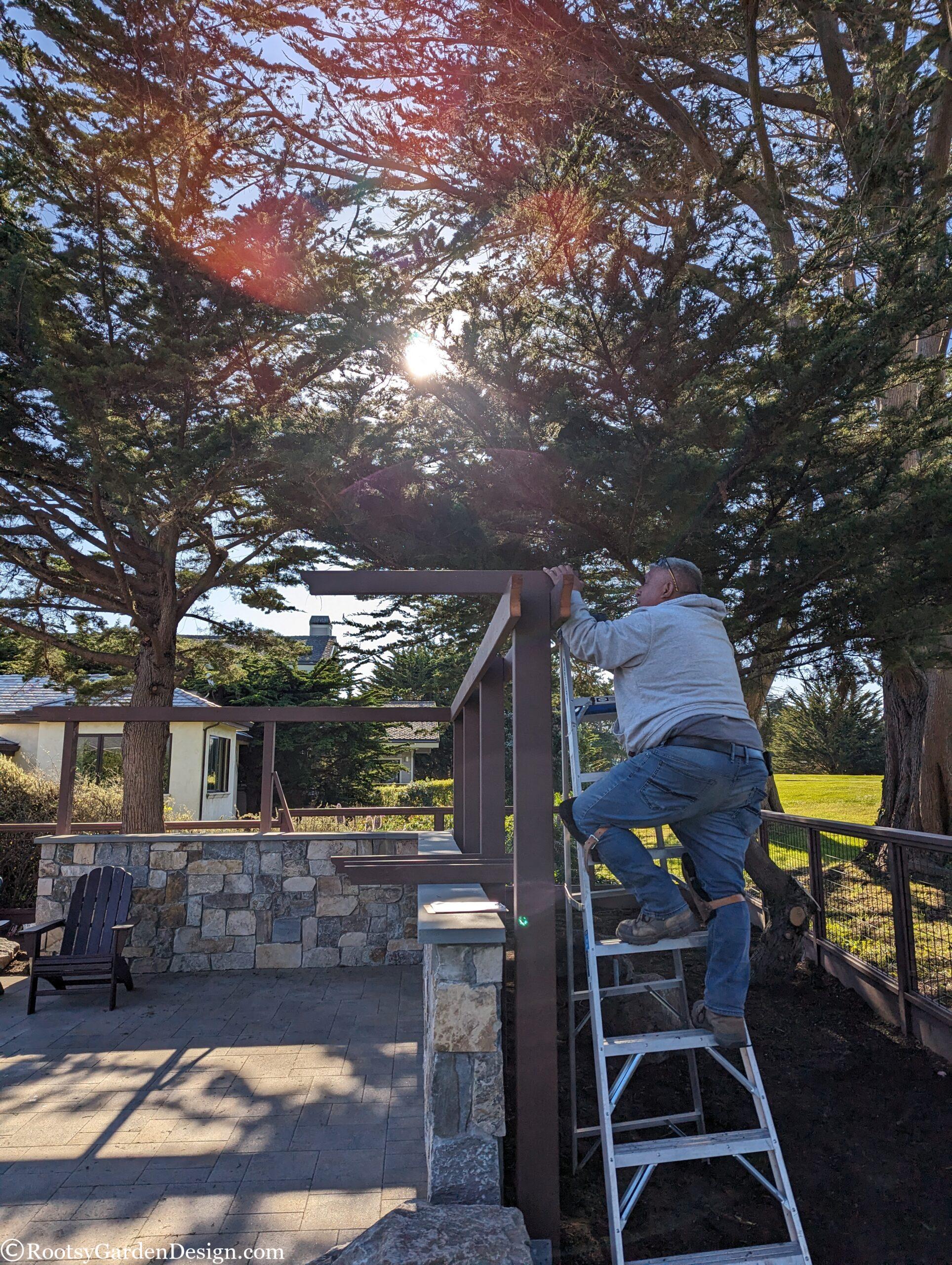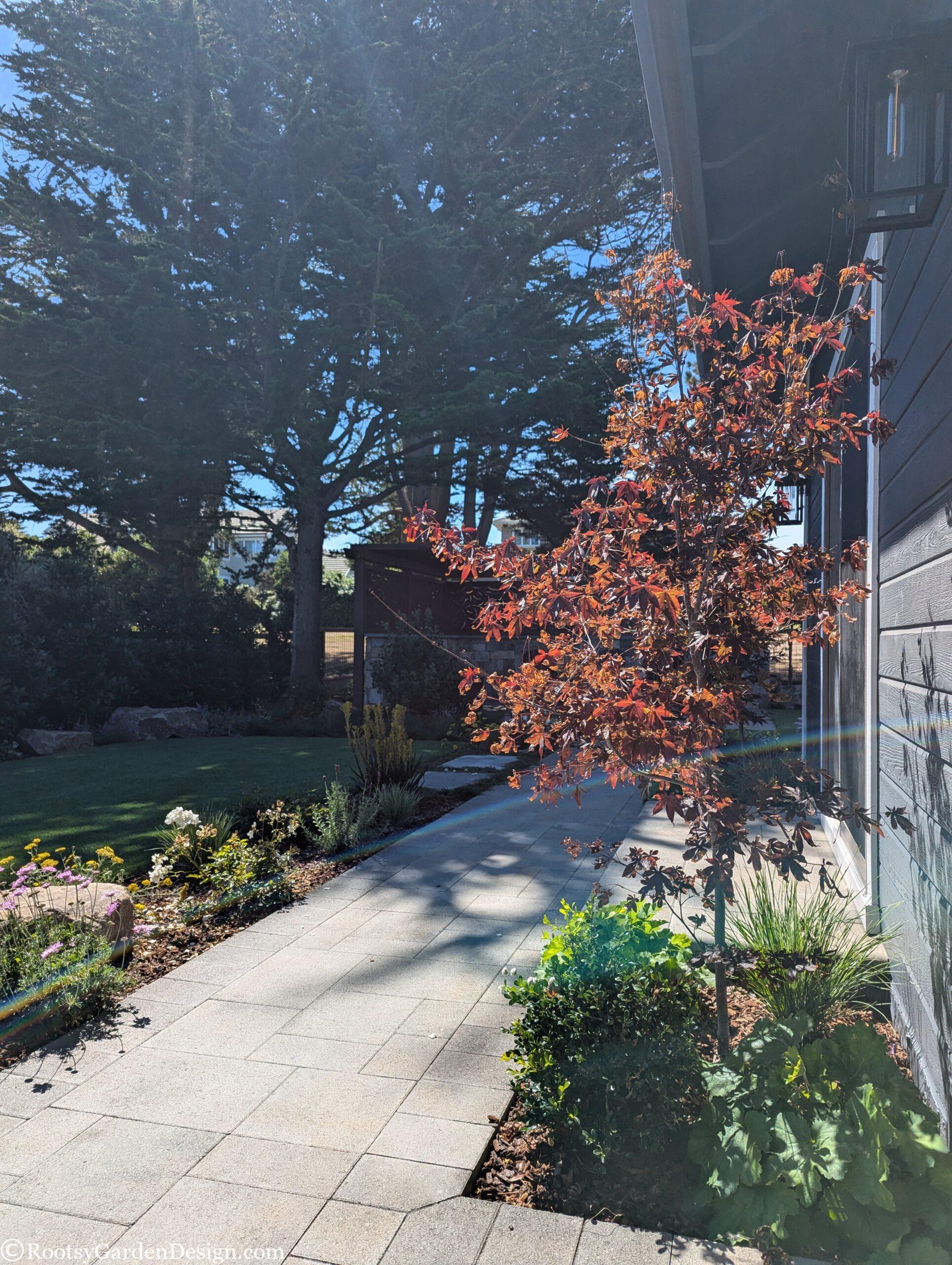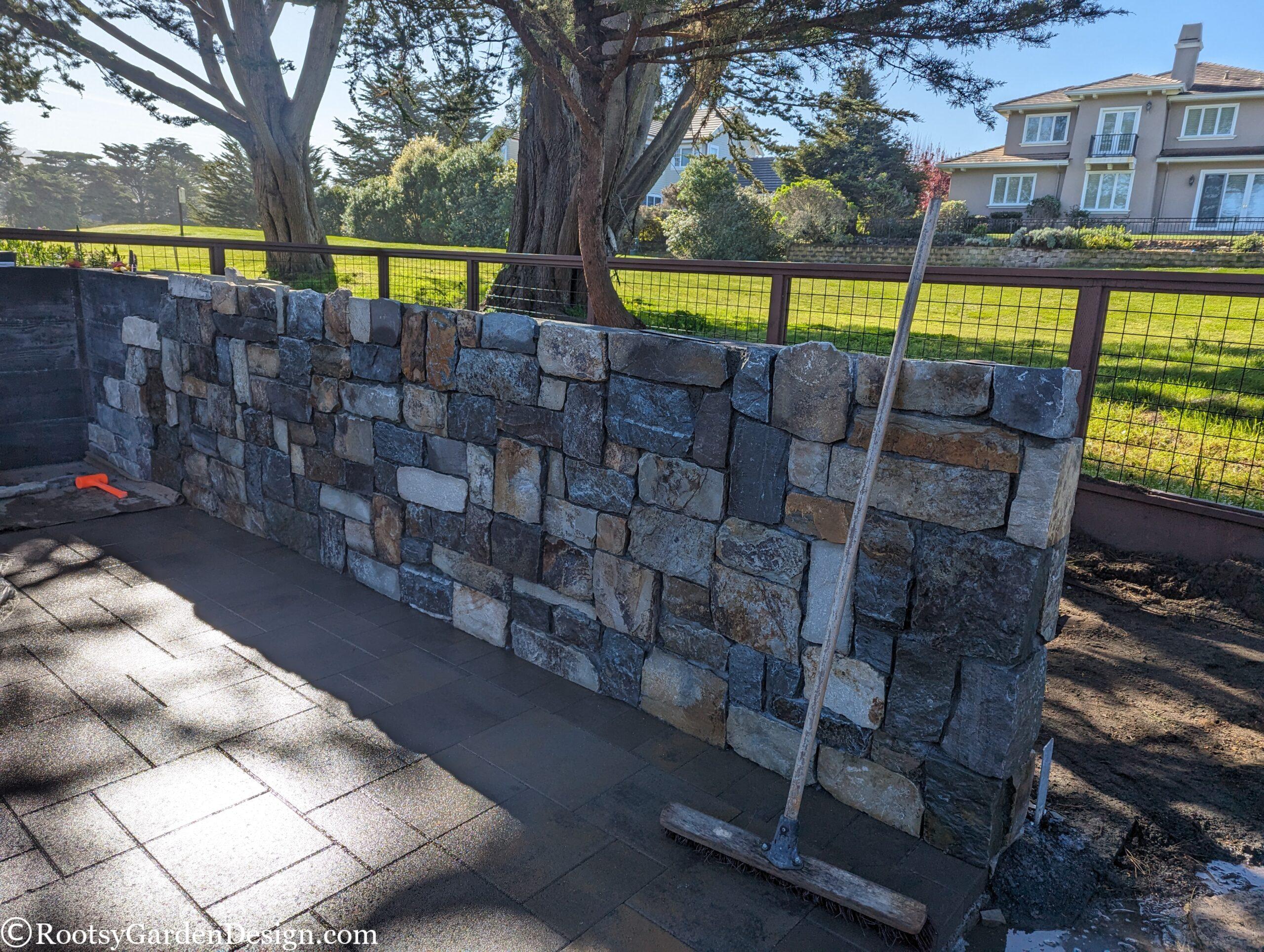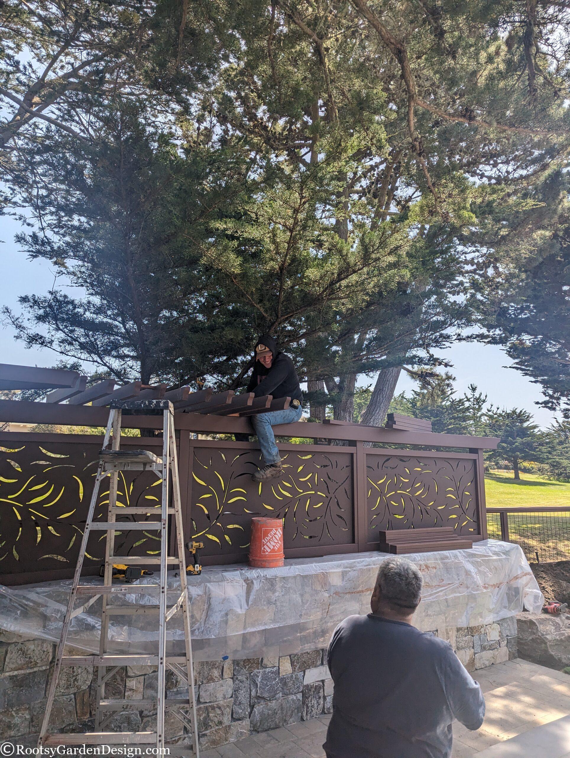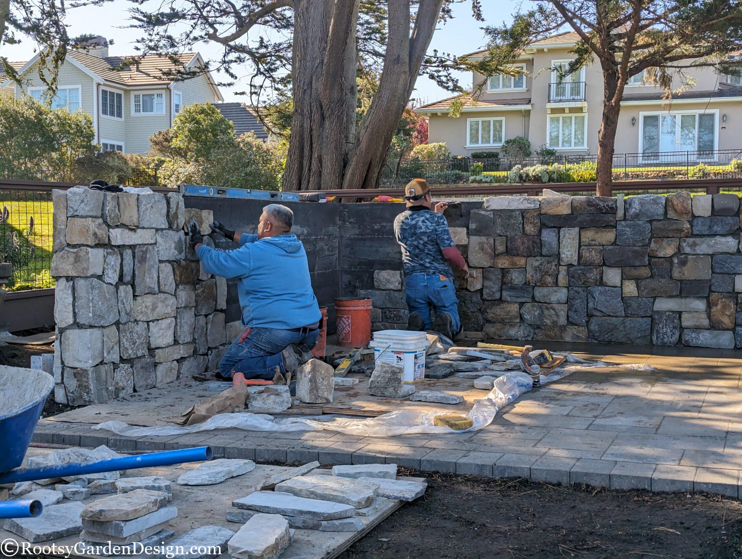 Out of chaos often surfaces beauty – and in this case it resulted in a magazine worthy landscape for our incredible clients. We were hired very late in the process. The backyard had been demolished and the contractor’s team was onsite ready to build something, but there was no plan! We quickly went to work and the late nights designing were worth it because we now have dear friends in the clients and a beautiful garden space to nurture. Their backyard is adjacent a golf course tee box so protection from rogue golf balls was a must. We designed a screening arbor anchored by a beautiful stone wall around a new fire pit patio. Now our clients can totally relax and relish in the beautiful views. Turf areas where the grandkids like to play are surrounded by colorful planting beds. Paver pathways and thyme lined bluestone steppers seamlessly connect the garden areas and lead to a new paver dining patio. Bougainvillea and jasmine vines adorn custom trellises against the house. A retaining wall and guest entrance stairs frame the new hot tub and seating area, which was made to feel more intimate with a decorative privacy screen, flowering vines and young trees.