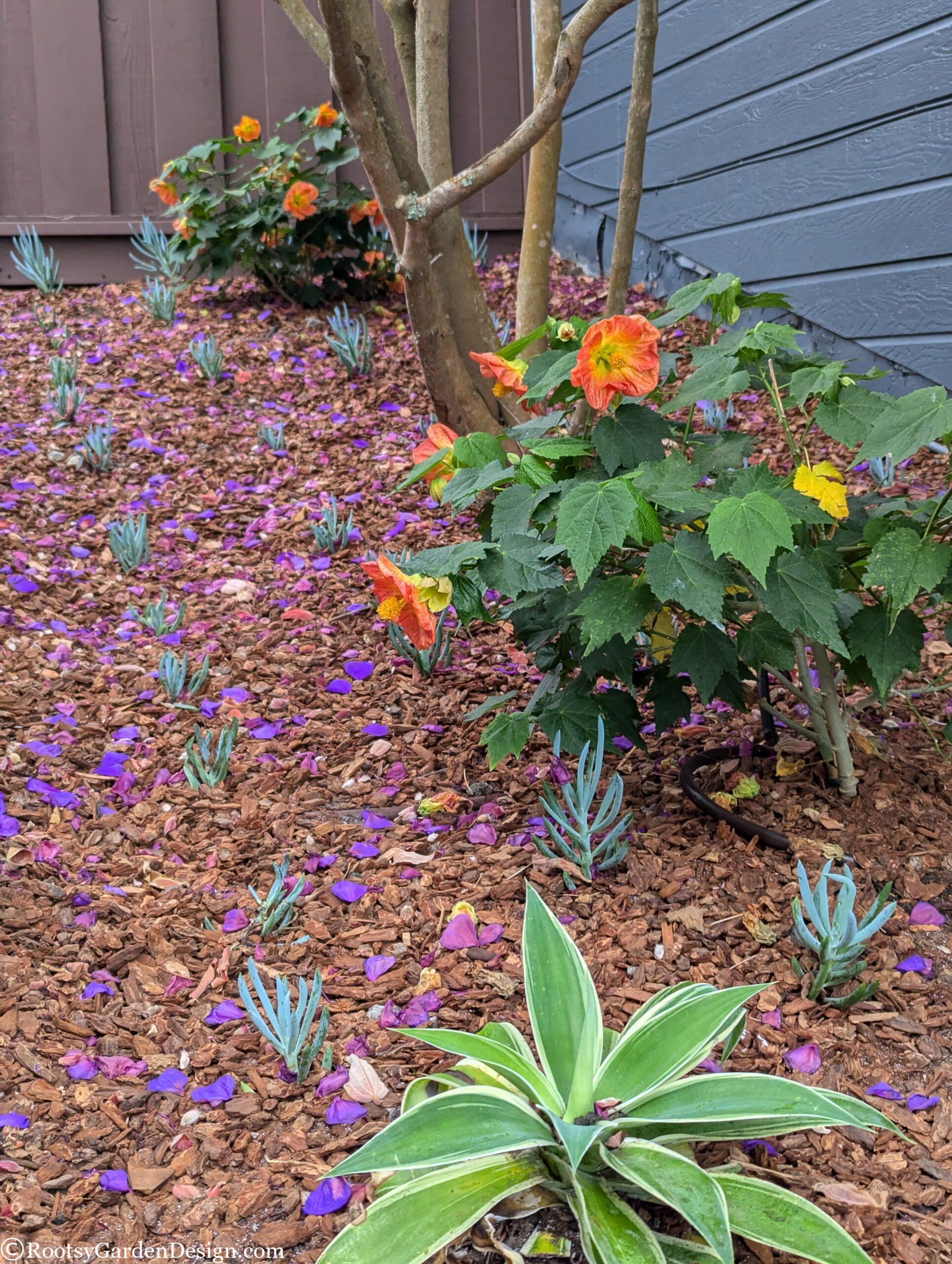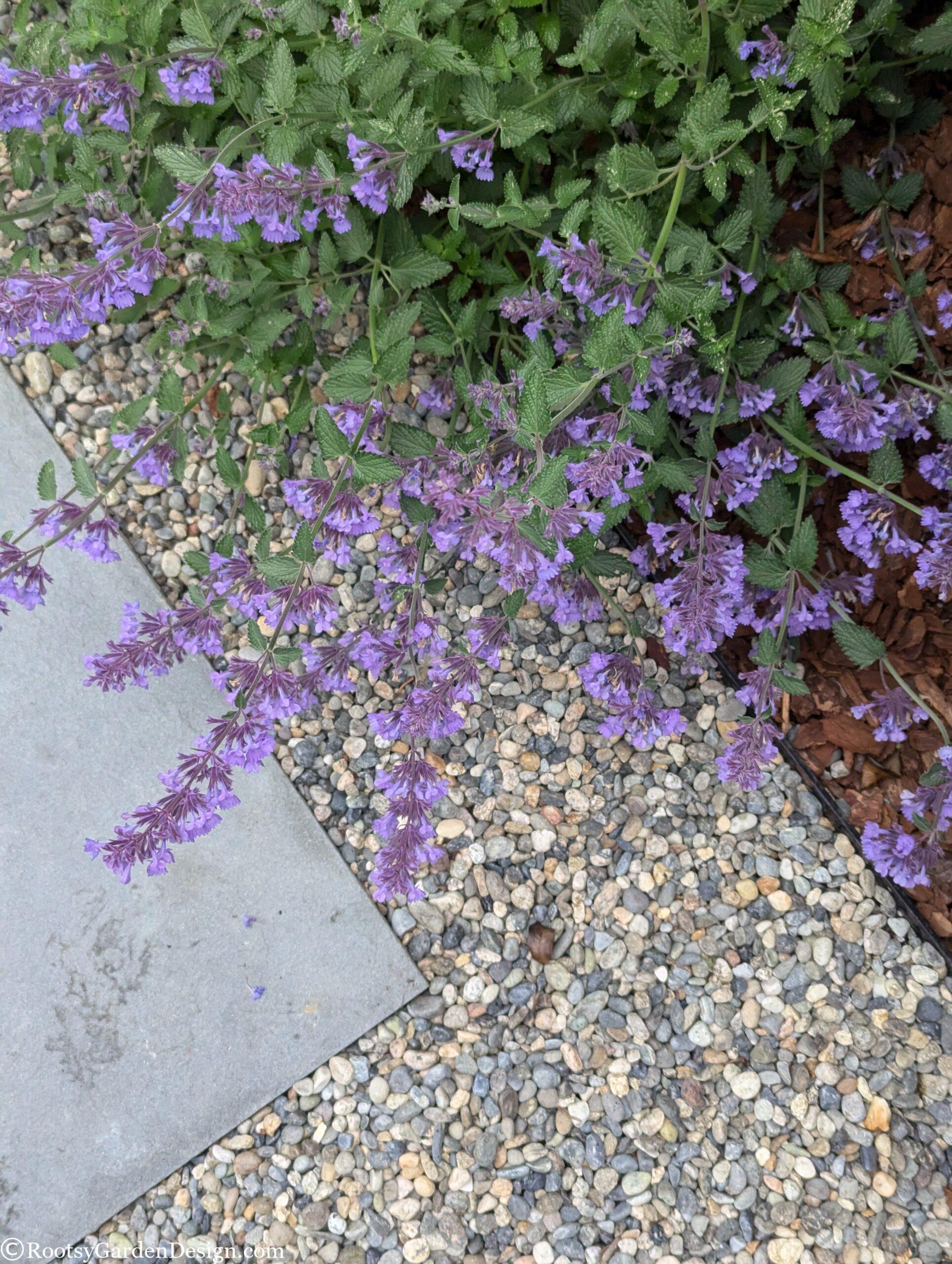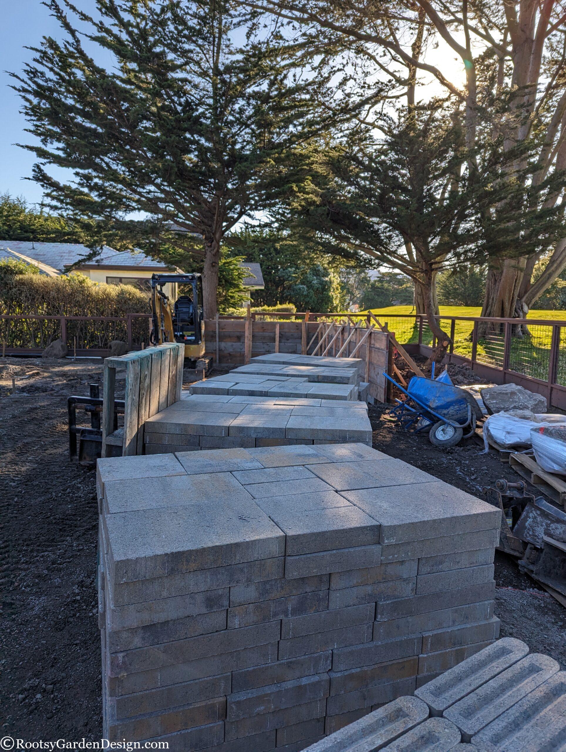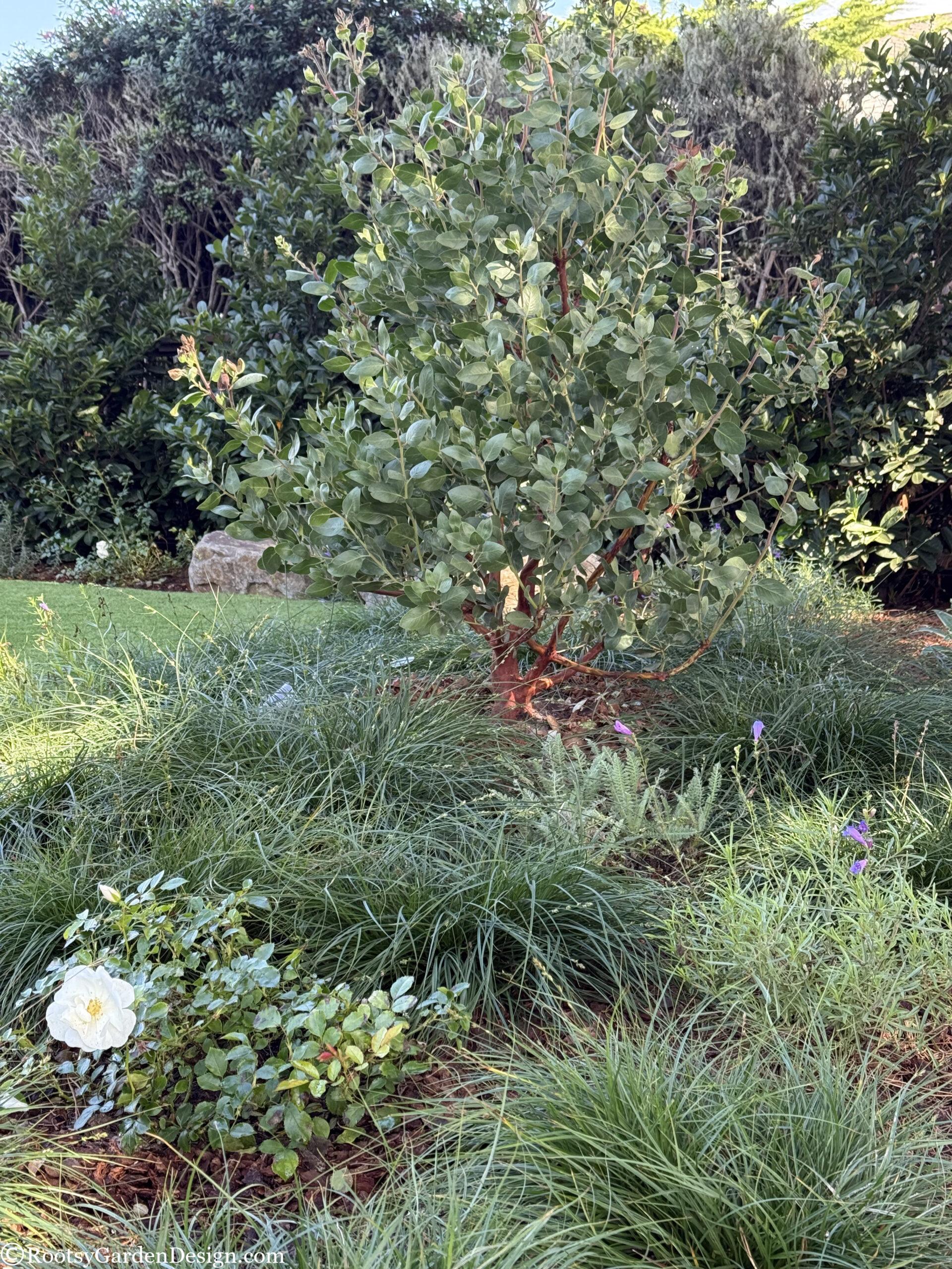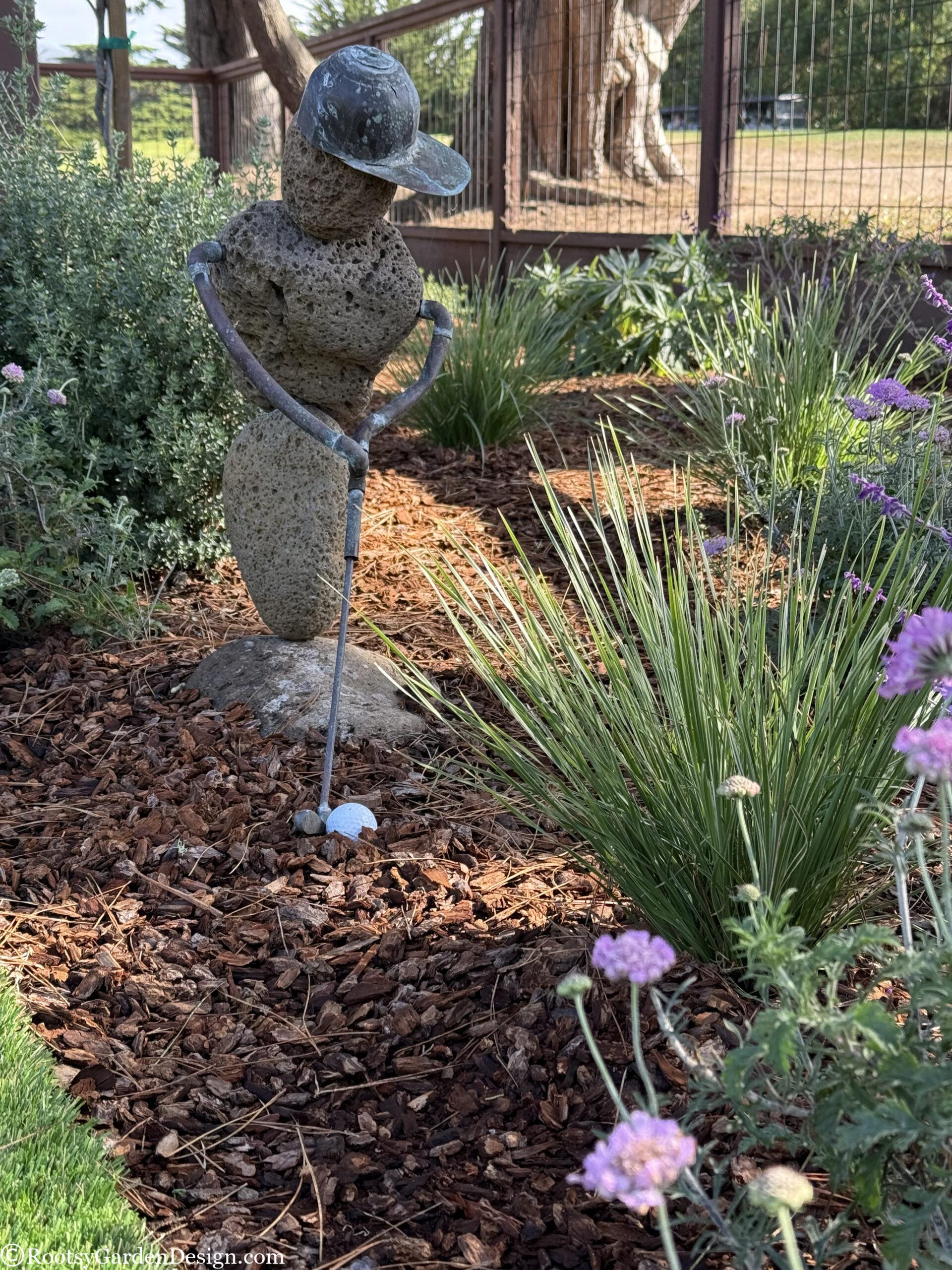 Out of chaos often surfaces beauty – and in this case it resulted in a magazine worthy landscape for our incredible clients. We were hired very late in the process. The backyard had been demolished and the contractor’s team was onsite ready to build something, but there was no plan! We quickly went to work and the late nights designing were worth it because we now have dear friends in the clients and a beautiful garden space to nurture. Their backyard is adjacent a golf course tee box so protection from rogue golf balls was a must. We designed a screening arbor anchored by a beautiful stone wall around a new fire pit patio. Now our clients can totally relax and relish in the beautiful views. Turf areas where the grandkids like to play are surrounded by colorful planting beds. Paver pathways and thyme lined bluestone steppers seamlessly connect the garden areas and lead to a new paver dining patio. Bougainvillea and jasmine vines adorn custom trellises against the house. A retaining wall and guest entrance stairs frame the new hot tub and seating area, which was made to feel more intimate with a decorative privacy screen, flowering vines and young trees.
