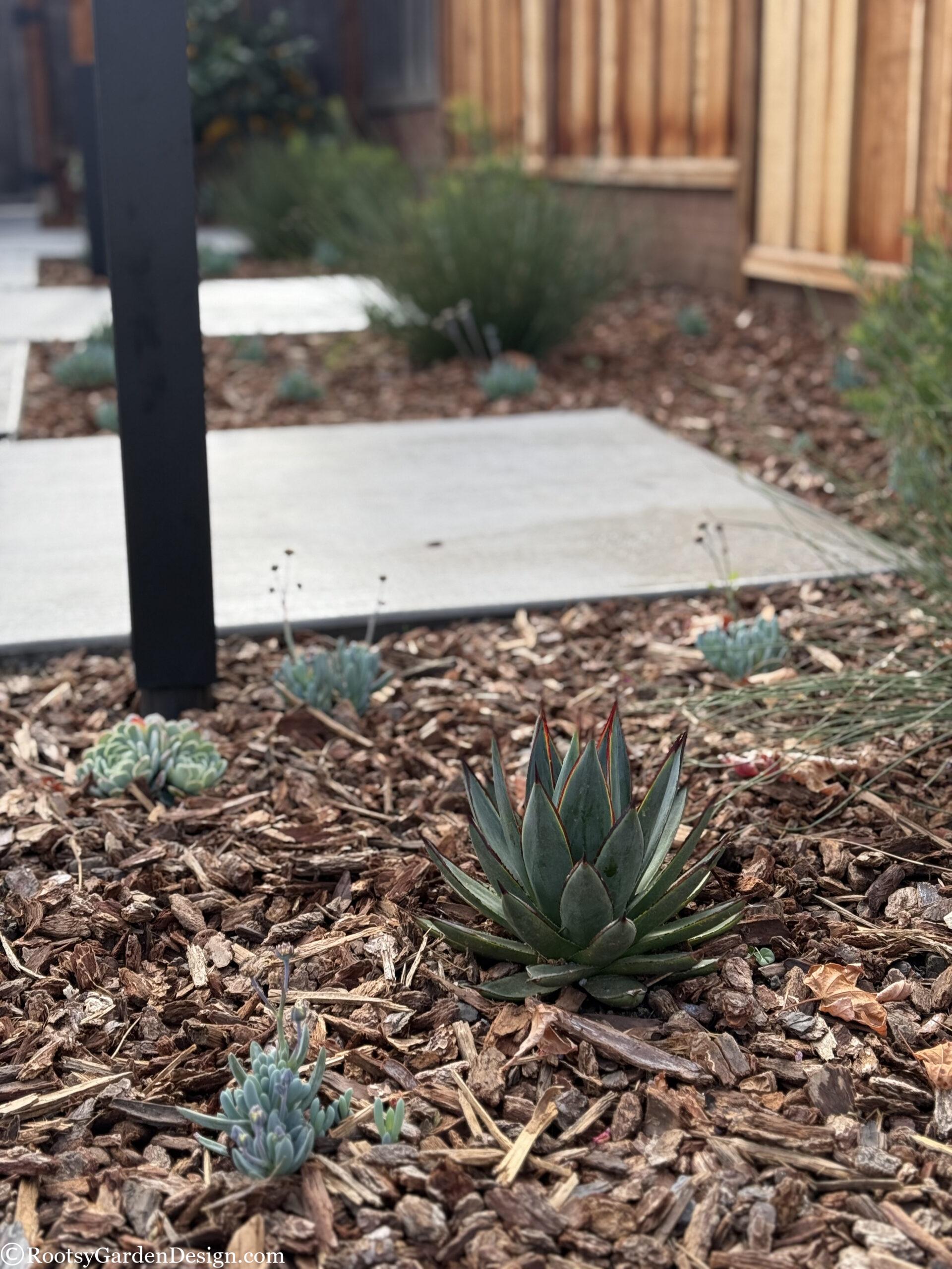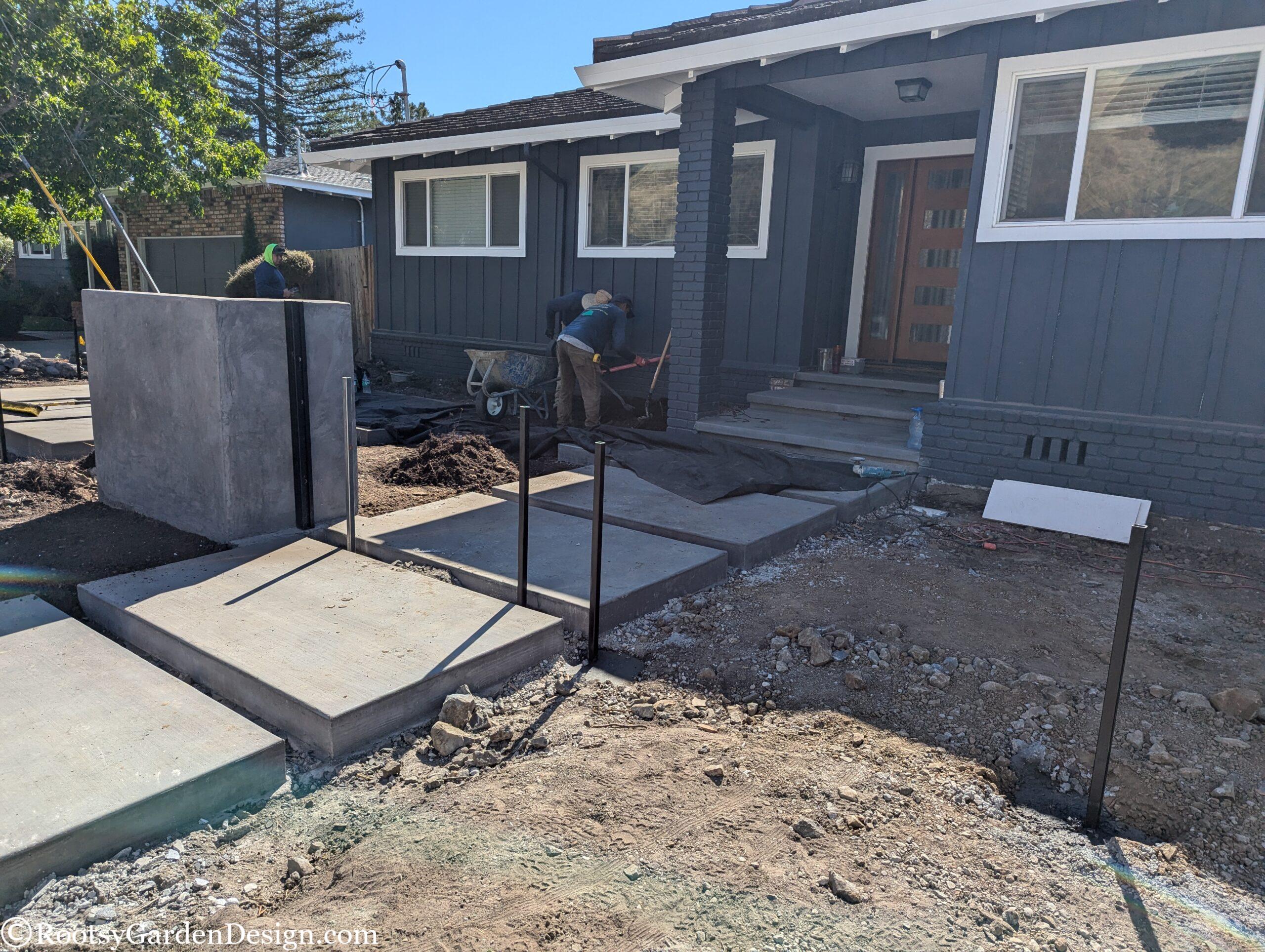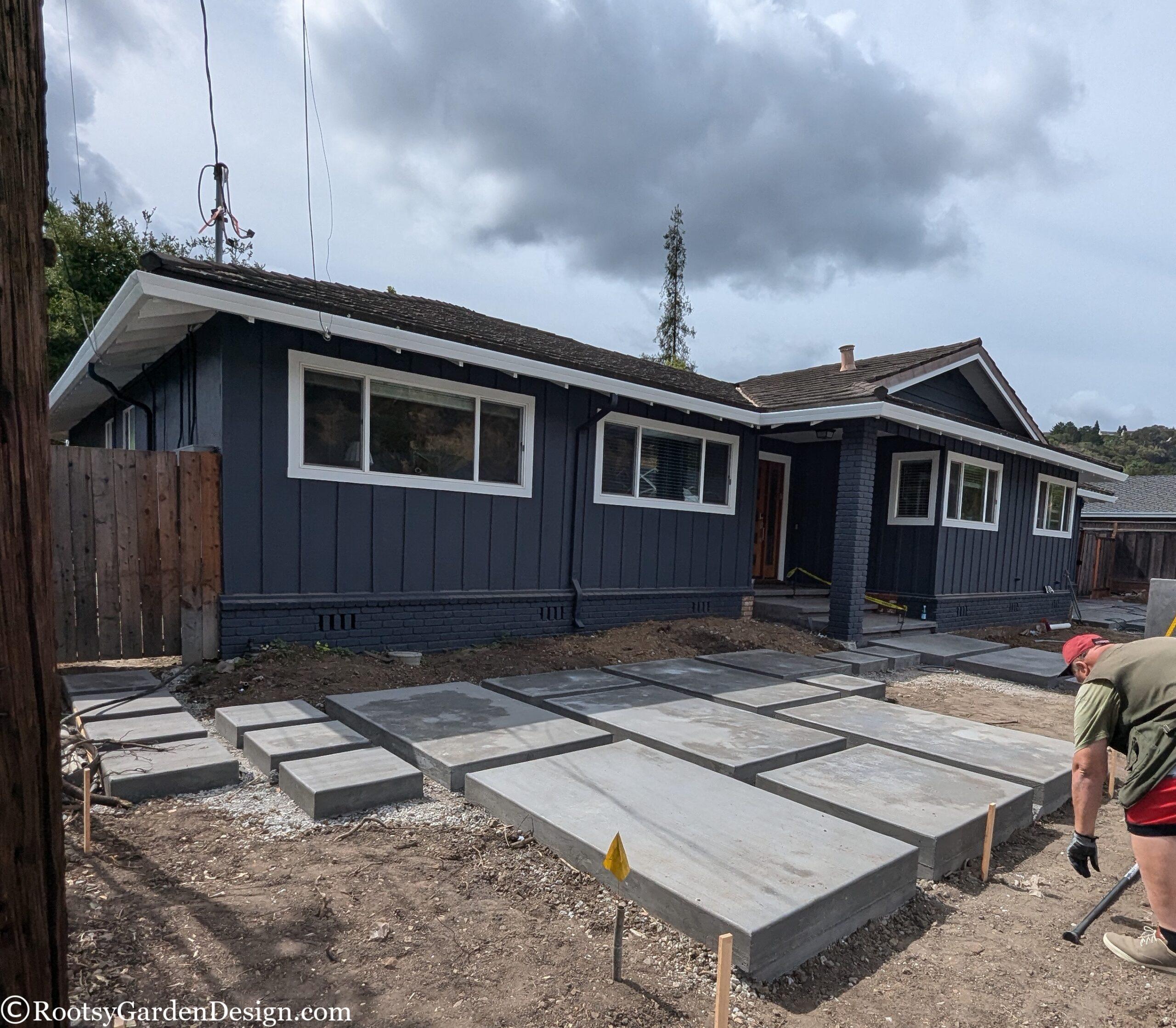 During Covid, our canine loving clients leaned into the joys of entertaining close friends and family in their backyard. So much so, they wanted to expand their outdoor social space into the front yard. They loved their classic California ranch-style home, but dreamt of a more modern aesthetic. Although the budget didn’t allow for major structural or siding changes to the house, we assured them we could satisfy their modern ambitions with landscape design elements. We assisted with everything from a new house color, new garage door, fencing, and custom concrete slabs with eye-catching pebble seams for a striking driveway, entry path and a lounge seating area. A smooth concrete address wall frames the entry path and anchors a modern horizontal aluminum gate and fence. Now when our clients host indoor-outdoor gatherings, they can focus on making their famous cocktails and rest easy knowing the family pups are safely secure on the property. This project was also a great opportunity to take advantage of the city’s Lawn-To-Garden rebate program. We designed a lower water use planting plan and provided everything our clients needed to secure over $2k back in their pockets.