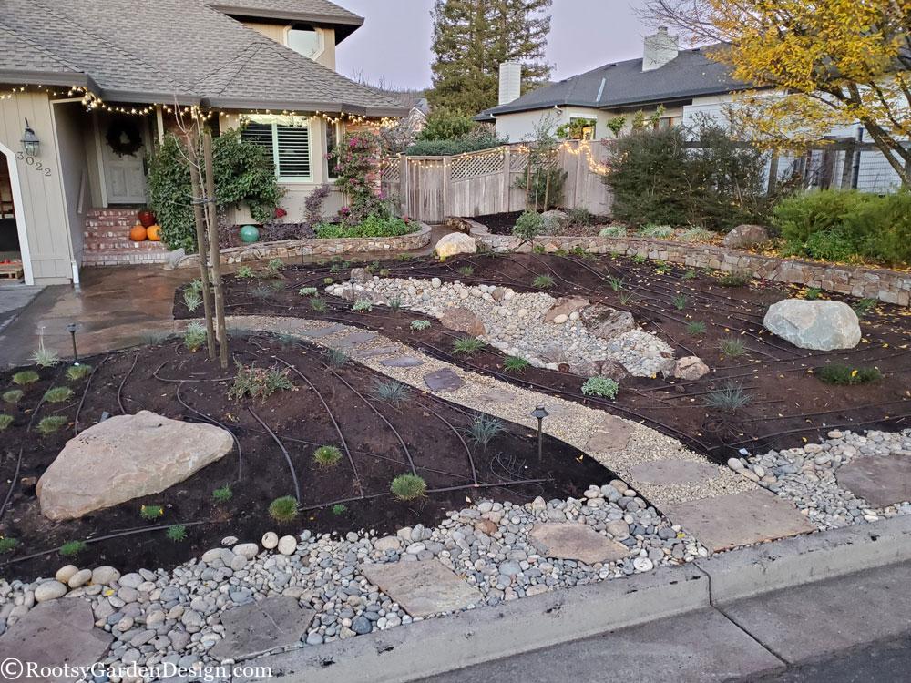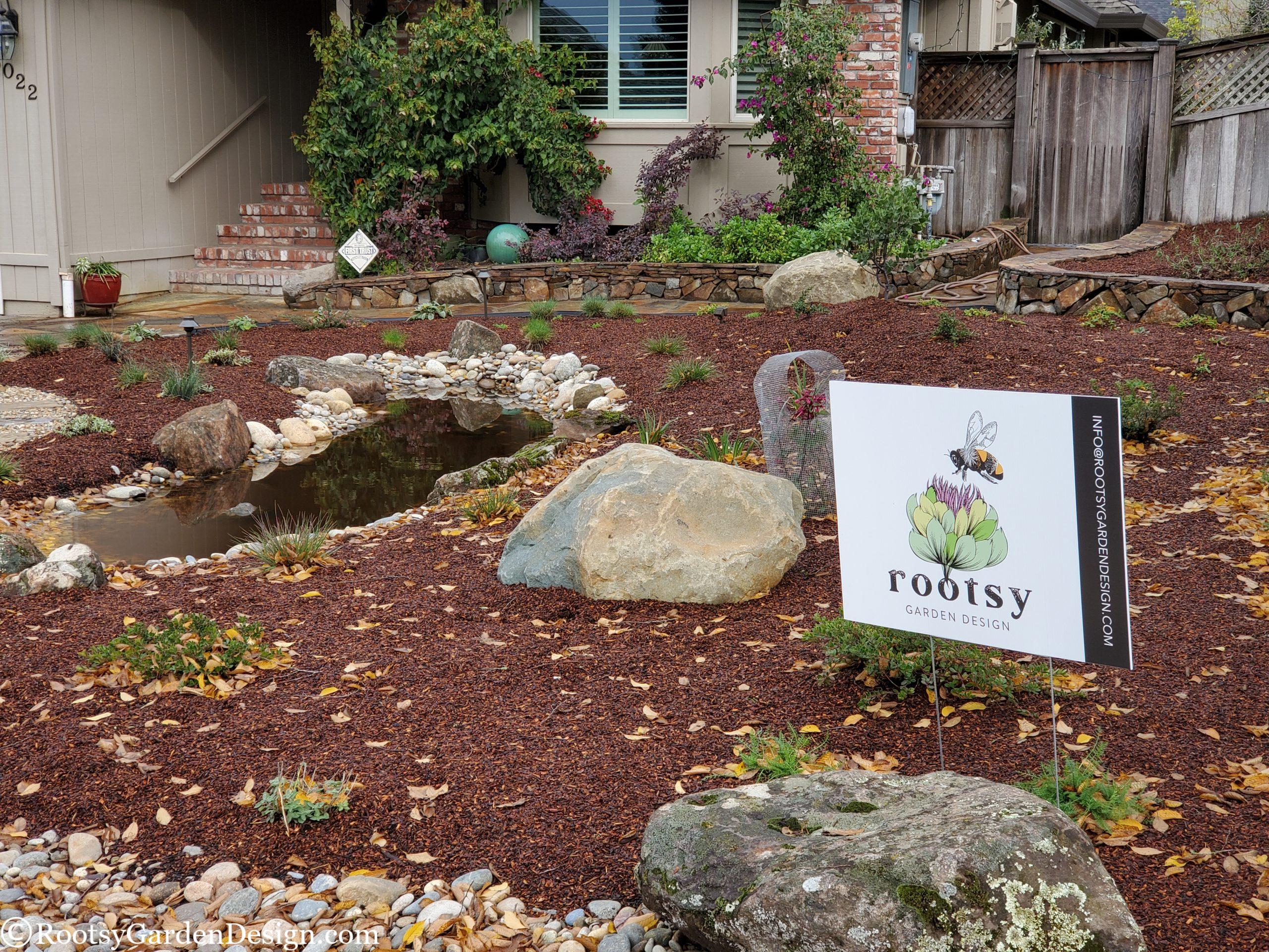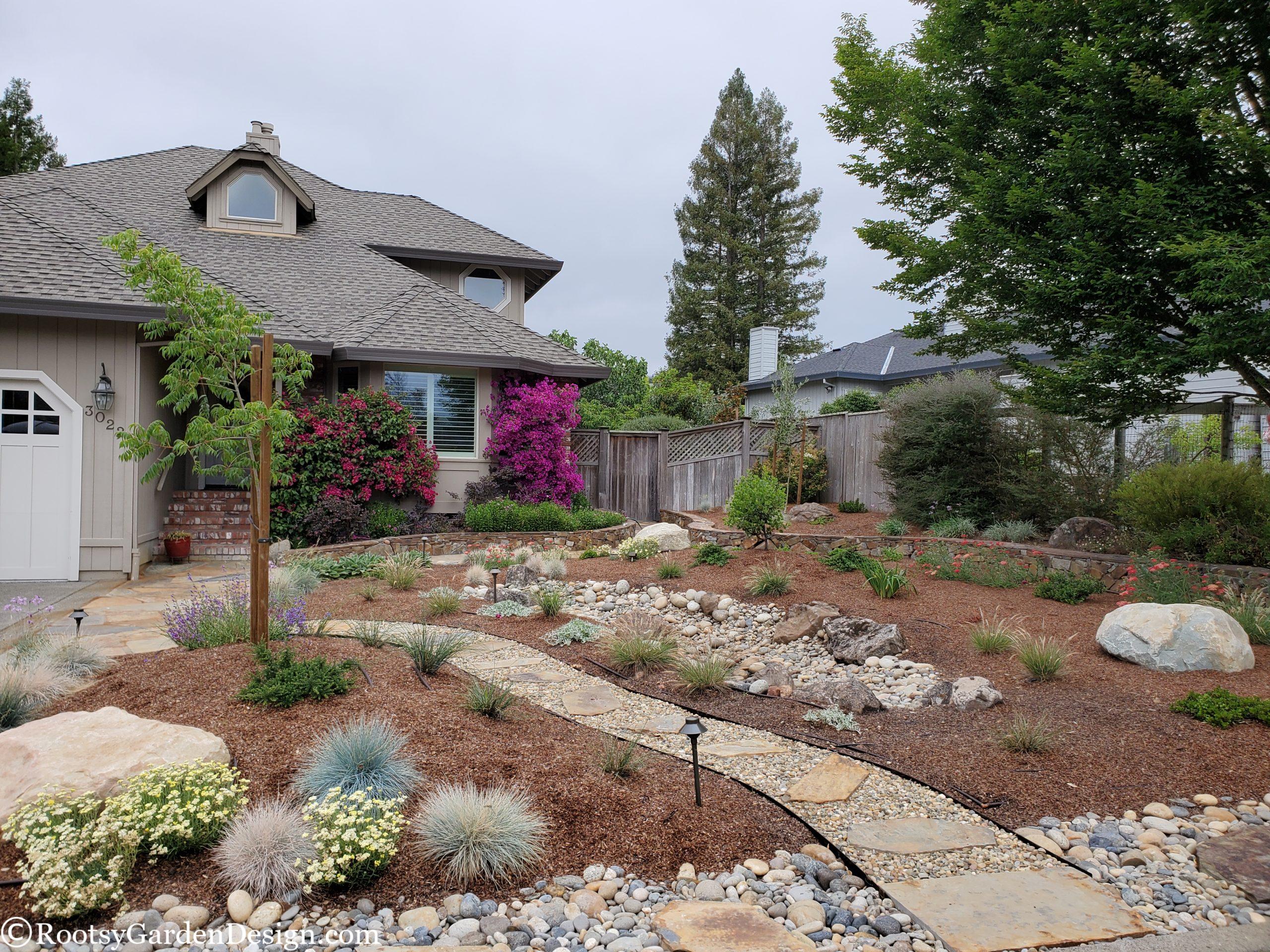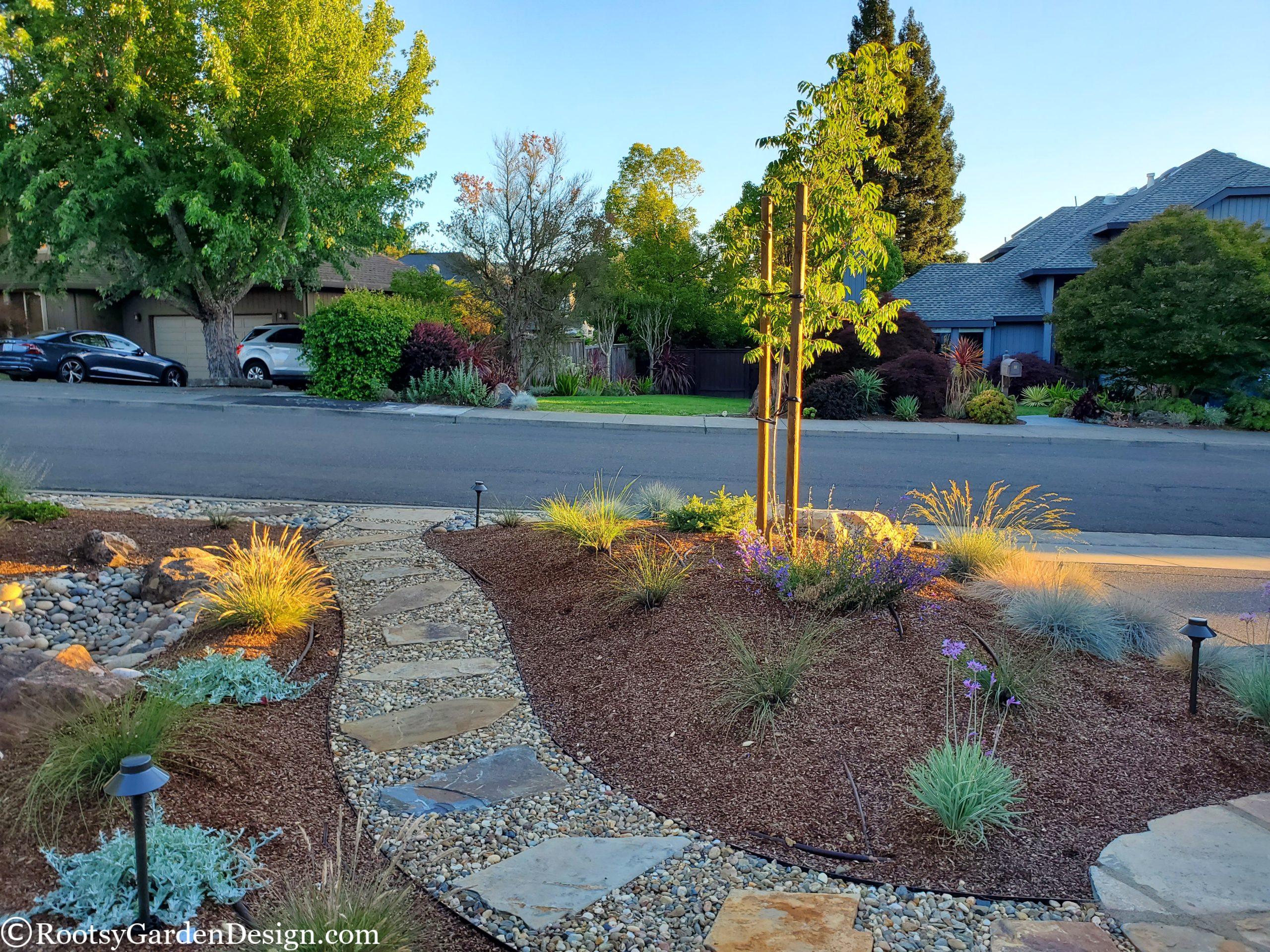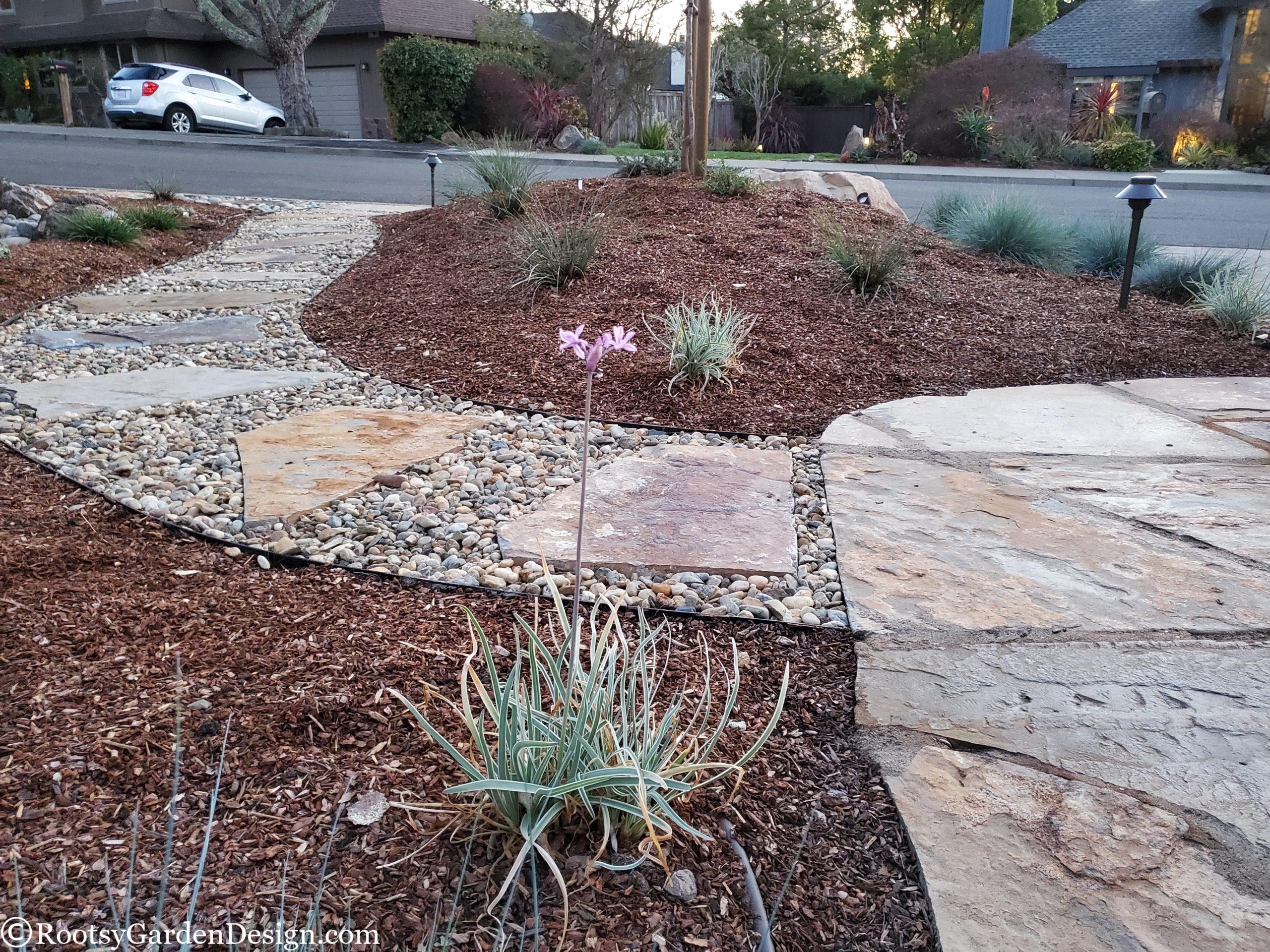 We reached out to Rootsy Garden Design to help us qualify for the “Cash for Grass” Rebate program in our city. Not only did we get the lawn replacement rebate, Rootsy exceeded all expectations and created a beautiful and dynamic front yard garden space we love. Our designer, Laura, transformed our flat front lawn into an imaginative drought tolerant design involving native plants, a rainwater swale, elevated berms, artistically placed boulders and flagstone pathways. Laura’s constant communication with the work crew and attention to every detail along the way was exceptional. Since completion, our yard has drawn an enormous amount of positive feedback from neighbors and we’ve even had people knocking on our front door to get the designer’s contact info. It was a great experience working with Rootsy Garden Design.