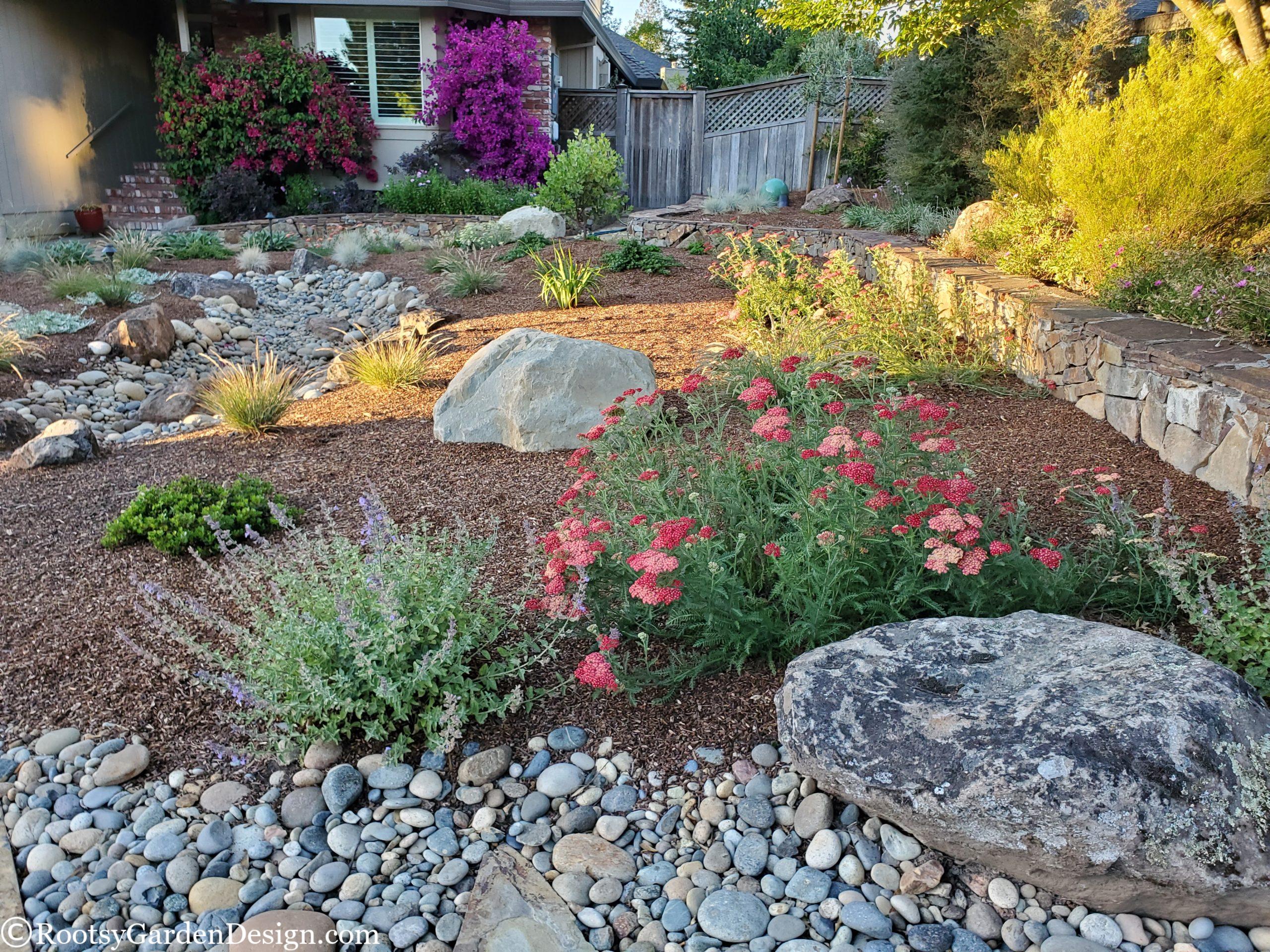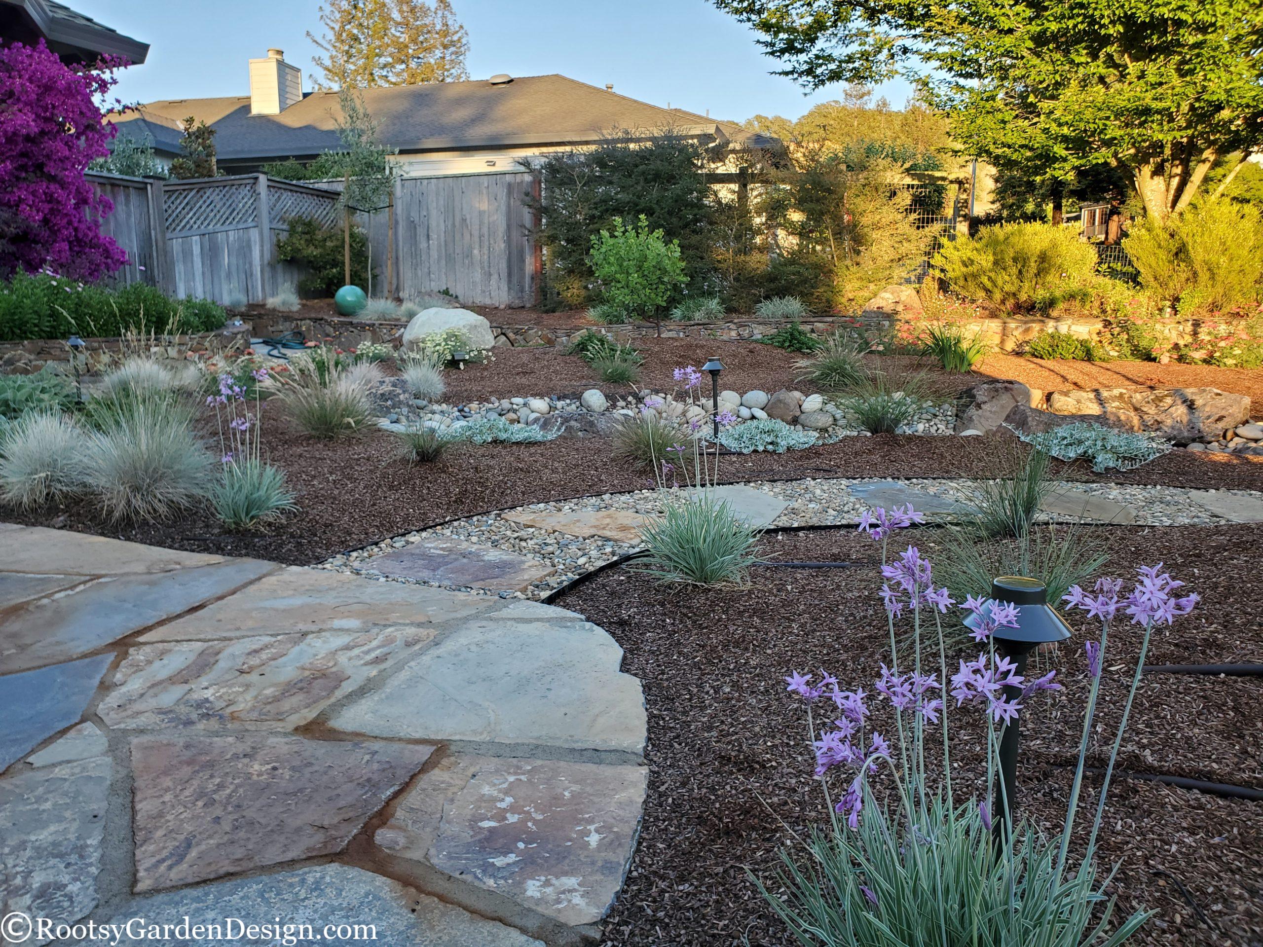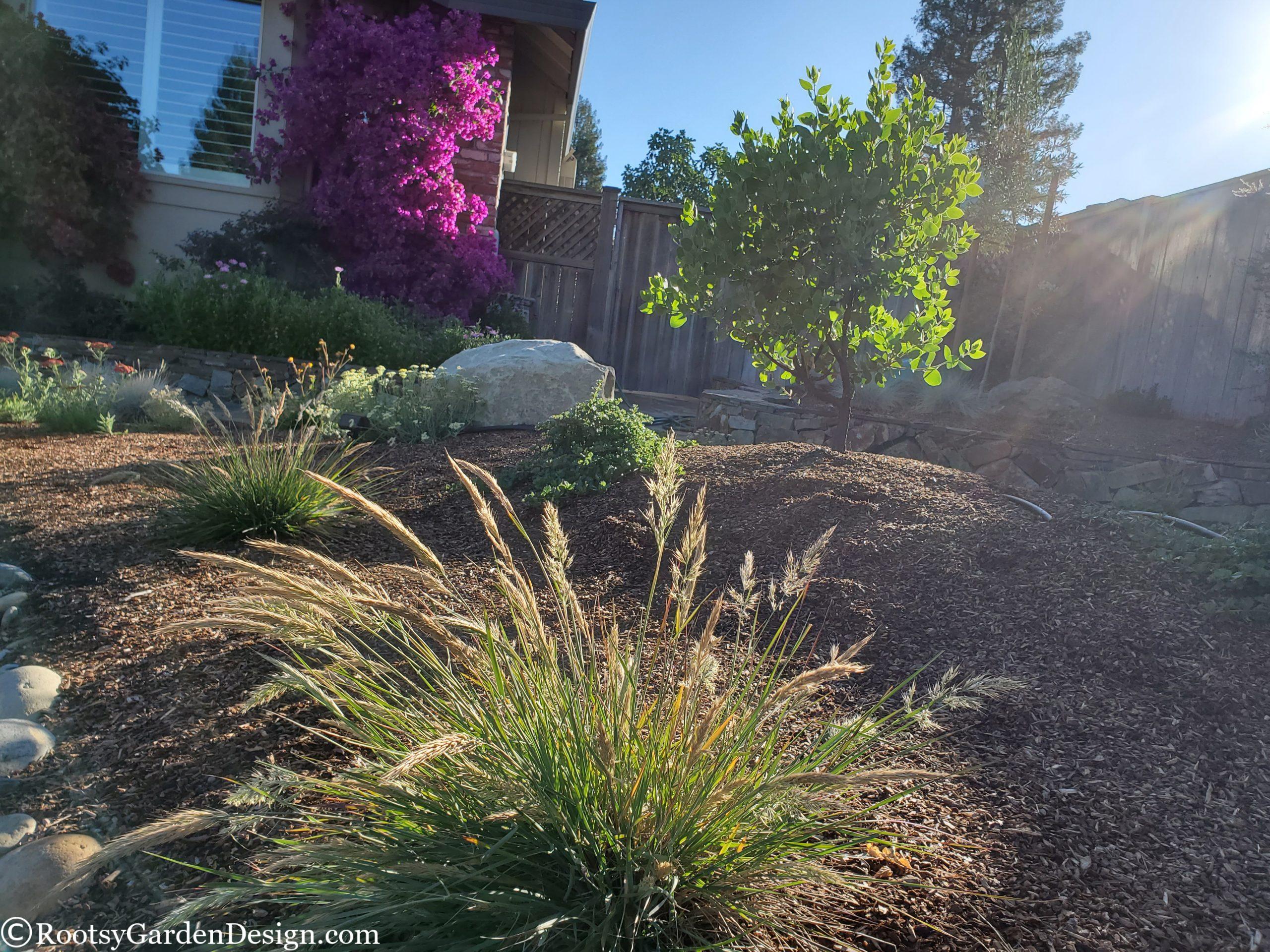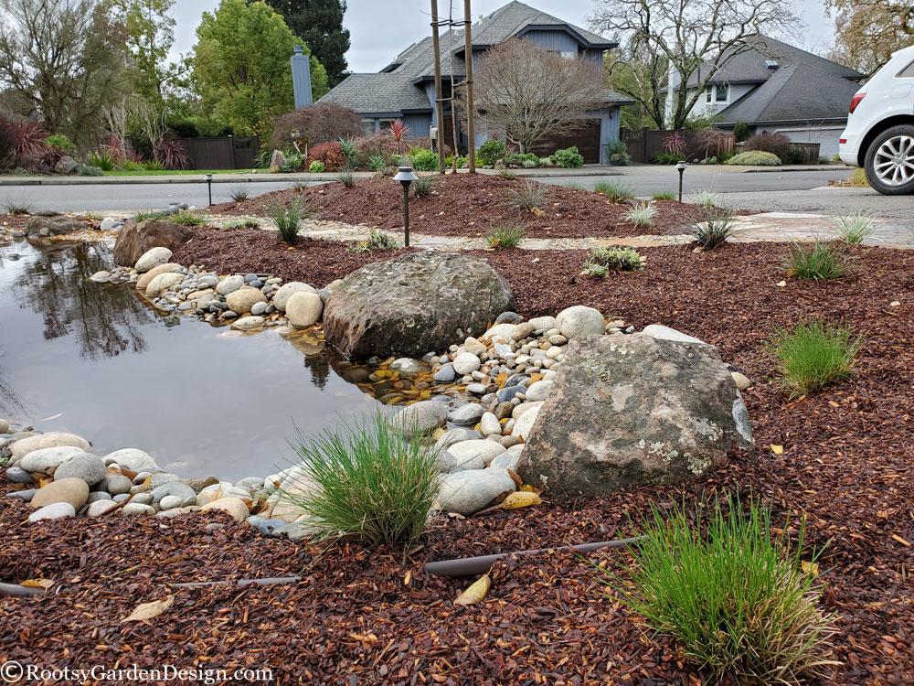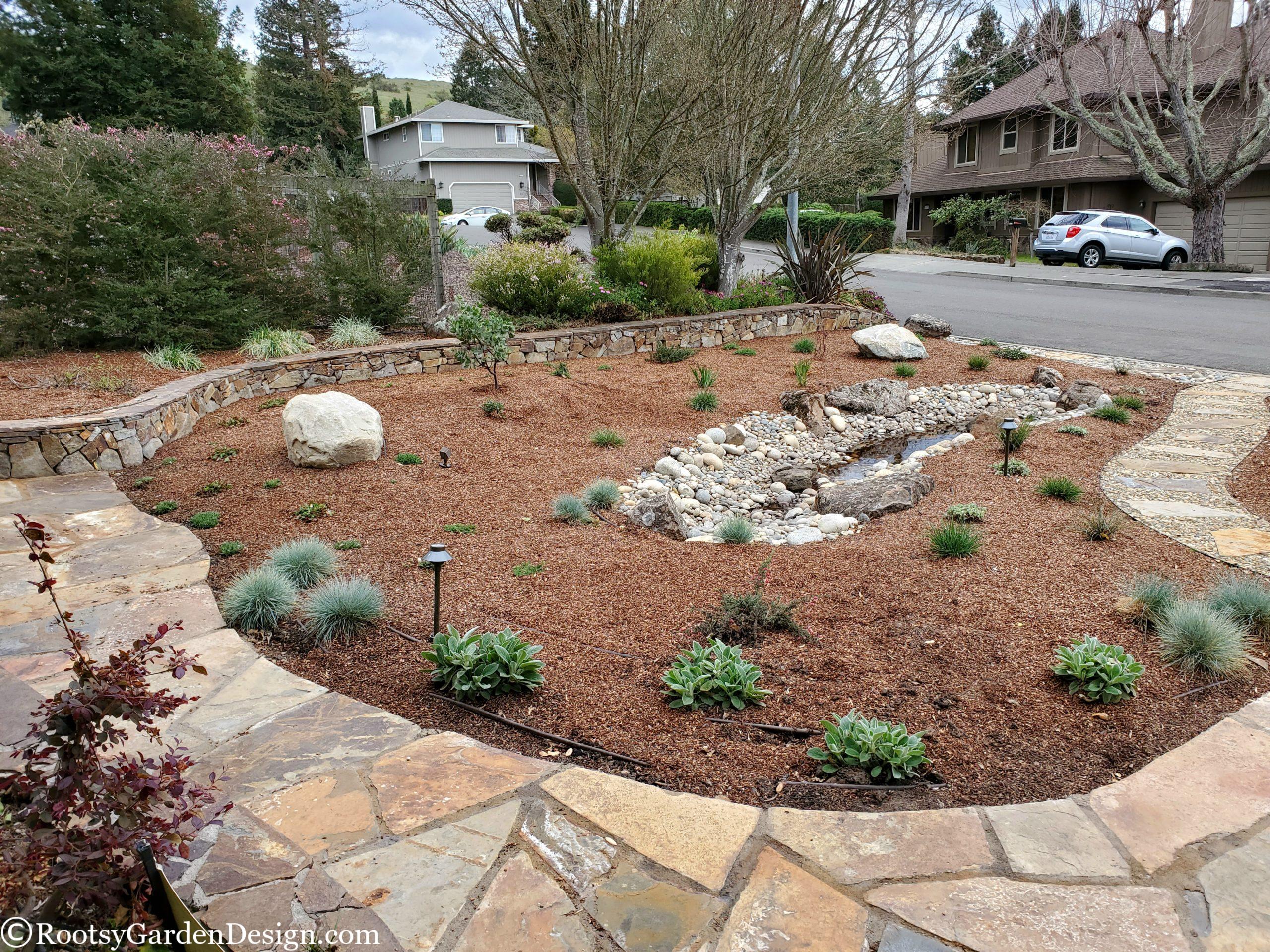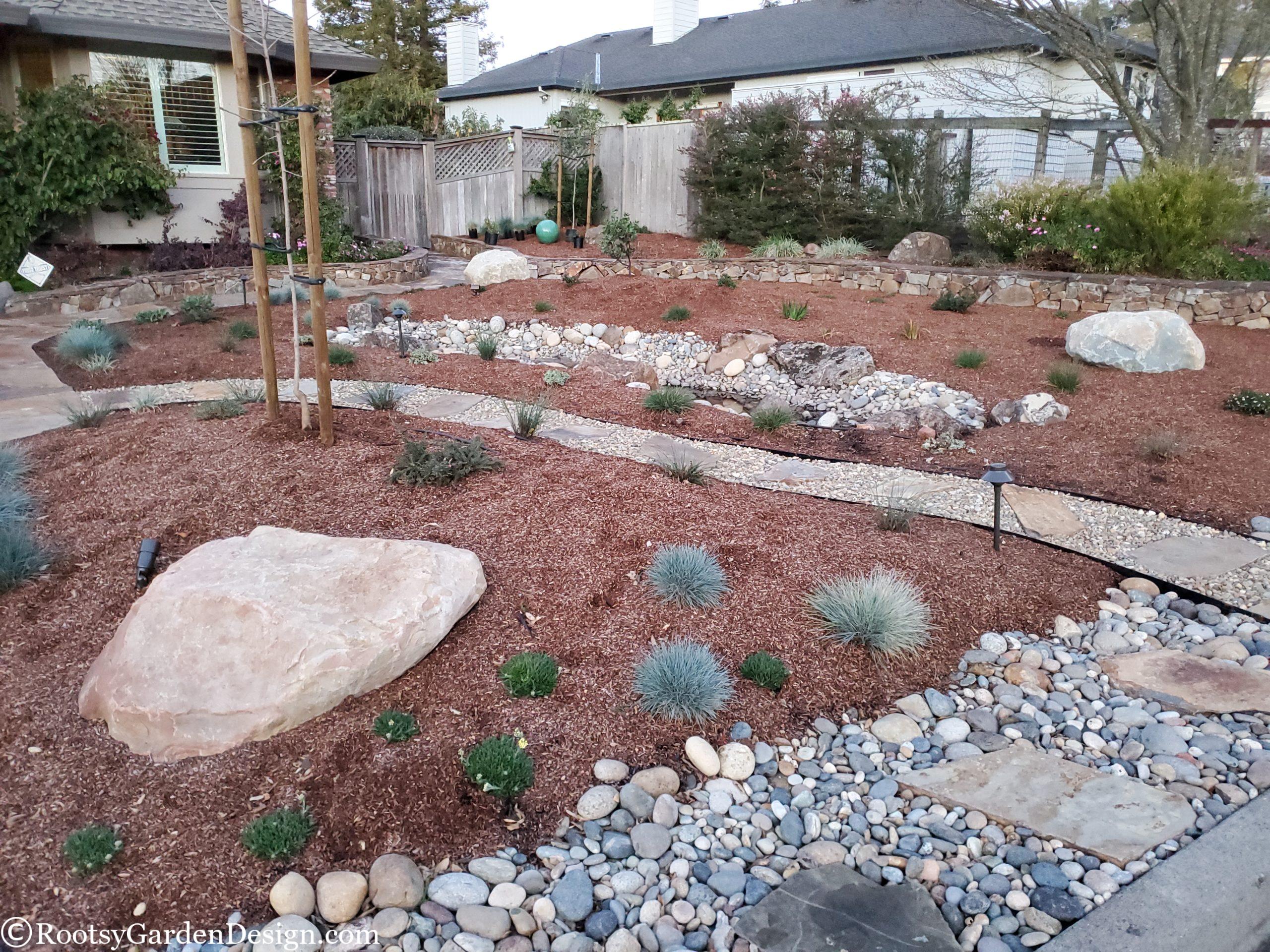 We reached out to Rootsy Garden Design to help us qualify for the “Cash for Grass” Rebate program in our city. Not only did we get the lawn replacement rebate, Rootsy exceeded all expectations and created a beautiful and dynamic front yard garden space we love. Our designer, Laura, transformed our flat front lawn into an imaginative drought tolerant design involving native plants, a rainwater swale, elevated berms, artistically placed boulders and flagstone pathways. Laura’s constant communication with the work crew and attention to every detail along the way was exceptional. Since completion, our yard has drawn an enormous amount of positive feedback from neighbors and we’ve even had people knocking on our front door to get the designer’s contact info. It was a great experience working with Rootsy Garden Design.
