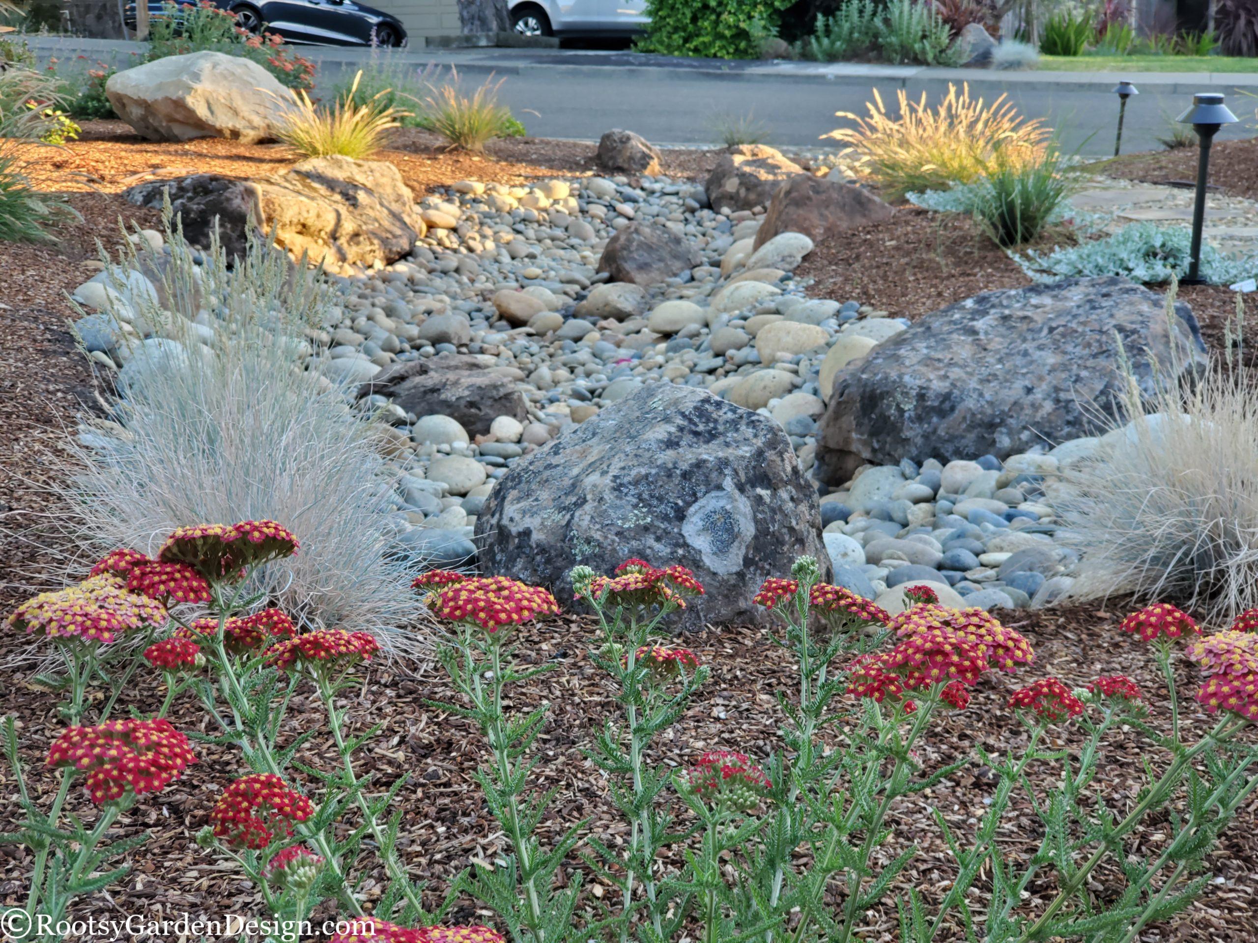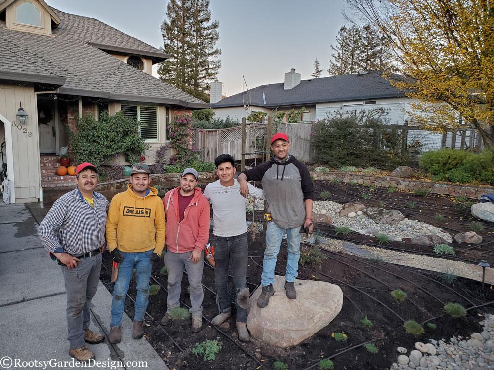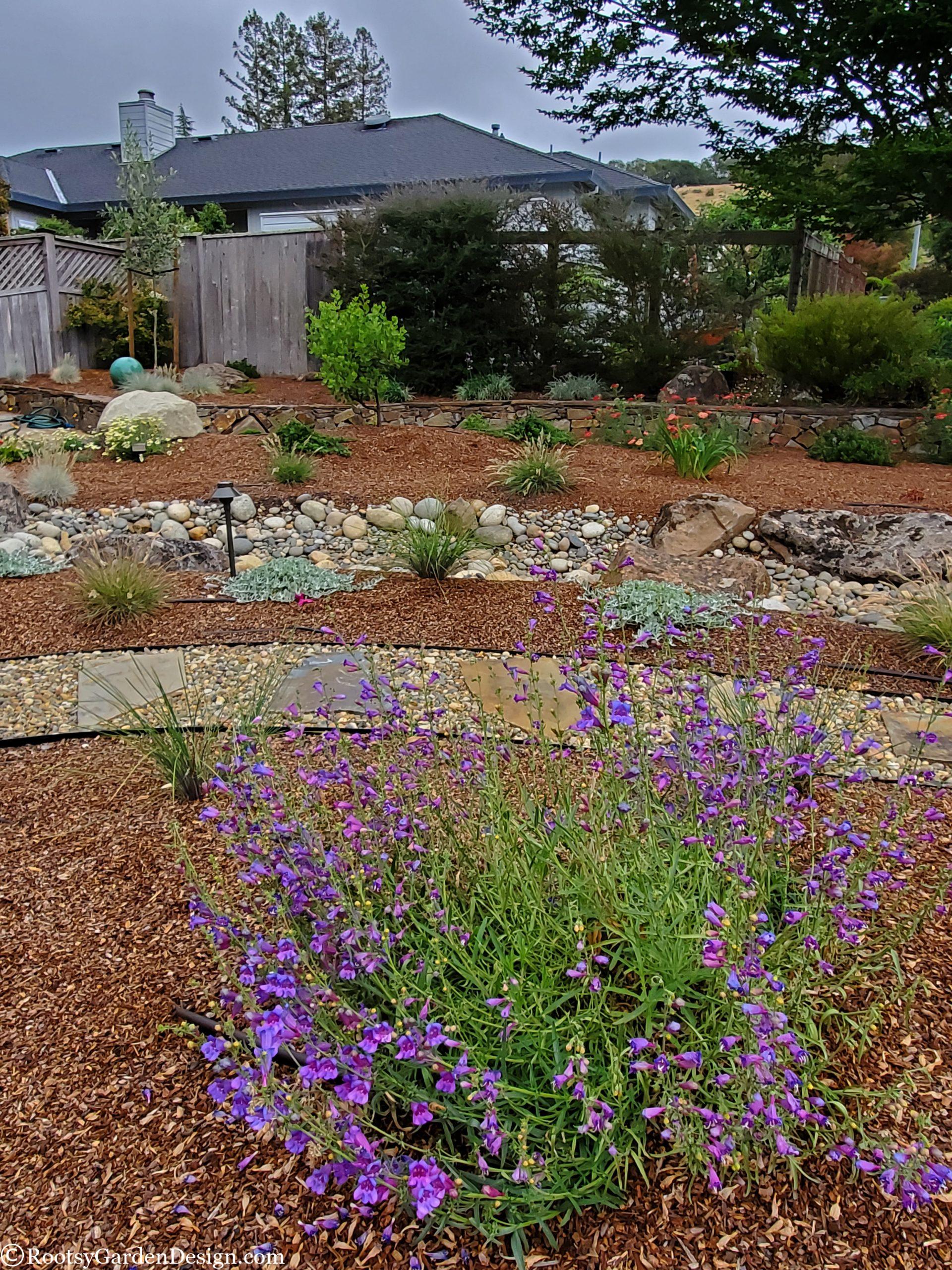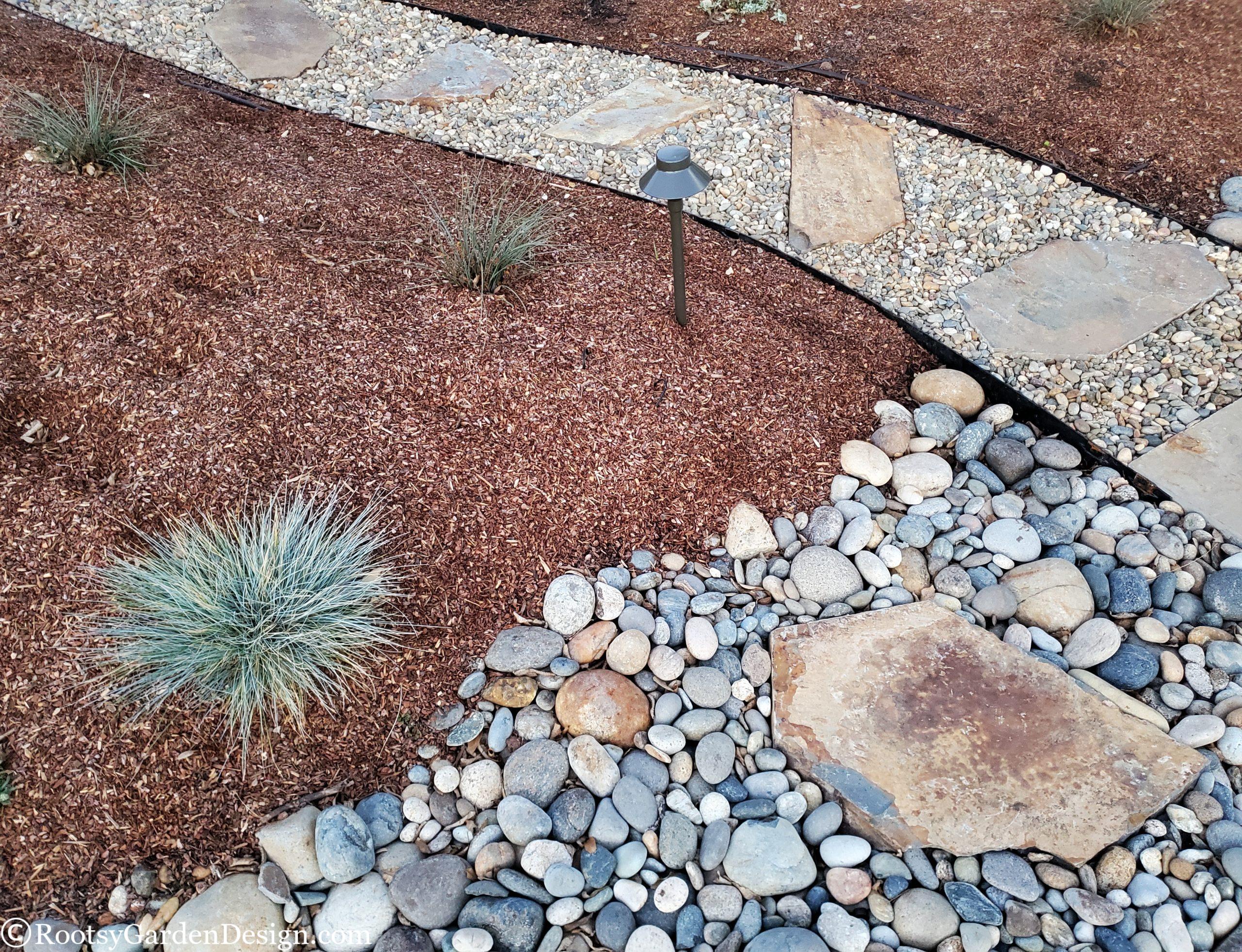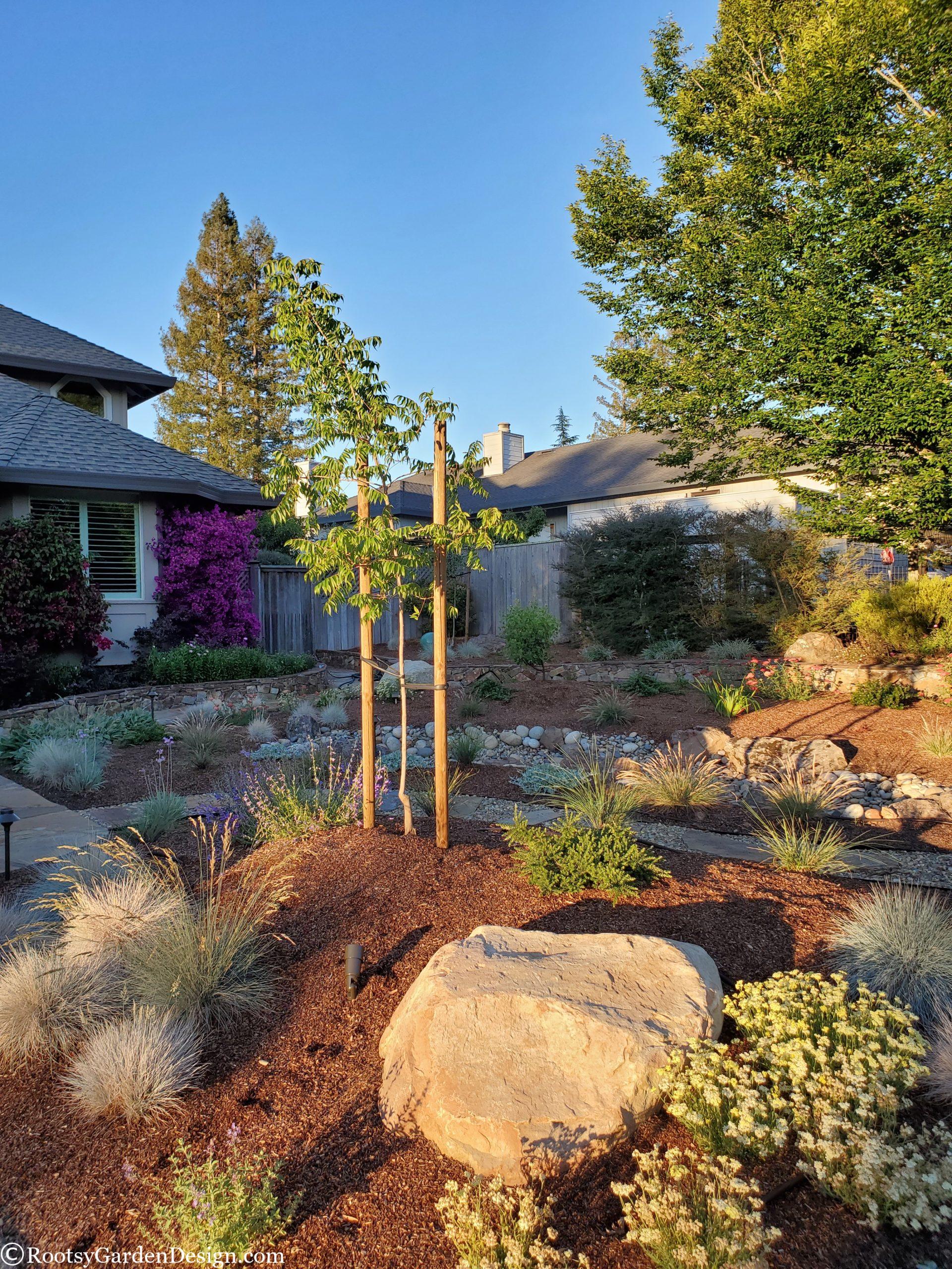 We reached out to Rootsy Garden Design to help us qualify for the “Cash for Grass” Rebate program in our city. Not only did we get the lawn replacement rebate, Rootsy exceeded all expectations and created a beautiful and dynamic front yard garden space we love. Our designer, Laura, transformed our flat front lawn into an imaginative drought tolerant design involving native plants, a rainwater swale, elevated berms, artistically placed boulders and flagstone pathways. Laura’s constant communication with the work crew and attention to every detail along the way was exceptional. Since completion, our yard has drawn an enormous amount of positive feedback from neighbors and we’ve even had people knocking on our front door to get the designer’s contact info. It was a great experience working with Rootsy Garden Design.