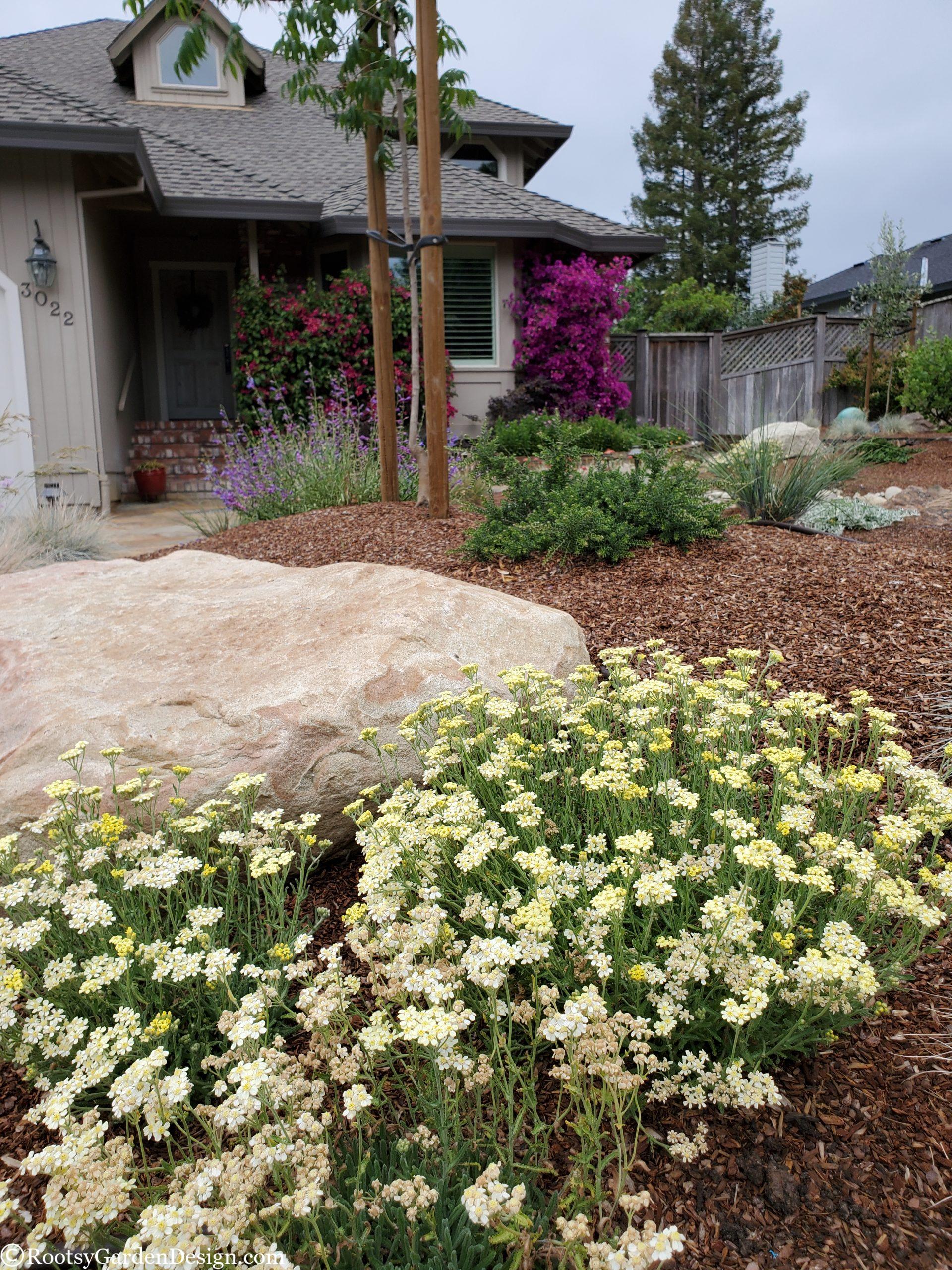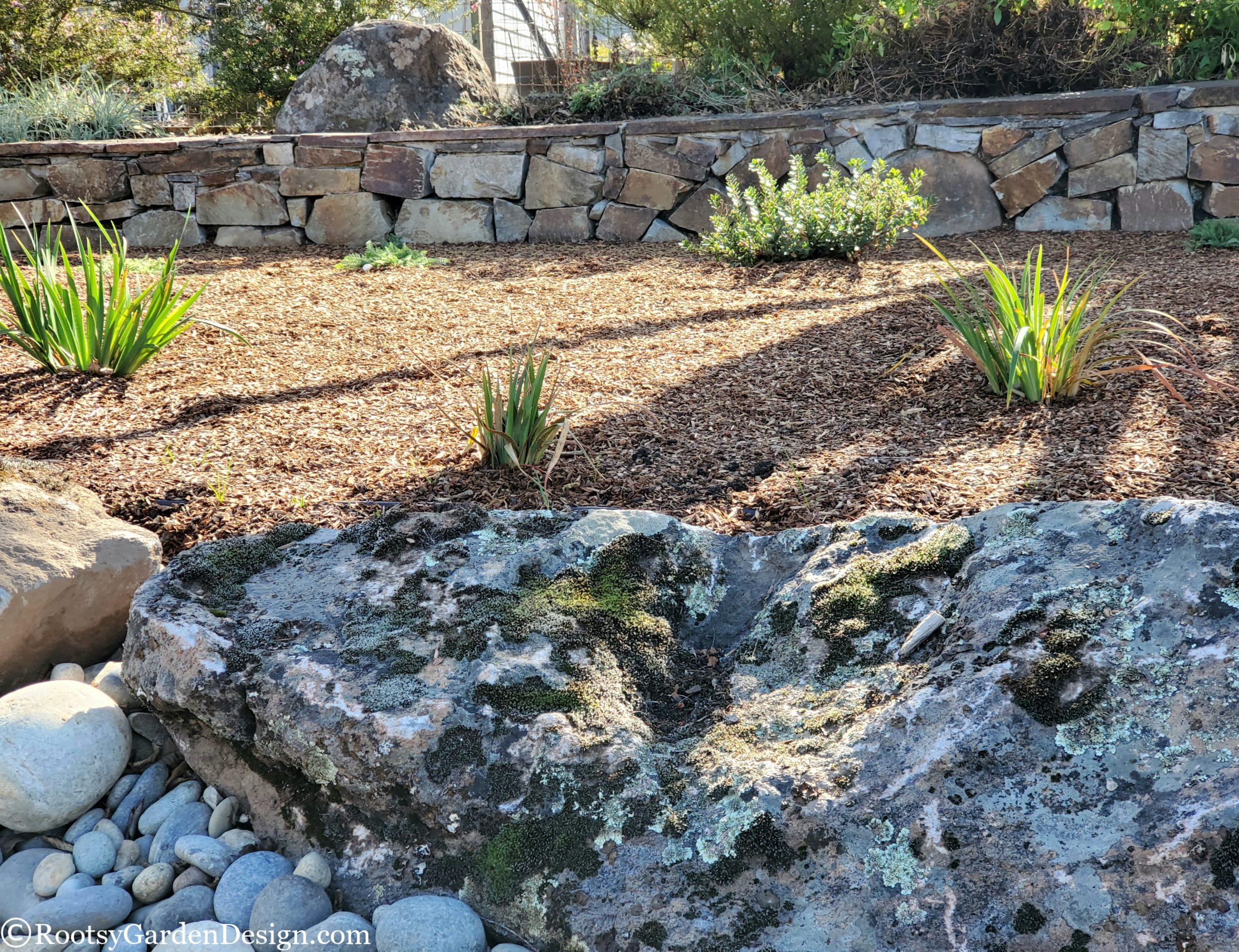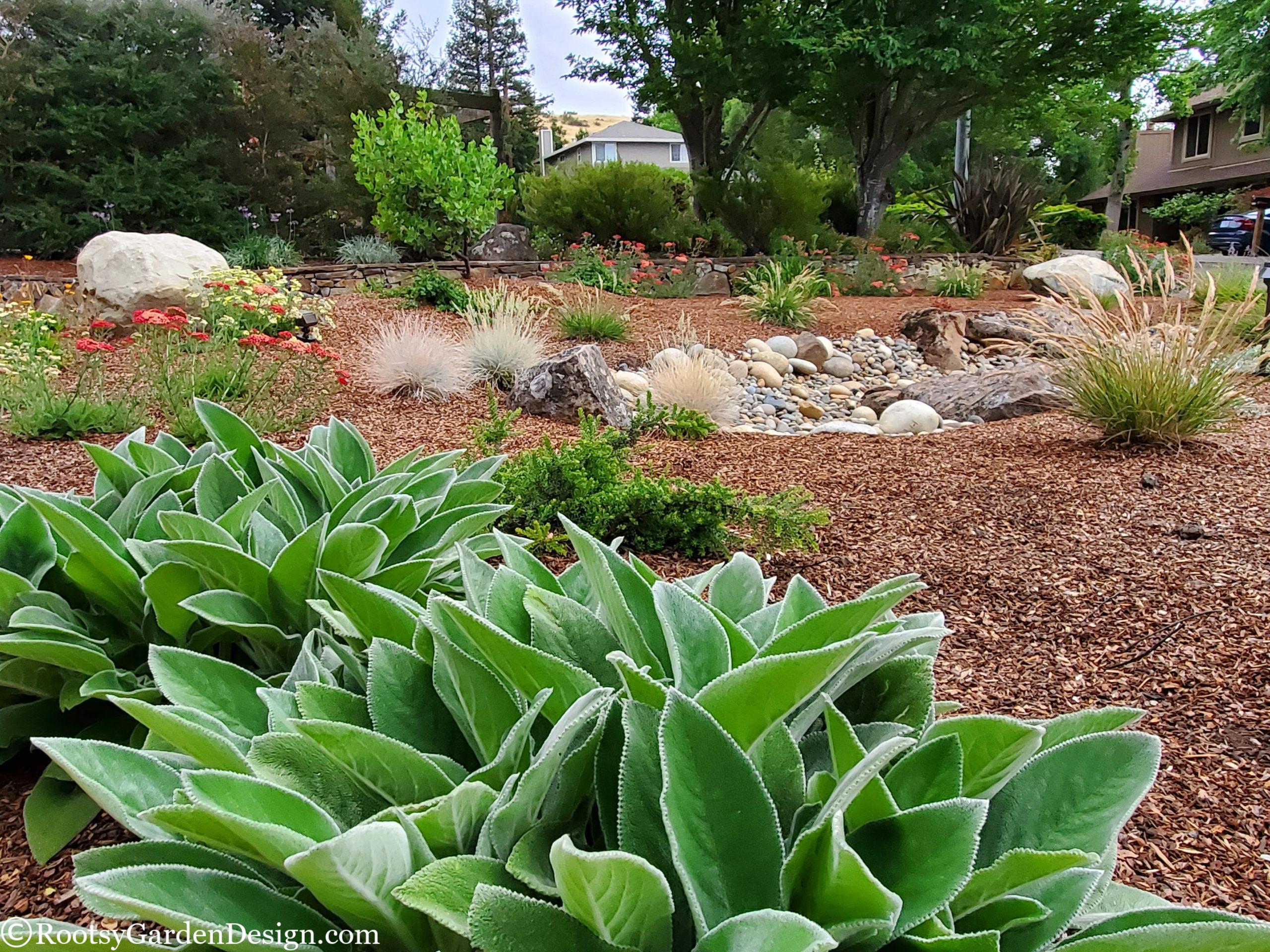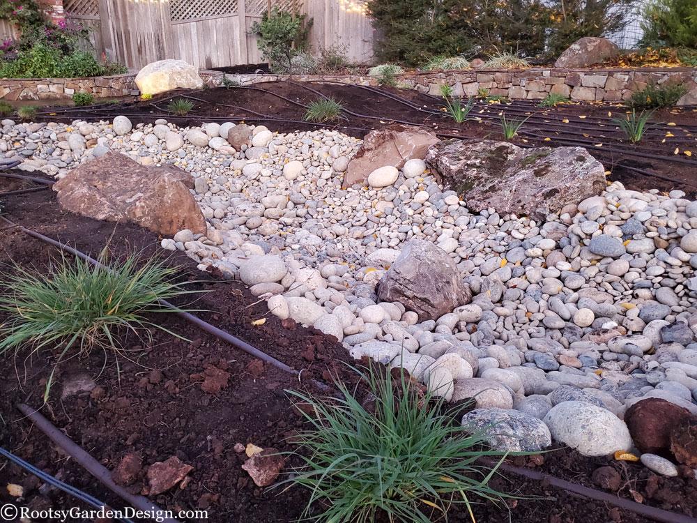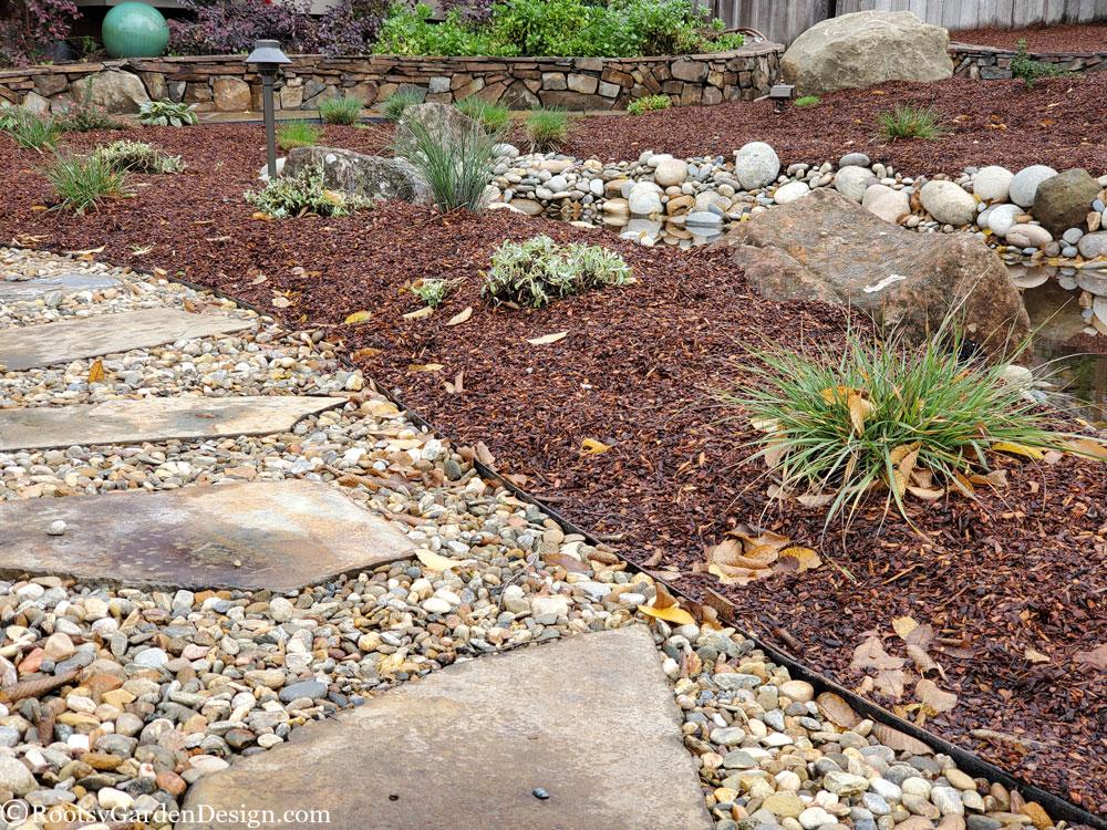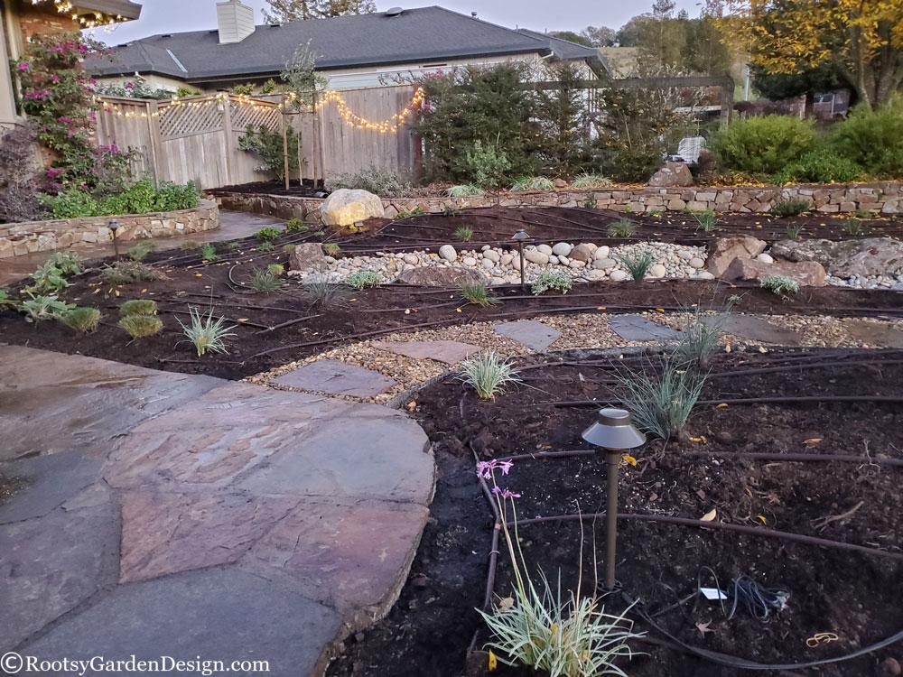 We reached out to Rootsy Garden Design to help us qualify for the “Cash for Grass” Rebate program in our city. Not only did we get the lawn replacement rebate, Rootsy exceeded all expectations and created a beautiful and dynamic front yard garden space we love. Our designer, Laura, transformed our flat front lawn into an imaginative drought tolerant design involving native plants, a rainwater swale, elevated berms, artistically placed boulders and flagstone pathways. Laura’s constant communication with the work crew and attention to every detail along the way was exceptional. Since completion, our yard has drawn an enormous amount of positive feedback from neighbors and we’ve even had people knocking on our front door to get the designer’s contact info. It was a great experience working with Rootsy Garden Design.