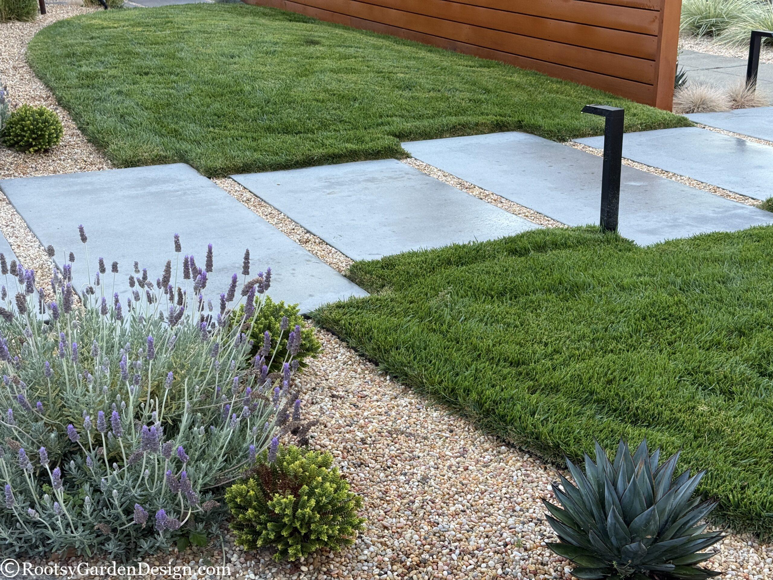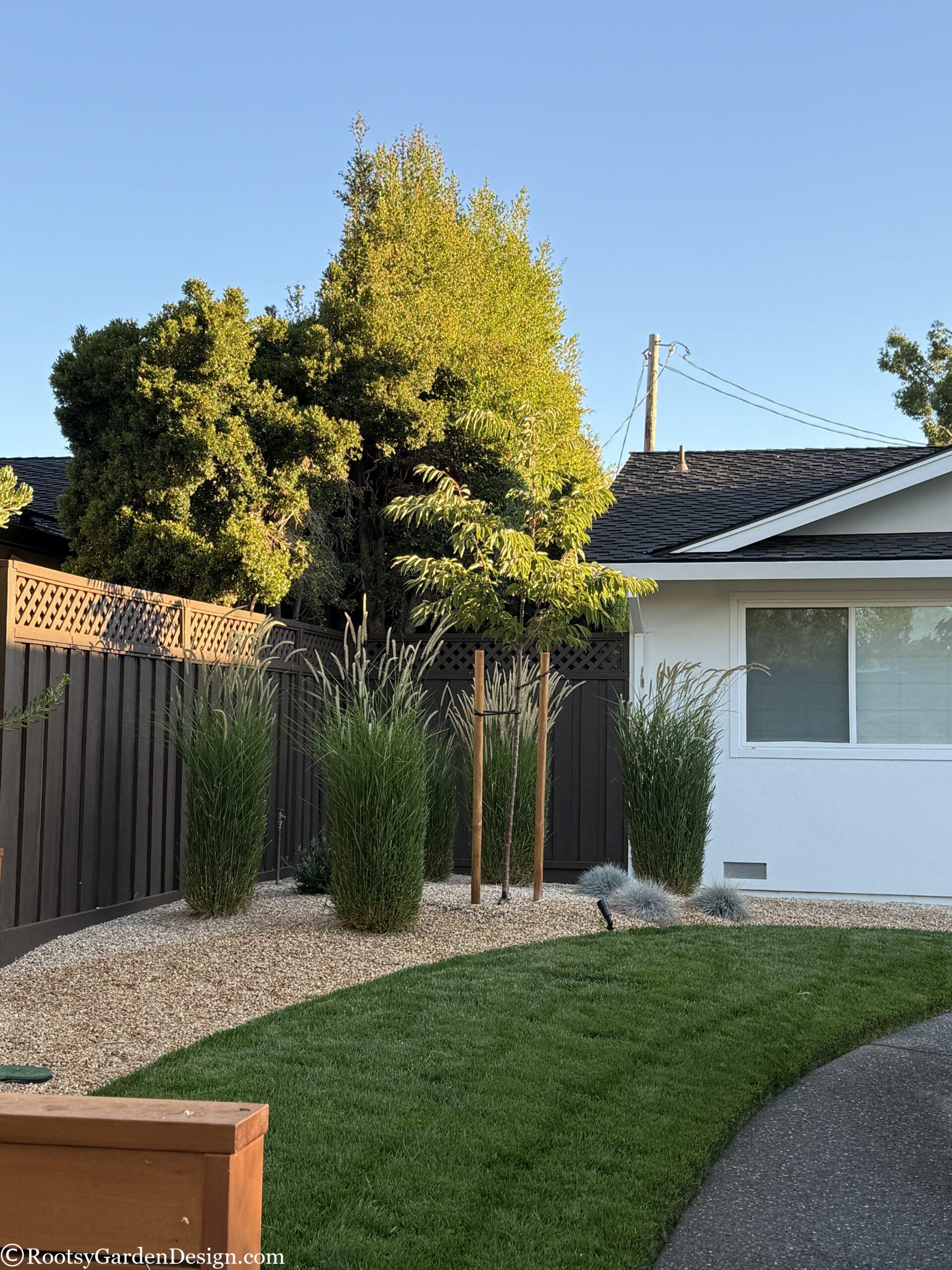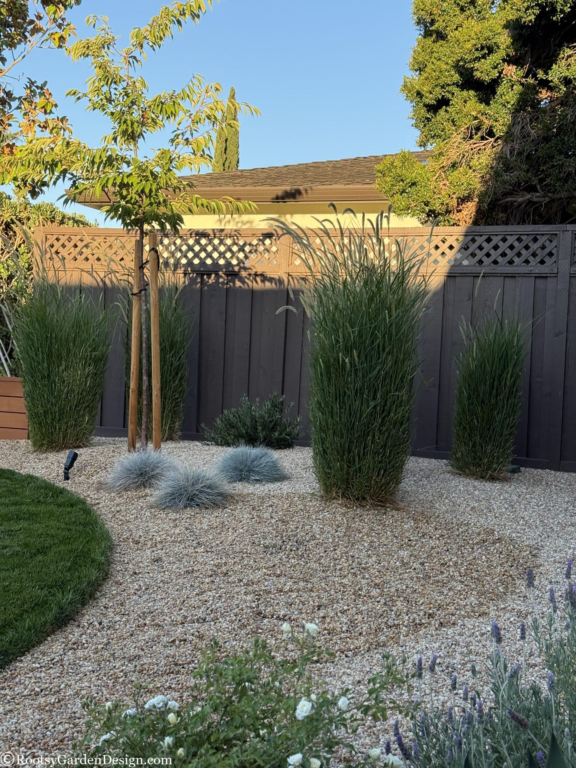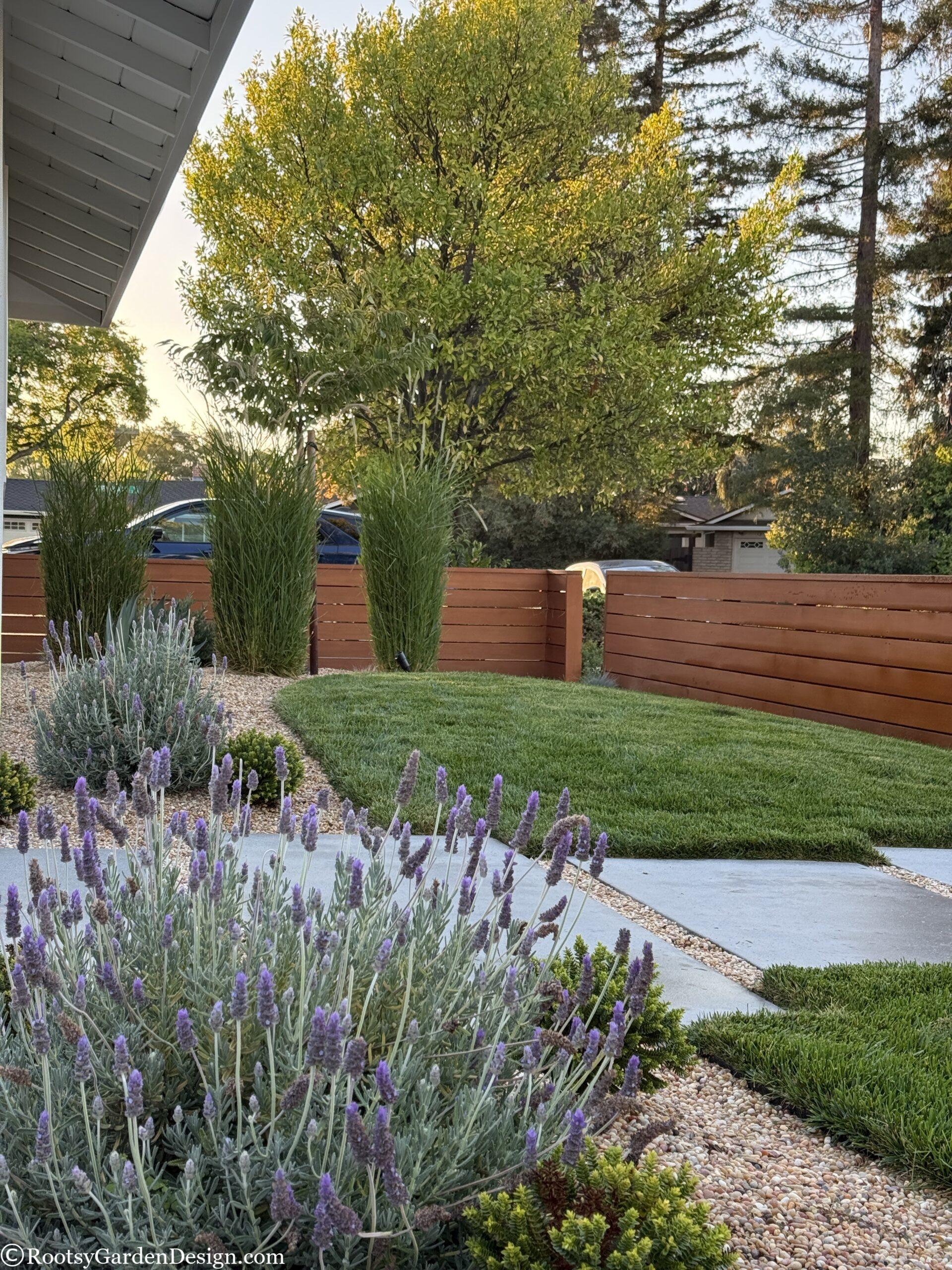 And, she confidently executed that! What we are enjoying now is a timeless design – simple and elegant, yet stunning! Laura was able to creatively balance various elements in the design – a low wooden fence all around, concrete stepping stones leading up to our doorway ,turf and gravel, and a plant palette of my choices.