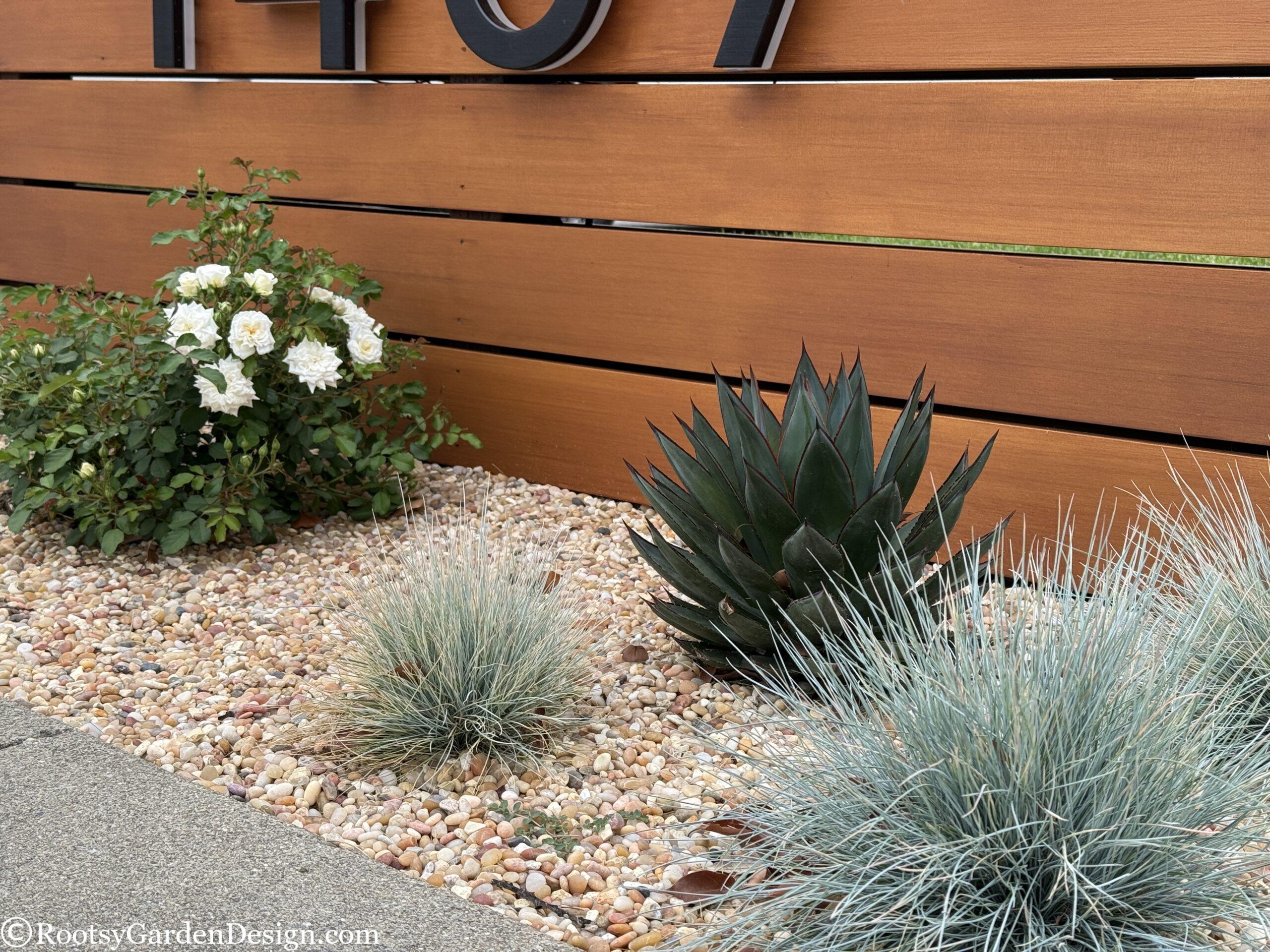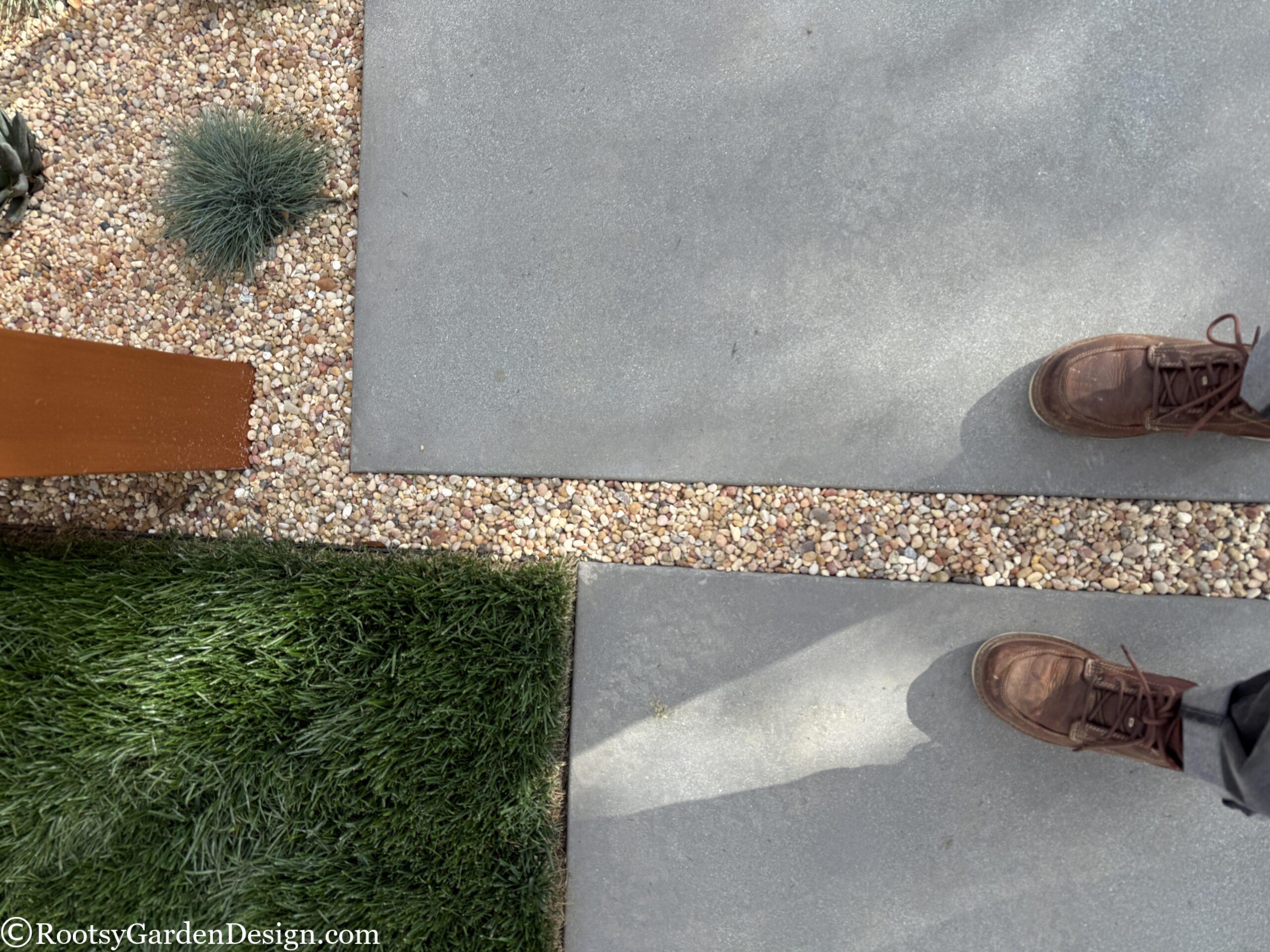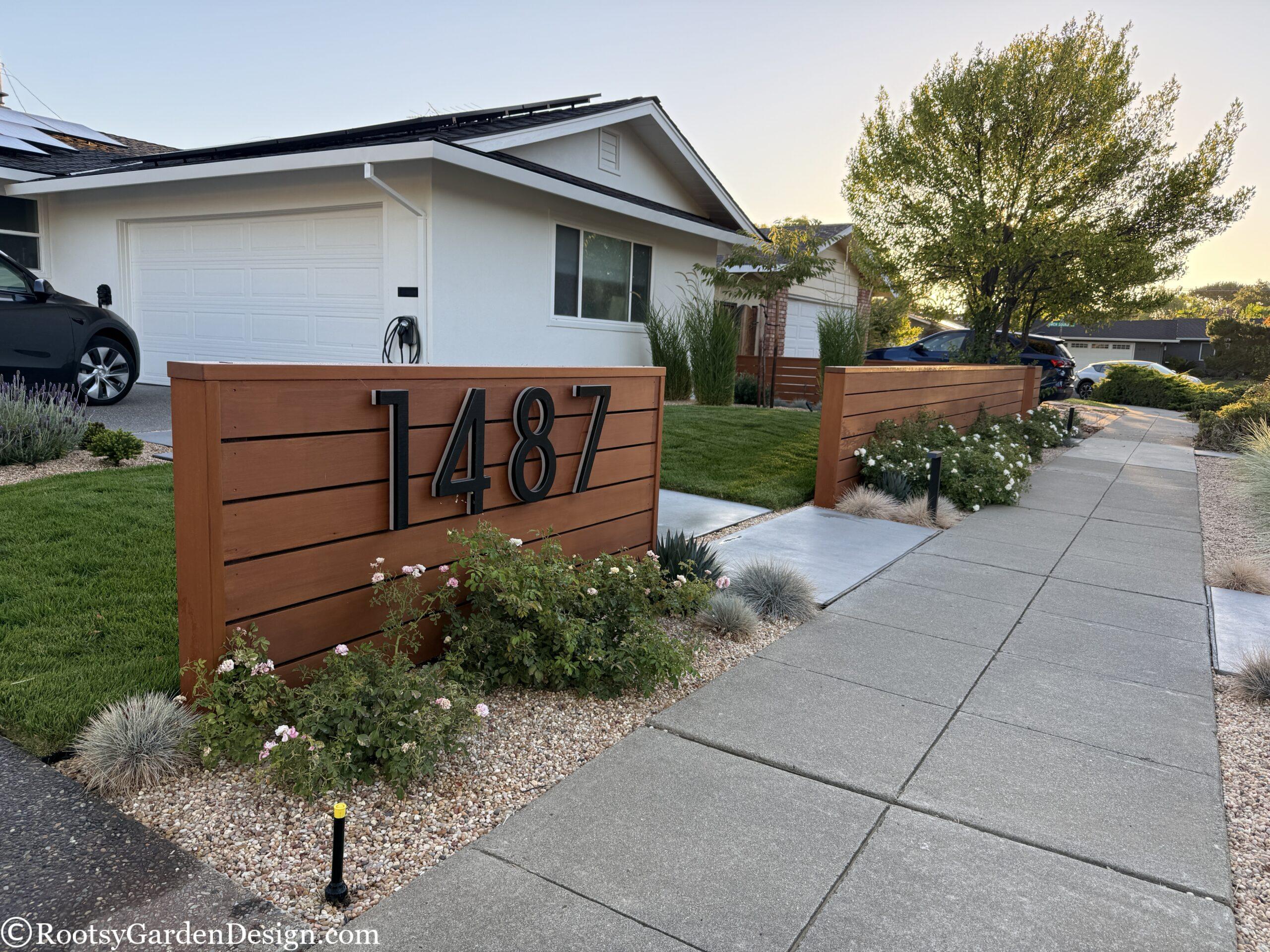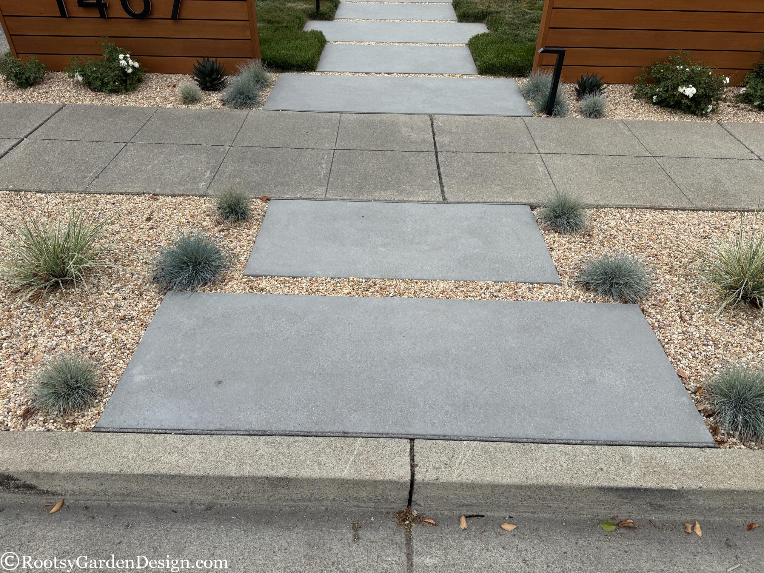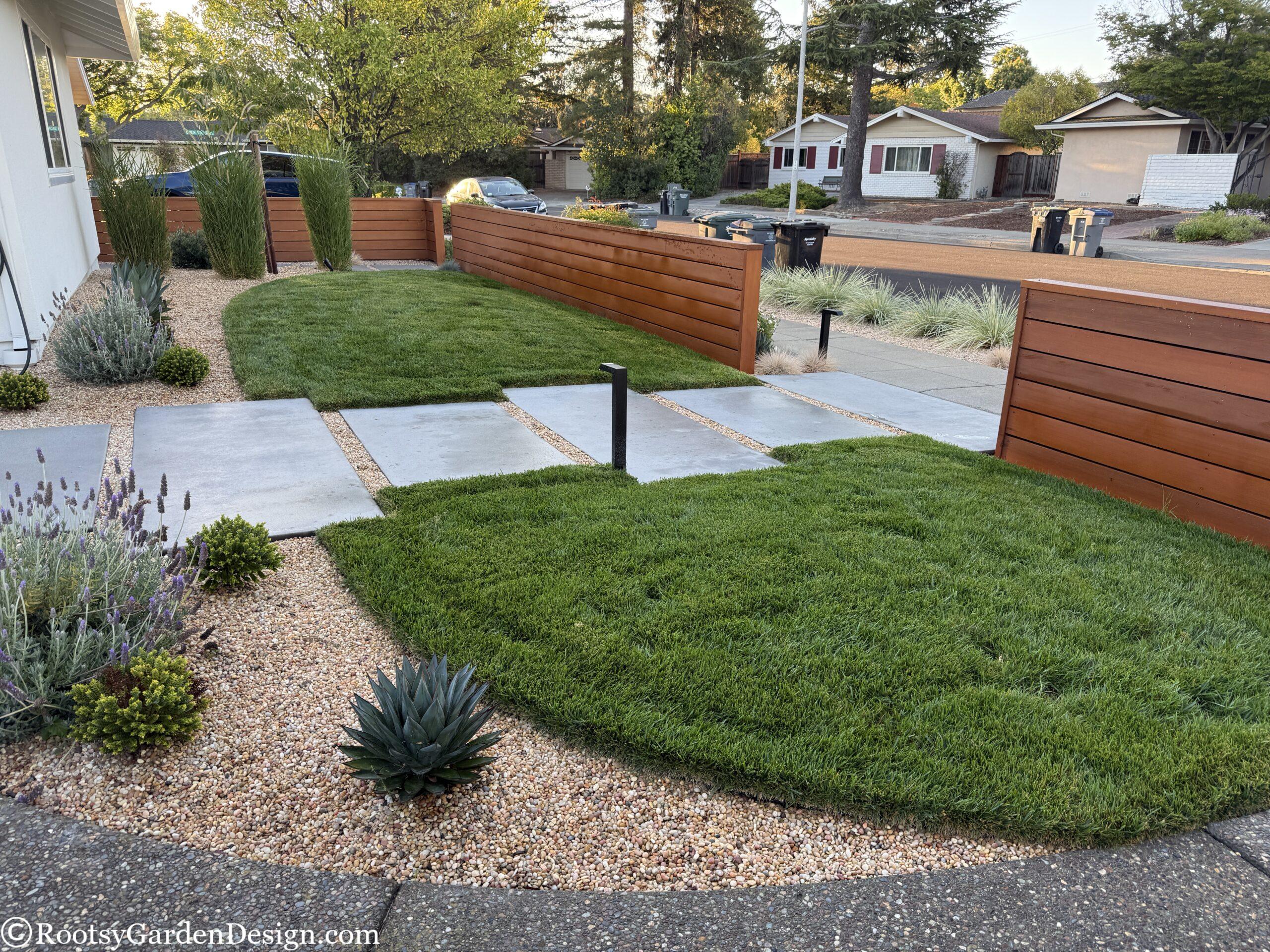 And, she confidently executed that! What we are enjoying now is a timeless design – simple and elegant, yet stunning! Laura was able to creatively balance various elements in the design – a low wooden fence all around, concrete stepping stones leading up to our doorway ,turf and gravel, and a plant palette of my choices.