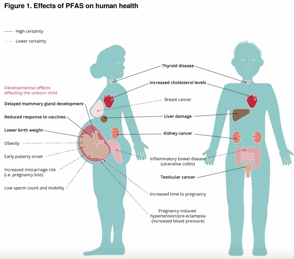 PFAS (per- and poly-fluoroalkyl substances): These are linked to various cancers and diseases in children and adults. PFAS are known as “Forever Chemicals” because they don’t metabolize or decompose in nature – and persist in the body and environment. Detectable levels are already being found in rain, food, drinking water, waterways, etc. (Figure 1) |