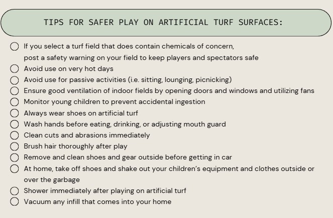 - Take precautions when interacting with Artificial Turf. The Mount Sinai Children’s Environmental Health Center recommends the following tips:
